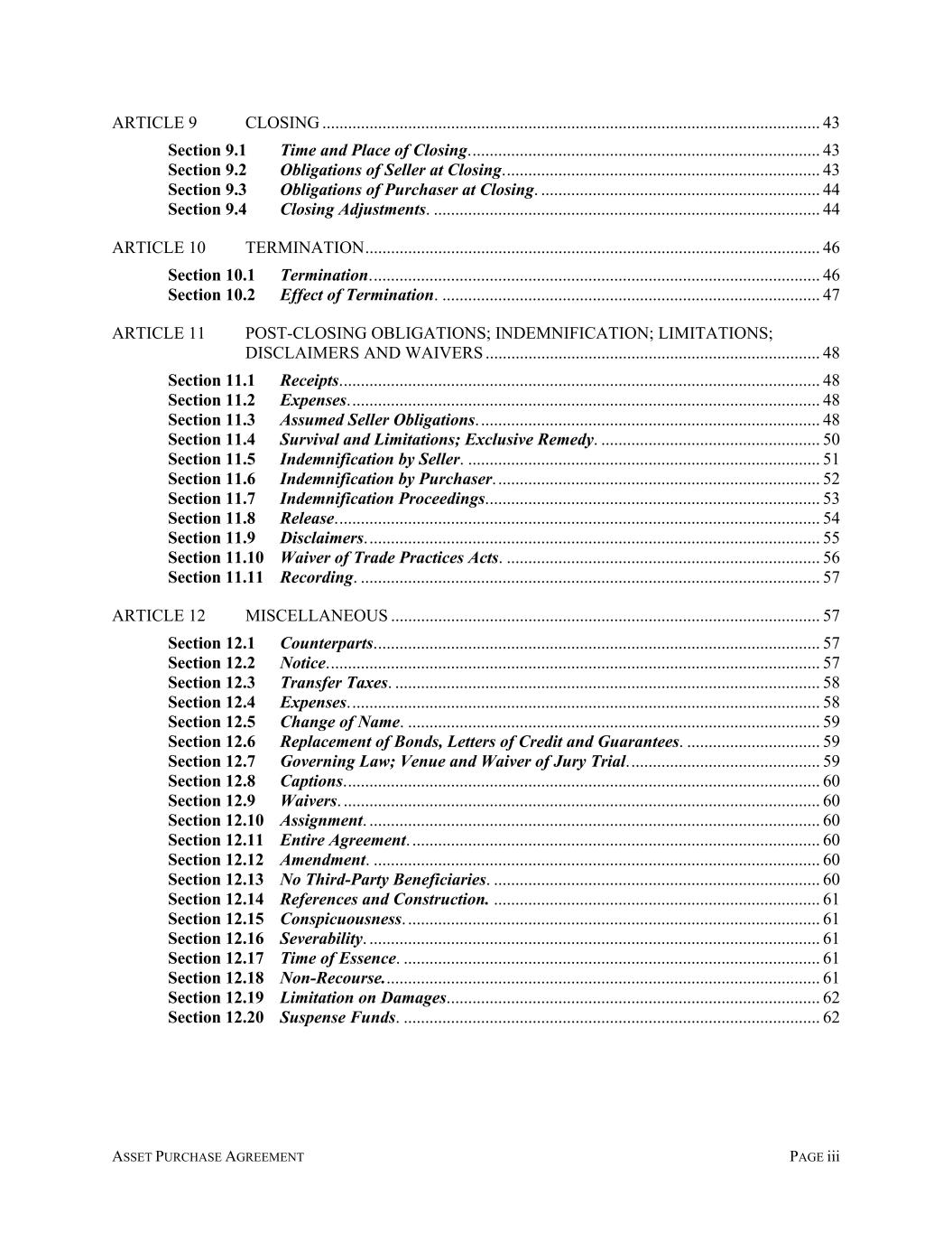 ASSET PURCHASE AGREEMENT PAGE iii ARTICLE 9 CLOSING .................................................................................................................... 43 Section 9.1 Time and Place of Closing. ................................................................................. 43 Section 9.2 Obligations of Seller at Closing. ......................................................................... 43 Section 9.3 Obligations of Purchaser at Closing. ................................................................. 44 Section 9.4 Closing Adjustments. .......................................................................................... 44 ARTICLE 10 TERMINATION .......................................................................................................... 46 Section 10.1 Termination. ........................................................................................................ 46 Section 10.2 Effect of Termination. ........................................................................................ 47 ARTICLE 11 POST-CLOSING OBLIGATIONS; INDEMNIFICATION; LIMITATIONS; DISCLAIMERS AND WAIVERS .............................................................................. 48 Section 11.1 Receipts. ............................................................................................................... 48 Section 11.2 Expenses. ............................................................................................................. 48 Section 11.3 Assumed Seller Obligations. ............................................................................... 48 Section 11.4 Survival and Limitations; Exclusive Remedy. ................................................... 50 Section 11.5 Indemnification by Seller. .................................................................................. 51 Section 11.6 Indemnification by Purchaser. ........................................................................... 52 Section 11.7 Indemnification Proceedings. ............................................................................. 53 Section 11.8 Release. ................................................................................................................ 54 Section 11.9 Disclaimers. ......................................................................................................... 55 Section 11.10 Waiver of Trade Practices Acts. ......................................................................... 56 Section 11.11 Recording. ........................................................................................................... 57 ARTICLE 12 MISCELLANEOUS .................................................................................................... 57 Section 12.1 Counterparts. ....................................................................................................... 57 Section 12.2 Notice. .................................................................................................................. 57 Section 12.3 Transfer Taxes. ................................................................................................... 58 Section 12.4 Expenses. ............................................................................................................. 58 Section 12.5 Change of Name. ................................................................................................ 59 Section 12.6 Replacement of Bonds, Letters of Credit and Guarantees. ............................... 59 Section 12.7 Governing Law; Venue and Waiver of Jury Trial. ............................................ 59 Section 12.8 Captions. .............................................................................................................. 60 Section 12.9 Waivers. ............................................................................................................... 60 Section 12.10 Assignment. ......................................................................................................... 60 Section 12.11 Entire Agreement. ............................................................................................... 60 Section 12.12 Amendment. ........................................................................................................ 60 Section 12.13 No Third-Party Beneficiaries. ............................................................................ 60 Section 12.14 References and Construction. ............................................................................ 61 Section 12.15 Conspicuousness. ................................................................................................ 61 Section 12.16 Severability. ......................................................................................................... 61 Section 12.17 Time of Essence. ................................................................................................. 61 Section 12.18 Non-Recourse. ..................................................................................................... 61 Section 12.19 Limitation on Damages. ...................................................................................... 62 Section 12.20 Suspense Funds. ................................................................................................. 62