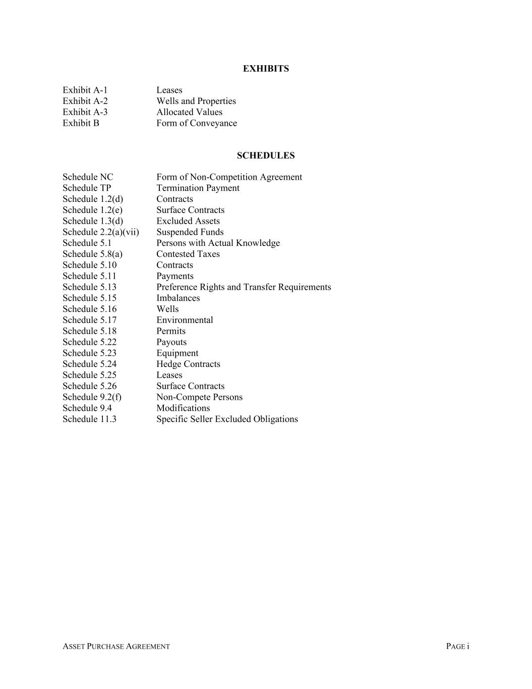 ASSET PURCHASE AGREEMENT PAGE i EXHIBITS Exhibit A-1 Leases Exhibit A-2 Wells and Properties Exhibit A-3 Allocated Values Exhibit B Form of Conveyance SCHEDULES Schedule NC Form of Non-Competition Agreement Schedule TP Termination Payment Schedule 1.2(d) Contracts Schedule 1.2(e) Surface Contracts Schedule 1.3(d) Excluded Assets Schedule 2.2(a)(vii) Suspended Funds Schedule 5.1 Persons with Actual Knowledge Schedule 5.8(a) Contested Taxes Schedule 5.10 Contracts Schedule 5.11 Payments Schedule 5.13 Preference Rights and Transfer Requirements Schedule 5.15 Imbalances Schedule 5.16 Wells Schedule 5.17 Environmental Schedule 5.18 Permits Schedule 5.22 Payouts Schedule 5.23 Equipment Schedule 5.24 Hedge Contracts Schedule 5.25 Leases Schedule 5.26 Surface Contracts Schedule 9.2(f) Non-Compete Persons Schedule 9.4 Modifications Schedule 11.3 Specific Seller Excluded Obligations