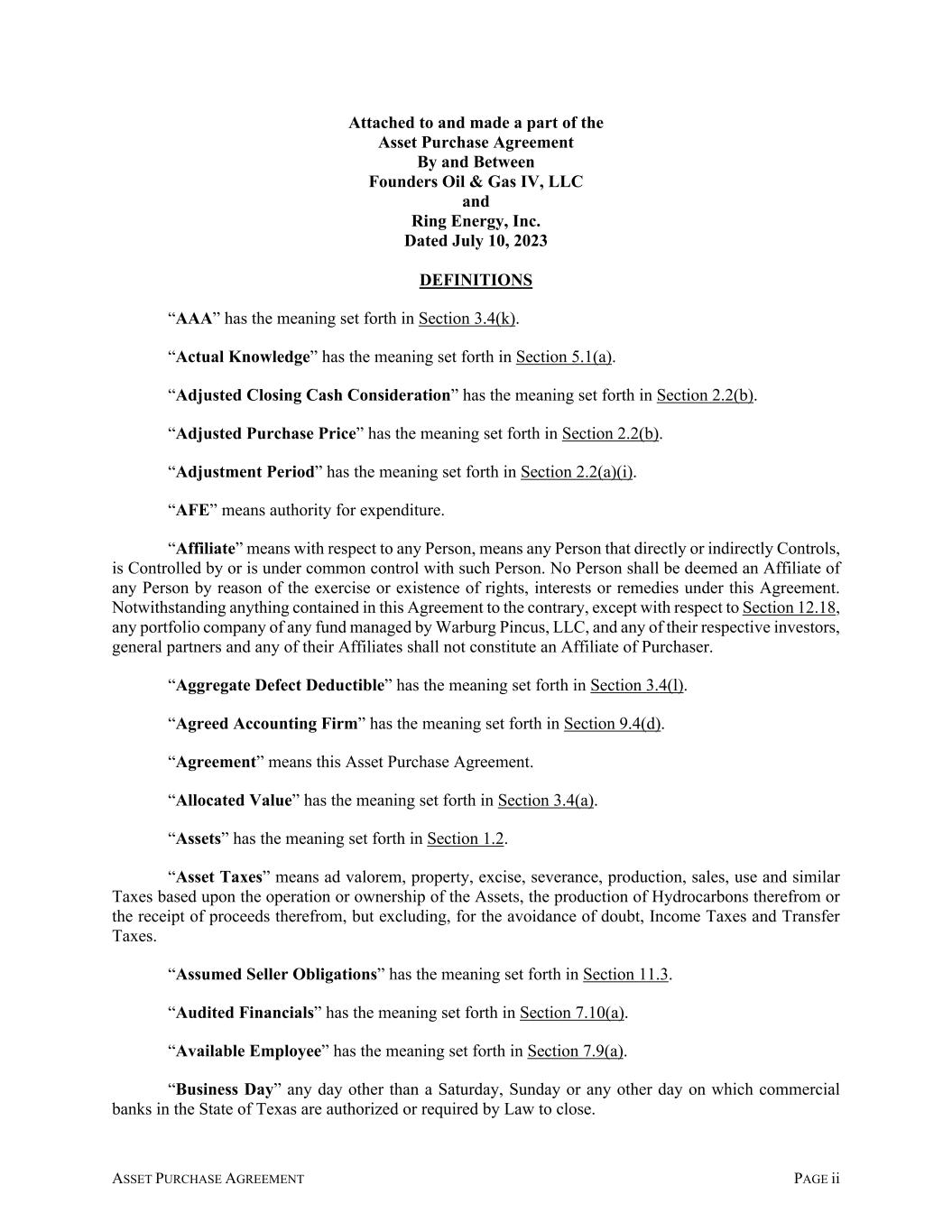 ASSET PURCHASE AGREEMENT PAGE ii Attached to and made a part of the Asset Purchase Agreement By and Between Founders Oil & Gas IV, LLC and Ring Energy, Inc. Dated July 10, 2023 DEFINITIONS “AAA” has the meaning set forth in Section 3.4(k). “Actual Knowledge” has the meaning set forth in Section 5.1(a). “Adjusted Closing Cash Consideration” has the meaning set forth in Section 2.2(b). “Adjusted Purchase Price” has the meaning set forth in Section 2.2(b). “Adjustment Period” has the meaning set forth in Section 2.2(a)(i). “AFE” means authority for expenditure. “Affiliate” means with respect to any Person, means any Person that directly or indirectly Controls, is Controlled by or is under common control with such Person. No Person shall be deemed an Affiliate of any Person by reason of the exercise or existence of rights, interests or remedies under this Agreement. Notwithstanding anything contained in this Agreement to the contrary, except with respect to Section 12.18, any portfolio company of any fund managed by Warburg Pincus, LLC, and any of their respective investors, general partners and any of their Affiliates shall not constitute an Affiliate of Purchaser. “Aggregate Defect Deductible” has the meaning set forth in Section 3.4(l). “Agreed Accounting Firm” has the meaning set forth in Section 9.4(d). “Agreement” means this Asset Purchase Agreement. “Allocated Value” has the meaning set forth in Section 3.4(a). “Assets” has the meaning set forth in Section 1.2. “Asset Taxes” means ad valorem, property, excise, severance, production, sales, use and similar Taxes based upon the operation or ownership of the Assets, the production of Hydrocarbons therefrom or the receipt of proceeds therefrom, but excluding, for the avoidance of doubt, Income Taxes and Transfer Taxes. “Assumed Seller Obligations” has the meaning set forth in Section 11.3. “Audited Financials” has the meaning set forth in Section 7.10(a). “Available Employee” has the meaning set forth in Section 7.9(a). “Business Day” any day other than a Saturday, Sunday or any other day on which commercial banks in the State of Texas are authorized or required by Law to close.