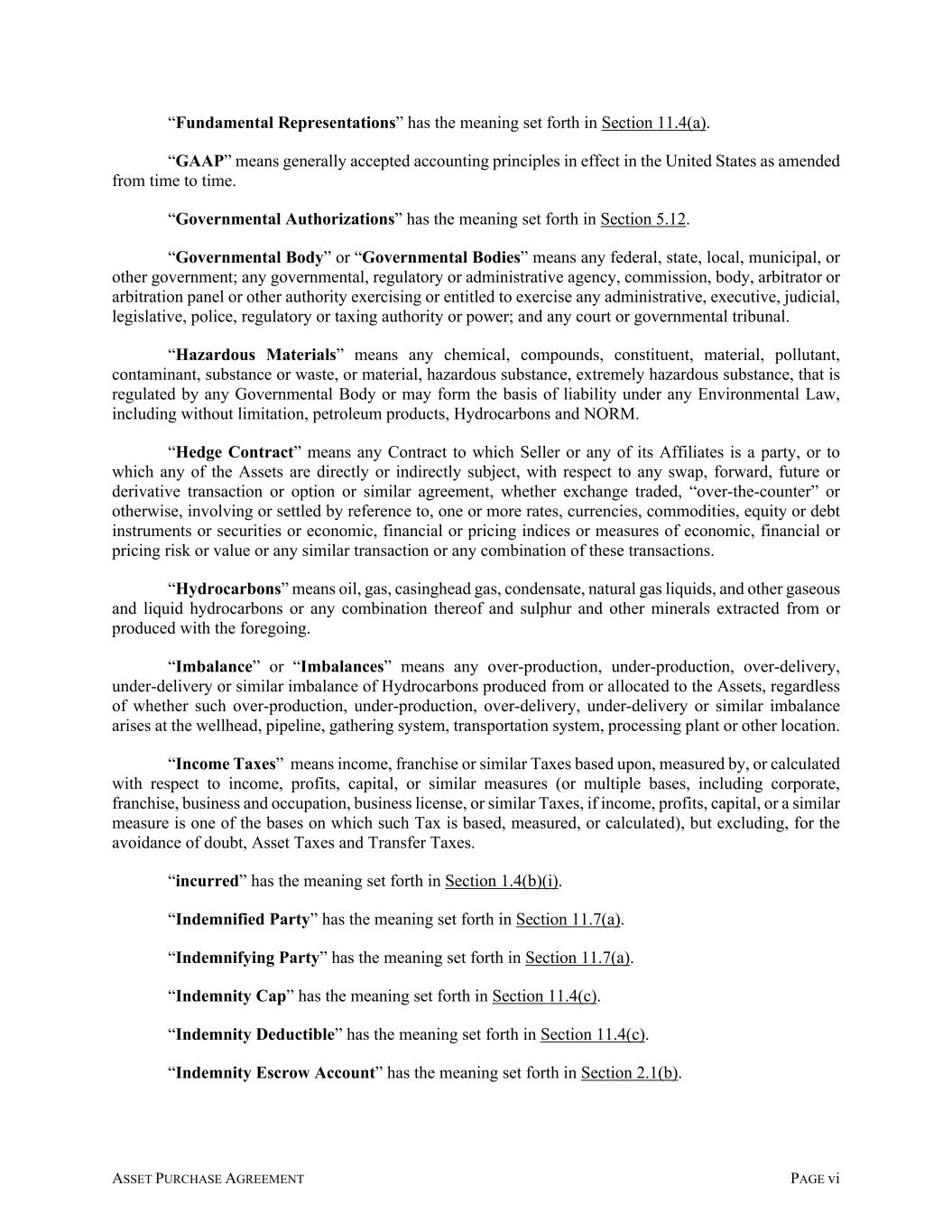 ASSET PURCHASE AGREEMENT PAGE vi “Fundamental Representations” has the meaning set forth in Section 11.4(a). “GAAP” means generally accepted accounting principles in effect in the United States as amended from time to time. “Governmental Authorizations” has the meaning set forth in Section 5.12. “Governmental Body” or “Governmental Bodies” means any federal, state, local, municipal, or other government; any governmental, regulatory or administrative agency, commission, body, arbitrator or arbitration panel or other authority exercising or entitled to exercise any administrative, executive, judicial, legislative, police, regulatory or taxing authority or power; and any court or governmental tribunal. “Hazardous Materials” means any chemical, compounds, constituent, material, pollutant, contaminant, substance or waste, or material, hazardous substance, extremely hazardous substance, that is regulated by any Governmental Body or may form the basis of liability under any Environmental Law, including without limitation, petroleum products, Hydrocarbons and NORM. “Hedge Contract” means any Contract to which Seller or any of its Affiliates is a party, or to which any of the Assets are directly or indirectly subject, with respect to any swap, forward, future or derivative transaction or option or similar agreement, whether exchange traded, “over-the-counter” or otherwise, involving or settled by reference to, one or more rates, currencies, commodities, equity or debt instruments or securities or economic, financial or pricing indices or measures of economic, financial or pricing risk or value or any similar transaction or any combination of these transactions. “Hydrocarbons” means oil, gas, casinghead gas, condensate, natural gas liquids, and other gaseous and liquid hydrocarbons or any combination thereof and sulphur and other minerals extracted from or produced with the foregoing. “Imbalance” or “Imbalances” means any over-production, under-production, over-delivery, under-delivery or similar imbalance of Hydrocarbons produced from or allocated to the Assets, regardless of whether such over-production, under-production, over-delivery, under-delivery or similar imbalance arises at the wellhead, pipeline, gathering system, transportation system, processing plant or other location. “Income Taxes” means income, franchise or similar Taxes based upon, measured by, or calculated with respect to income, profits, capital, or similar measures (or multiple bases, including corporate, franchise, business and occupation, business license, or similar Taxes, if income, profits, capital, or a similar measure is one of the bases on which such Tax is based, measured, or calculated), but excluding, for the avoidance of doubt, Asset Taxes and Transfer Taxes. “incurred” has the meaning set forth in Section 1.4(b)(i). “Indemnified Party” has the meaning set forth in Section 11.7(a). “Indemnifying Party” has the meaning set forth in Section 11.7(a). “Indemnity Cap” has the meaning set forth in Section 11.4(c). “Indemnity Deductible” has the meaning set forth in Section 11.4(c). “Indemnity Escrow Account” has the meaning set forth in Section 2.1(b).