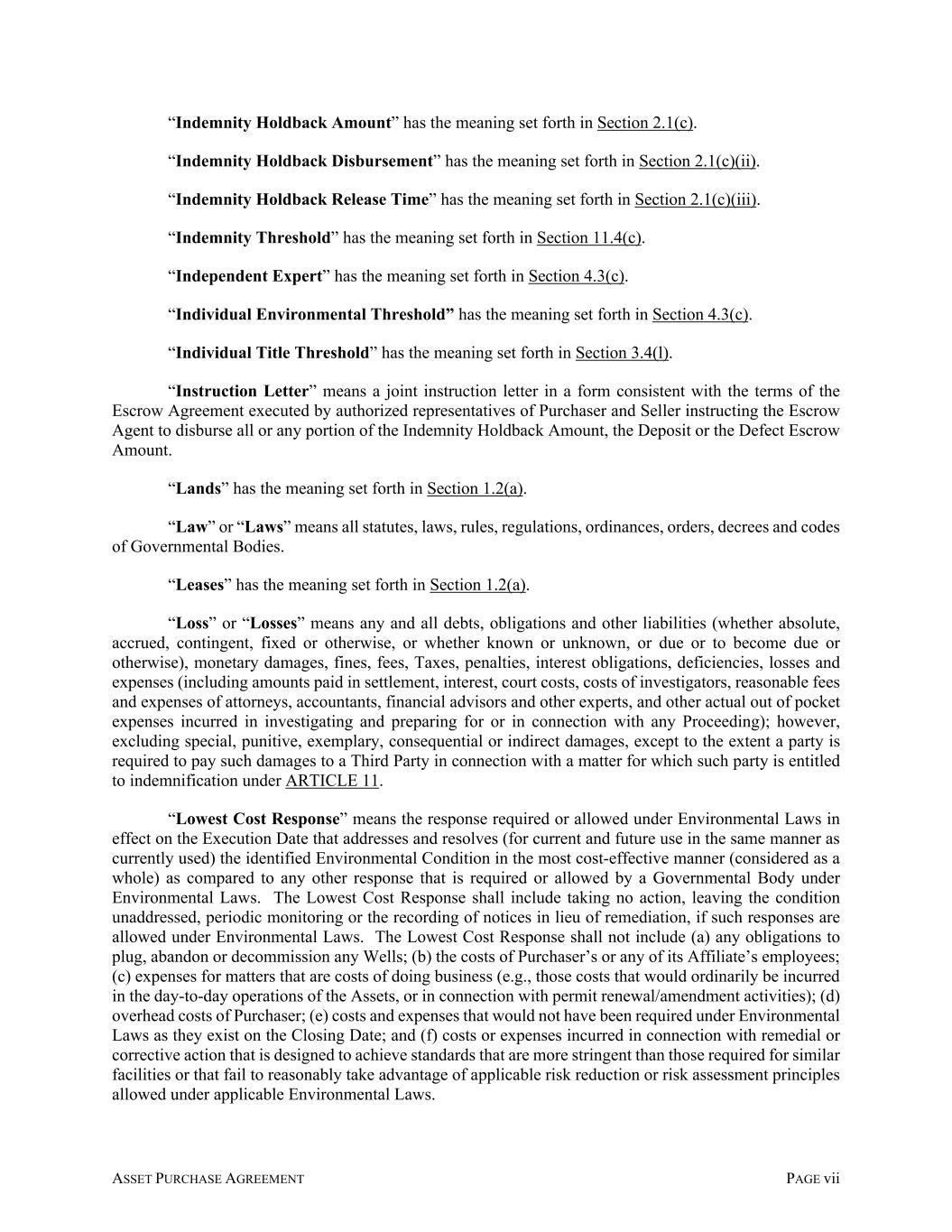 ASSET PURCHASE AGREEMENT PAGE vii “Indemnity Holdback Amount” has the meaning set forth in Section 2.1(c). “Indemnity Holdback Disbursement” has the meaning set forth in Section 2.1(c)(ii). “Indemnity Holdback Release Time” has the meaning set forth in Section 2.1(c)(iii). “Indemnity Threshold” has the meaning set forth in Section 11.4(c). “Independent Expert” has the meaning set forth in Section 4.3(c). “Individual Environmental Threshold” has the meaning set forth in Section 4.3(c). “Individual Title Threshold” has the meaning set forth in Section 3.4(l). “Instruction Letter” means a joint instruction letter in a form consistent with the terms of the Escrow Agreement executed by authorized representatives of Purchaser and Seller instructing the Escrow Agent to disburse all or any portion of the Indemnity Holdback Amount, the Deposit or the Defect Escrow Amount. “Lands” has the meaning set forth in Section 1.2(a). “Law” or “Laws” means all statutes, laws, rules, regulations, ordinances, orders, decrees and codes of Governmental Bodies. “Leases” has the meaning set forth in Section 1.2(a). “Loss” or “Losses” means any and all debts, obligations and other liabilities (whether absolute, accrued, contingent, fixed or otherwise, or whether known or unknown, or due or to become due or otherwise), monetary damages, fines, fees, Taxes, penalties, interest obligations, deficiencies, losses and expenses (including amounts paid in settlement, interest, court costs, costs of investigators, reasonable fees and expenses of attorneys, accountants, financial advisors and other experts, and other actual out of pocket expenses incurred in investigating and preparing for or in connection with any Proceeding); however, excluding special, punitive, exemplary, consequential or indirect damages, except to the extent a party is required to pay such damages to a Third Party in connection with a matter for which such party is entitled to indemnification under ARTICLE 11. “Lowest Cost Response” means the response required or allowed under Environmental Laws in effect on the Execution Date that addresses and resolves (for current and future use in the same manner as currently used) the identified Environmental Condition in the most cost-effective manner (considered as a whole) as compared to any other response that is required or allowed by a Governmental Body under Environmental Laws. The Lowest Cost Response shall include taking no action, leaving the condition unaddressed, periodic monitoring or the recording of notices in lieu of remediation, if such responses are allowed under Environmental Laws. The Lowest Cost Response shall not include (a) any obligations to plug, abandon or decommission any Wells; (b) the costs of Purchaser’s or any of its Affiliate’s employees; (c) expenses for matters that are costs of doing business (e.g., those costs that would ordinarily be incurred in the day-to-day operations of the Assets, or in connection with permit renewal/amendment activities); (d) overhead costs of Purchaser; (e) costs and expenses that would not have been required under Environmental Laws as they exist on the Closing Date; and (f) costs or expenses incurred in connection with remedial or corrective action that is designed to achieve standards that are more stringent than those required for similar facilities or that fail to reasonably take advantage of applicable risk reduction or risk assessment principles allowed under applicable Environmental Laws.