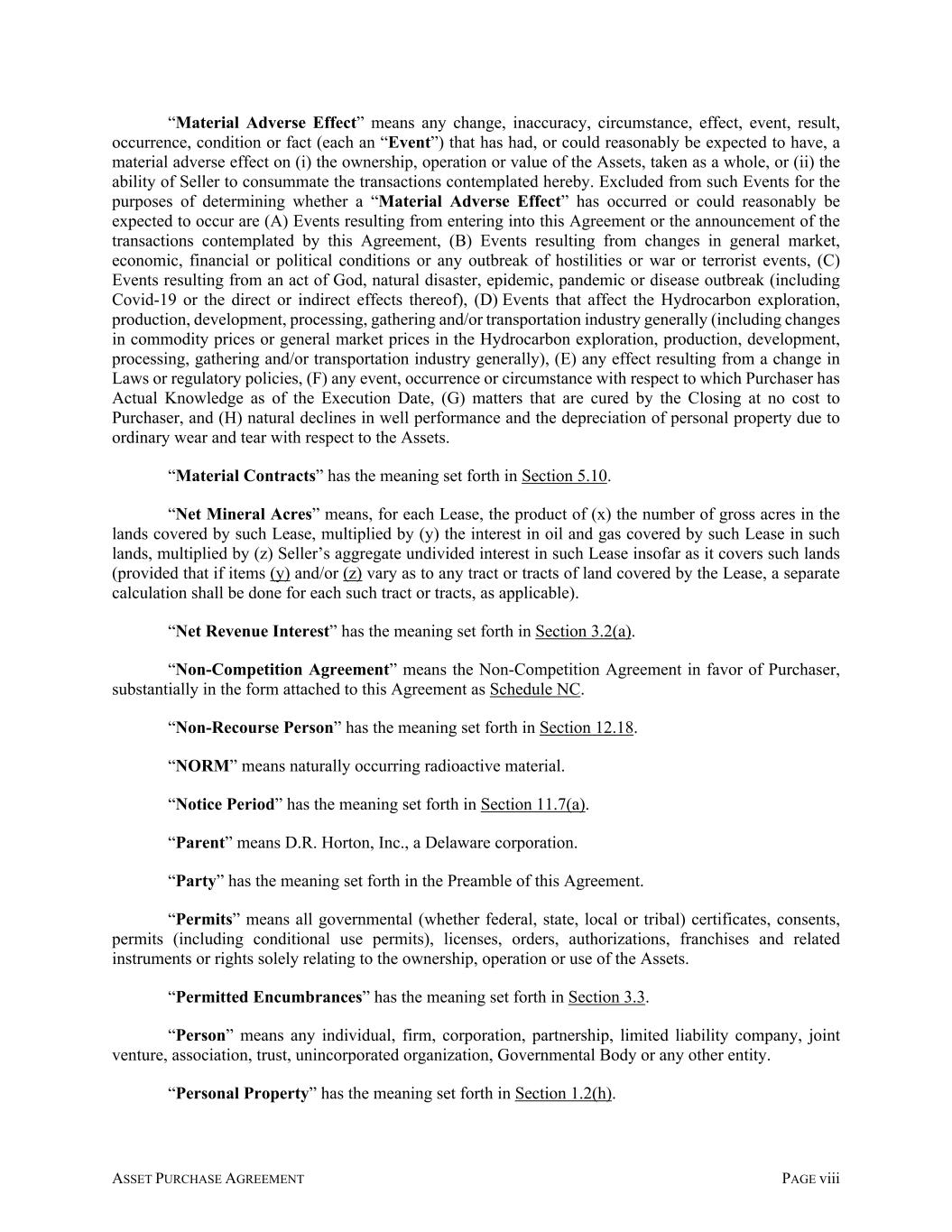 ASSET PURCHASE AGREEMENT PAGE viii “Material Adverse Effect” means any change, inaccuracy, circumstance, effect, event, result, occurrence, condition or fact (each an “Event”) that has had, or could reasonably be expected to have, a material adverse effect on (i) the ownership, operation or value of the Assets, taken as a whole, or (ii) the ability of Seller to consummate the transactions contemplated hereby. Excluded from such Events for the purposes of determining whether a “Material Adverse Effect” has occurred or could reasonably be expected to occur are (A) Events resulting from entering into this Agreement or the announcement of the transactions contemplated by this Agreement, (B) Events resulting from changes in general market, economic, financial or political conditions or any outbreak of hostilities or war or terrorist events, (C) Events resulting from an act of God, natural disaster, epidemic, pandemic or disease outbreak (including Covid-19 or the direct or indirect effects thereof), (D) Events that affect the Hydrocarbon exploration, production, development, processing, gathering and/or transportation industry generally (including changes in commodity prices or general market prices in the Hydrocarbon exploration, production, development, processing, gathering and/or transportation industry generally), (E) any effect resulting from a change in Laws or regulatory policies, (F) any event, occurrence or circumstance with respect to which Purchaser has Actual Knowledge as of the Execution Date, (G) matters that are cured by the Closing at no cost to Purchaser, and (H) natural declines in well performance and the depreciation of personal property due to ordinary wear and tear with respect to the Assets. “Material Contracts” has the meaning set forth in Section 5.10. “Net Mineral Acres” means, for each Lease, the product of (x) the number of gross acres in the lands covered by such Lease, multiplied by (y) the interest in oil and gas covered by such Lease in such lands, multiplied by (z) Seller’s aggregate undivided interest in such Lease insofar as it covers such lands (provided that if items (y) and/or (z) vary as to any tract or tracts of land covered by the Lease, a separate calculation shall be done for each such tract or tracts, as applicable). “Net Revenue Interest” has the meaning set forth in Section 3.2(a). “Non-Competition Agreement” means the Non-Competition Agreement in favor of Purchaser, substantially in the form attached to this Agreement as Schedule NC. “Non-Recourse Person” has the meaning set forth in Section 12.18. “NORM” means naturally occurring radioactive material. “Notice Period” has the meaning set forth in Section 11.7(a). “Parent” means D.R. Horton, Inc., a Delaware corporation. “Party” has the meaning set forth in the Preamble of this Agreement. “Permits” means all governmental (whether federal, state, local or tribal) certificates, consents, permits (including conditional use permits), licenses, orders, authorizations, franchises and related instruments or rights solely relating to the ownership, operation or use of the Assets. “Permitted Encumbrances” has the meaning set forth in Section 3.3. “Person” means any individual, firm, corporation, partnership, limited liability company, joint venture, association, trust, unincorporated organization, Governmental Body or any other entity. “Personal Property” has the meaning set forth in Section 1.2(h).