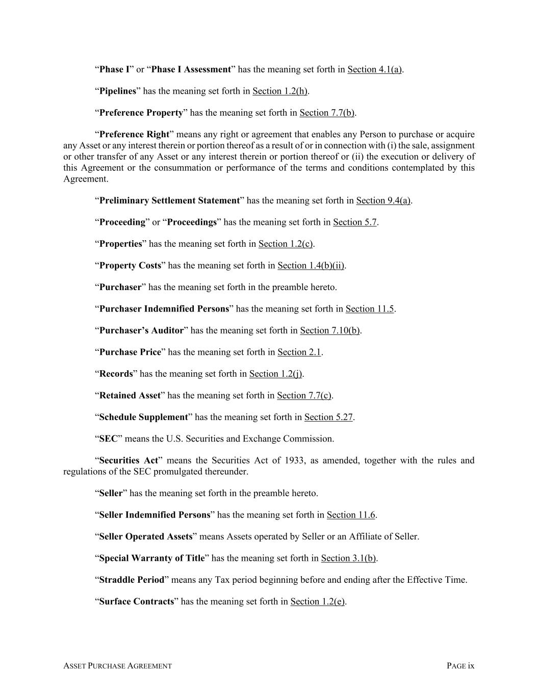 ASSET PURCHASE AGREEMENT PAGE ix “Phase I” or “Phase I Assessment” has the meaning set forth in Section 4.1(a). “Pipelines” has the meaning set forth in Section 1.2(h). “Preference Property” has the meaning set forth in Section 7.7(b). “Preference Right” means any right or agreement that enables any Person to purchase or acquire any Asset or any interest therein or portion thereof as a result of or in connection with (i) the sale, assignment or other transfer of any Asset or any interest therein or portion thereof or (ii) the execution or delivery of this Agreement or the consummation or performance of the terms and conditions contemplated by this Agreement. “Preliminary Settlement Statement” has the meaning set forth in Section 9.4(a). “Proceeding” or “Proceedings” has the meaning set forth in Section 5.7. “Properties” has the meaning set forth in Section 1.2(c). “Property Costs” has the meaning set forth in Section 1.4(b)(ii). “Purchaser” has the meaning set forth in the preamble hereto. “Purchaser Indemnified Persons” has the meaning set forth in Section 11.5. “Purchaser’s Auditor” has the meaning set forth in Section 7.10(b). “Purchase Price” has the meaning set forth in Section 2.1. “Records” has the meaning set forth in Section 1.2(j). “Retained Asset” has the meaning set forth in Section 7.7(c). “Schedule Supplement” has the meaning set forth in Section 5.27. “SEC” means the U.S. Securities and Exchange Commission. “Securities Act” means the Securities Act of 1933, as amended, together with the rules and regulations of the SEC promulgated thereunder. “Seller” has the meaning set forth in the preamble hereto. “Seller Indemnified Persons” has the meaning set forth in Section 11.6. “Seller Operated Assets” means Assets operated by Seller or an Affiliate of Seller. “Special Warranty of Title” has the meaning set forth in Section 3.1(b). “Straddle Period” means any Tax period beginning before and ending after the Effective Time. “Surface Contracts” has the meaning set forth in Section 1.2(e).