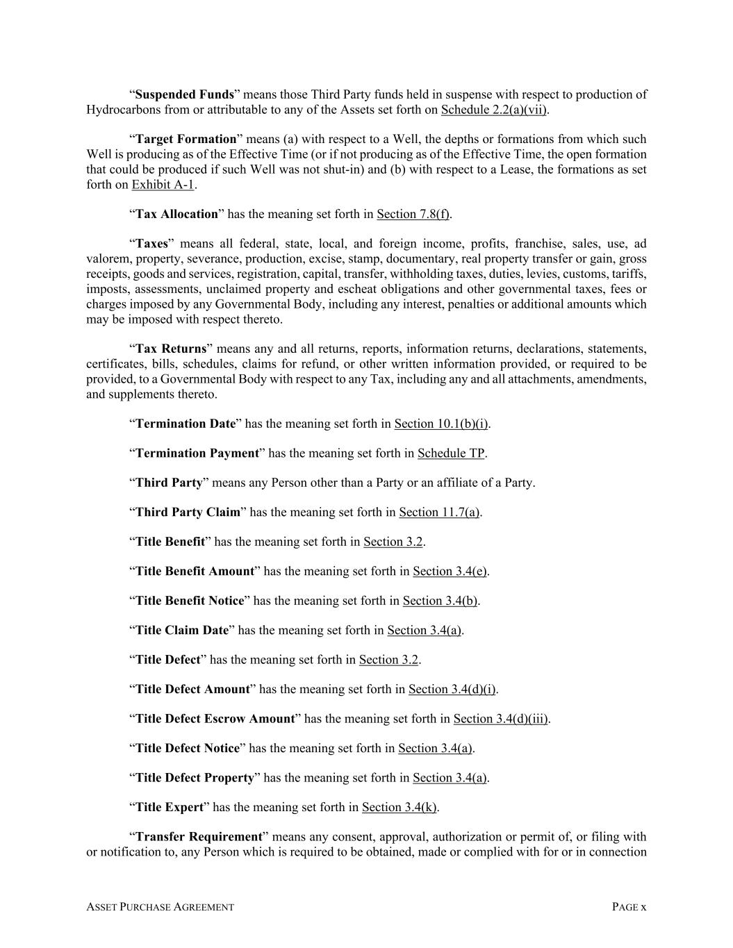 ASSET PURCHASE AGREEMENT PAGE x “Suspended Funds” means those Third Party funds held in suspense with respect to production of Hydrocarbons from or attributable to any of the Assets set forth on Schedule 2.2(a)(vii). “Target Formation” means (a) with respect to a Well, the depths or formations from which such Well is producing as of the Effective Time (or if not producing as of the Effective Time, the open formation that could be produced if such Well was not shut-in) and (b) with respect to a Lease, the formations as set forth on Exhibit A-1. “Tax Allocation” has the meaning set forth in Section 7.8(f). “Taxes” means all federal, state, local, and foreign income, profits, franchise, sales, use, ad valorem, property, severance, production, excise, stamp, documentary, real property transfer or gain, gross receipts, goods and services, registration, capital, transfer, withholding taxes, duties, levies, customs, tariffs, imposts, assessments, unclaimed property and escheat obligations and other governmental taxes, fees or charges imposed by any Governmental Body, including any interest, penalties or additional amounts which may be imposed with respect thereto. “Tax Returns” means any and all returns, reports, information returns, declarations, statements, certificates, bills, schedules, claims for refund, or other written information provided, or required to be provided, to a Governmental Body with respect to any Tax, including any and all attachments, amendments, and supplements thereto. “Termination Date” has the meaning set forth in Section 10.1(b)(i). “Termination Payment” has the meaning set forth in Schedule TP. “Third Party” means any Person other than a Party or an affiliate of a Party. “Third Party Claim” has the meaning set forth in Section 11.7(a). “Title Benefit” has the meaning set forth in Section 3.2. “Title Benefit Amount” has the meaning set forth in Section 3.4(e). “Title Benefit Notice” has the meaning set forth in Section 3.4(b). “Title Claim Date” has the meaning set forth in Section 3.4(a). “Title Defect” has the meaning set forth in Section 3.2. “Title Defect Amount” has the meaning set forth in Section 3.4(d)(i). “Title Defect Escrow Amount” has the meaning set forth in Section 3.4(d)(iii). “Title Defect Notice” has the meaning set forth in Section 3.4(a). “Title Defect Property” has the meaning set forth in Section 3.4(a). “Title Expert” has the meaning set forth in Section 3.4(k). “Transfer Requirement” means any consent, approval, authorization or permit of, or filing with or notification to, any Person which is required to be obtained, made or complied with for or in connection