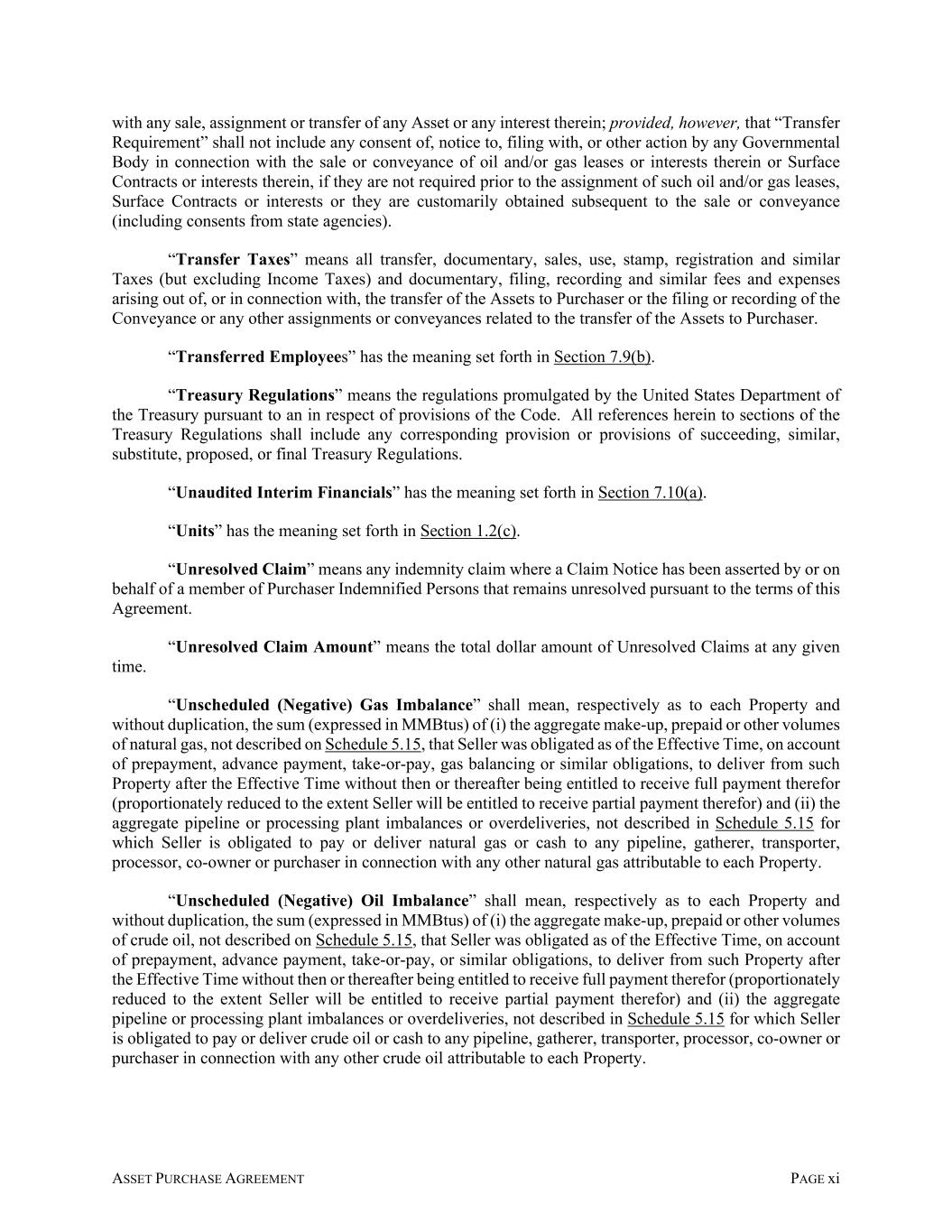 ASSET PURCHASE AGREEMENT PAGE xi with any sale, assignment or transfer of any Asset or any interest therein; provided, however, that “Transfer Requirement” shall not include any consent of, notice to, filing with, or other action by any Governmental Body in connection with the sale or conveyance of oil and/or gas leases or interests therein or Surface Contracts or interests therein, if they are not required prior to the assignment of such oil and/or gas leases, Surface Contracts or interests or they are customarily obtained subsequent to the sale or conveyance (including consents from state agencies). “Transfer Taxes” means all transfer, documentary, sales, use, stamp, registration and similar Taxes (but excluding Income Taxes) and documentary, filing, recording and similar fees and expenses arising out of, or in connection with, the transfer of the Assets to Purchaser or the filing or recording of the Conveyance or any other assignments or conveyances related to the transfer of the Assets to Purchaser. “Transferred Employees” has the meaning set forth in Section 7.9(b). “Treasury Regulations” means the regulations promulgated by the United States Department of the Treasury pursuant to an in respect of provisions of the Code. All references herein to sections of the Treasury Regulations shall include any corresponding provision or provisions of succeeding, similar, substitute, proposed, or final Treasury Regulations. “Unaudited Interim Financials” has the meaning set forth in Section 7.10(a). “Units” has the meaning set forth in Section 1.2(c). “Unresolved Claim” means any indemnity claim where a Claim Notice has been asserted by or on behalf of a member of Purchaser Indemnified Persons that remains unresolved pursuant to the terms of this Agreement. “Unresolved Claim Amount” means the total dollar amount of Unresolved Claims at any given time. “Unscheduled (Negative) Gas Imbalance” shall mean, respectively as to each Property and without duplication, the sum (expressed in MMBtus) of (i) the aggregate make-up, prepaid or other volumes of natural gas, not described on Schedule 5.15, that Seller was obligated as of the Effective Time, on account of prepayment, advance payment, take-or-pay, gas balancing or similar obligations, to deliver from such Property after the Effective Time without then or thereafter being entitled to receive full payment therefor (proportionately reduced to the extent Seller will be entitled to receive partial payment therefor) and (ii) the aggregate pipeline or processing plant imbalances or overdeliveries, not described in Schedule 5.15 for which Seller is obligated to pay or deliver natural gas or cash to any pipeline, gatherer, transporter, processor, co-owner or purchaser in connection with any other natural gas attributable to each Property. “Unscheduled (Negative) Oil Imbalance” shall mean, respectively as to each Property and without duplication, the sum (expressed in MMBtus) of (i) the aggregate make-up, prepaid or other volumes of crude oil, not described on Schedule 5.15, that Seller was obligated as of the Effective Time, on account of prepayment, advance payment, take-or-pay, or similar obligations, to deliver from such Property after the Effective Time without then or thereafter being entitled to receive full payment therefor (proportionately reduced to the extent Seller will be entitled to receive partial payment therefor) and (ii) the aggregate pipeline or processing plant imbalances or overdeliveries, not described in Schedule 5.15 for which Seller is obligated to pay or deliver crude oil or cash to any pipeline, gatherer, transporter, processor, co-owner or purchaser in connection with any other crude oil attributable to each Property.