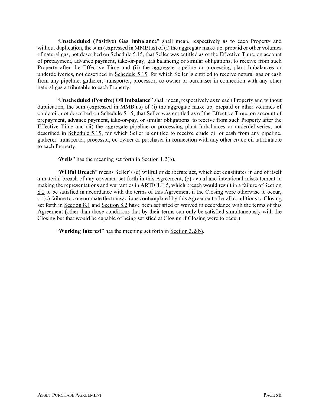 ASSET PURCHASE AGREEMENT PAGE xii “Unscheduled (Positive) Gas Imbalance” shall mean, respectively as to each Property and without duplication, the sum (expressed in MMBtus) of (i) the aggregate make-up, prepaid or other volumes of natural gas, not described on Schedule 5.15, that Seller was entitled as of the Effective Time, on account of prepayment, advance payment, take-or-pay, gas balancing or similar obligations, to receive from such Property after the Effective Time and (ii) the aggregate pipeline or processing plant Imbalances or underdeliveries, not described in Schedule 5.15, for which Seller is entitled to receive natural gas or cash from any pipeline, gatherer, transporter, processor, co-owner or purchaser in connection with any other natural gas attributable to each Property. “Unscheduled (Positive) Oil Imbalance” shall mean, respectively as to each Property and without duplication, the sum (expressed in MMBtus) of (i) the aggregate make-up, prepaid or other volumes of crude oil, not described on Schedule 5.15, that Seller was entitled as of the Effective Time, on account of prepayment, advance payment, take-or-pay, or similar obligations, to receive from such Property after the Effective Time and (ii) the aggregate pipeline or processing plant Imbalances or underdeliveries, not described in Schedule 5.15, for which Seller is entitled to receive crude oil or cash from any pipeline, gatherer, transporter, processor, co-owner or purchaser in connection with any other crude oil attributable to each Property. “Wells” has the meaning set forth in Section 1.2(b). “Willful Breach” means Seller’s (a) willful or deliberate act, which act constitutes in and of itself a material breach of any covenant set forth in this Agreement, (b) actual and intentional misstatement in making the representations and warranties in ARTICLE 5, which breach would result in a failure of Section 8.2 to be satisfied in accordance with the terms of this Agreement if the Closing were otherwise to occur, or (c) failure to consummate the transactions contemplated by this Agreement after all conditions to Closing set forth in Section 8.1 and Section 8.2 have been satisfied or waived in accordance with the terms of this Agreement (other than those conditions that by their terms can only be satisfied simultaneously with the Closing but that would be capable of being satisfied at Closing if Closing were to occur). “Working Interest” has the meaning set forth in Section 3.2(b).