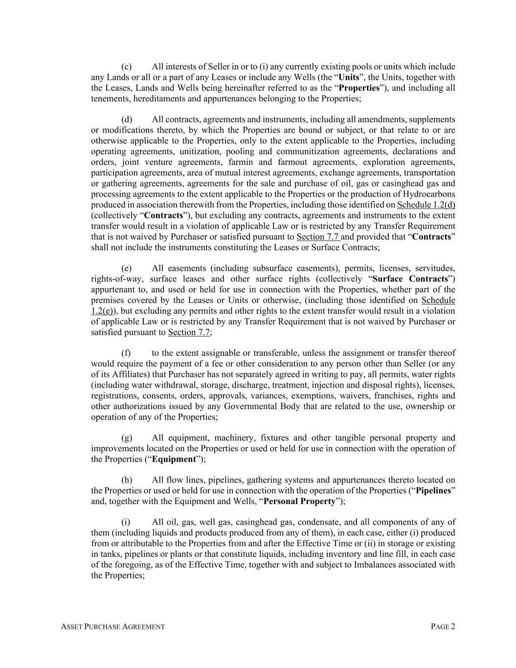 ASSET PURCHASE AGREEMENT PAGE 2 (c) All interests of Seller in or to (i) any currently existing pools or units which include any Lands or all or a part of any Leases or include any Wells (the “Units”, the Units, together with the Leases, Lands and Wells being hereinafter referred to as the “Properties”), and including all tenements, hereditaments and appurtenances belonging to the Properties; (d) All contracts, agreements and instruments, including all amendments, supplements or modifications thereto, by which the Properties are bound or subject, or that relate to or are otherwise applicable to the Properties, only to the extent applicable to the Properties, including operating agreements, unitization, pooling and communitization agreements, declarations and orders, joint venture agreements, farmin and farmout agreements, exploration agreements, participation agreements, area of mutual interest agreements, exchange agreements, transportation or gathering agreements, agreements for the sale and purchase of oil, gas or casinghead gas and processing agreements to the extent applicable to the Properties or the production of Hydrocarbons produced in association therewith from the Properties, including those identified on Schedule 1.2(d) (collectively “Contracts”), but excluding any contracts, agreements and instruments to the extent transfer would result in a violation of applicable Law or is restricted by any Transfer Requirement that is not waived by Purchaser or satisfied pursuant to Section 7.7 and provided that “Contracts” shall not include the instruments constituting the Leases or Surface Contracts; (e) All easements (including subsurface easements), permits, licenses, servitudes, rights-of-way, surface leases and other surface rights (collectively “Surface Contracts”) appurtenant to, and used or held for use in connection with the Properties, whether part of the premises covered by the Leases or Units or otherwise, (including those identified on Schedule 1.2(e)), but excluding any permits and other rights to the extent transfer would result in a violation of applicable Law or is restricted by any Transfer Requirement that is not waived by Purchaser or satisfied pursuant to Section 7.7; (f) to the extent assignable or transferable, unless the assignment or transfer thereof would require the payment of a fee or other consideration to any person other than Seller (or any of its Affiliates) that Purchaser has not separately agreed in writing to pay, all permits, water rights (including water withdrawal, storage, discharge, treatment, injection and disposal rights), licenses, registrations, consents, orders, approvals, variances, exemptions, waivers, franchises, rights and other authorizations issued by any Governmental Body that are related to the use, ownership or operation of any of the Properties; (g) All equipment, machinery, fixtures and other tangible personal property and improvements located on the Properties or used or held for use in connection with the operation of the Properties (“Equipment”); (h) All flow lines, pipelines, gathering systems and appurtenances thereto located on the Properties or used or held for use in connection with the operation of the Properties (“Pipelines” and, together with the Equipment and Wells, “Personal Property”); (i) All oil, gas, well gas, casinghead gas, condensate, and all components of any of them (including liquids and products produced from any of them), in each case, either (i) produced from or attributable to the Properties from and after the Effective Time or (ii) in storage or existing in tanks, pipelines or plants or that constitute liquids, including inventory and line fill, in each case of the foregoing, as of the Effective Time, together with and subject to Imbalances associated with the Properties;