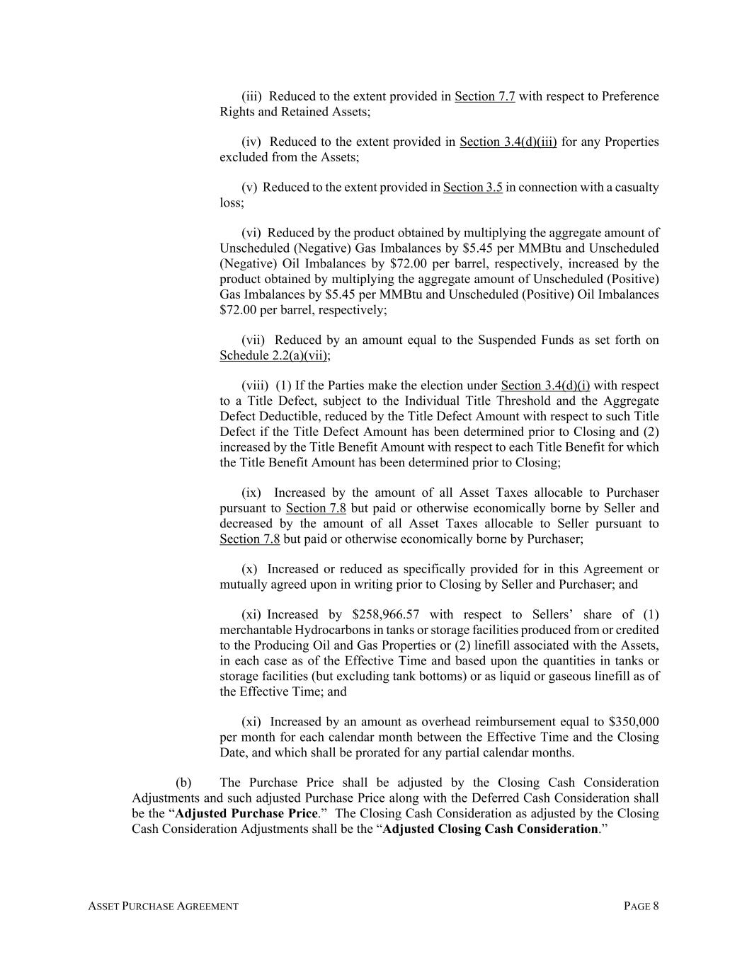 ASSET PURCHASE AGREEMENT PAGE 8 (iii) Reduced to the extent provided in Section 7.7 with respect to Preference Rights and Retained Assets; (iv) Reduced to the extent provided in Section 3.4(d)(iii) for any Properties excluded from the Assets; (v) Reduced to the extent provided in Section 3.5 in connection with a casualty loss; (vi) Reduced by the product obtained by multiplying the aggregate amount of Unscheduled (Negative) Gas Imbalances by $5.45 per MMBtu and Unscheduled (Negative) Oil Imbalances by $72.00 per barrel, respectively, increased by the product obtained by multiplying the aggregate amount of Unscheduled (Positive) Gas Imbalances by $5.45 per MMBtu and Unscheduled (Positive) Oil Imbalances $72.00 per barrel, respectively; (vii) Reduced by an amount equal to the Suspended Funds as set forth on Schedule 2.2(a)(vii); (viii) (1) If the Parties make the election under Section 3.4(d)(i) with respect to a Title Defect, subject to the Individual Title Threshold and the Aggregate Defect Deductible, reduced by the Title Defect Amount with respect to such Title Defect if the Title Defect Amount has been determined prior to Closing and (2) increased by the Title Benefit Amount with respect to each Title Benefit for which the Title Benefit Amount has been determined prior to Closing; (ix) Increased by the amount of all Asset Taxes allocable to Purchaser pursuant to Section 7.8 but paid or otherwise economically borne by Seller and decreased by the amount of all Asset Taxes allocable to Seller pursuant to Section 7.8 but paid or otherwise economically borne by Purchaser; (x) Increased or reduced as specifically provided for in this Agreement or mutually agreed upon in writing prior to Closing by Seller and Purchaser; and (xi) Increased by $258,966.57 with respect to Sellers’ share of (1) merchantable Hydrocarbons in tanks or storage facilities produced from or credited to the Producing Oil and Gas Properties or (2) linefill associated with the Assets, in each case as of the Effective Time and based upon the quantities in tanks or storage facilities (but excluding tank bottoms) or as liquid or gaseous linefill as of the Effective Time; and (xi) Increased by an amount as overhead reimbursement equal to $350,000 per month for each calendar month between the Effective Time and the Closing Date, and which shall be prorated for any partial calendar months. (b) The Purchase Price shall be adjusted by the Closing Cash Consideration Adjustments and such adjusted Purchase Price along with the Deferred Cash Consideration shall be the “Adjusted Purchase Price.” The Closing Cash Consideration as adjusted by the Closing Cash Consideration Adjustments shall be the “Adjusted Closing Cash Consideration.”