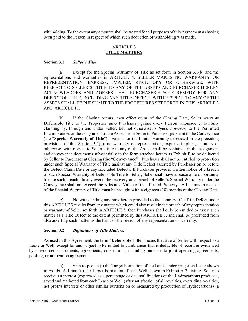 ASSET PURCHASE AGREEMENT PAGE 10 withholding. To the extent any amounts shall be treated for all purposes of this Agreement as having been paid to the Person in respect of which such deduction or withholding was made. ARTICLE 3 TITLE MATTERS Section 3.1 Seller’s Title. (a) Except for the Special Warranty of Title as set forth in Section 3.1(b) and the representations and warranties in ARTICLE 4, SELLER MAKES NO WARRANTY OR REPRESENTATION, EXPRESS, IMPLIED, STATUTORY OR OTHERWISE, WITH RESPECT TO SELLER’S TITLE TO ANY OF THE ASSETS AND PURCHASER HEREBY ACKNOWLEDGES AND AGREES THAT PURCHASER’S SOLE REMEDY FOR ANY DEFECT OF TITLE, INCLUDING ANY TITLE DEFECT, WITH RESPECT TO ANY OF THE ASSETS SHALL BE PURSUANT TO THE PROCEDURES SET FORTH IN THIS ARTICLE 3 AND ARTICLE 11. (b) If the Closing occurs, then effective as of the Closing Date, Seller warrants Defensible Title to the Properties unto Purchaser against every Person whomsoever lawfully claiming by, through and under Seller, but not otherwise, subject, however, to the Permitted Encumbrances or the assignment of the Assets from Seller to Purchaser pursuant to the Conveyance (the “Special Warranty of Title”). Except for the limited warranty expressed in the preceding provisions of this Section 3.1(b), no warranty or representation, express, implied, statutory or otherwise, with respect to Seller’s title to any of the Assets shall be contained in the assignment and conveyance documents substantially in the form attached hereto as Exhibit B to be delivered by Seller to Purchaser at Closing (the “Conveyance”). Purchaser shall not be entitled to protection under such Special Warranty of Title against any Title Defect asserted by Purchaser on or before the Defect Claim Date or any Excluded Defects. If Purchaser provides written notice of a breach of such Special Warranty of Defensible Title to Seller, Seller shall have a reasonable opportunity to cure such breach. In any event, the recovery on a breach of Seller’s Special Warranty under the Conveyance shall not exceed the Allocated Value of the affected Property. All claims in respect of the Special Warranty of Title must be brought within eighteen (18) months of the Closing Date. (c) Notwithstanding anything herein provided to the contrary, if a Title Defect under this ARTICLE 3 results from any matter which could also result in the breach of any representation or warranty of Seller set forth in ARTICLE 5, then Purchaser shall only be entitled to assert such matter as a Title Defect to the extent permitted by this ARTICLE 3, and shall be precluded from also asserting such matter as the basis of the breach of any representation or warranty. Section 3.2 Definitions of Title Matters. As used in this Agreement, the term “Defensible Title” means that title of Seller with respect to a Lease or Well, except for and subject to Permitted Encumbrances that is deducible of record or evidenced by unrecorded instruments, agreements, or elections, including pursuant to joint operating agreements, pooling, or unitization agreements: (a) with respect to (i) the Target Formation of the Lands underlying each Lease shown in Exhibit A-1 and (ii) the Target Formation of each Well shown in Exhibit A-2, entitles Seller to receive an interest (expressed as a percentage or decimal fraction) of the Hydrocarbons produced, saved and marketed from each Lease or Well (after satisfaction of all royalties, overriding royalties, net profits interests or other similar burdens on or measured by production of Hydrocarbons) (a