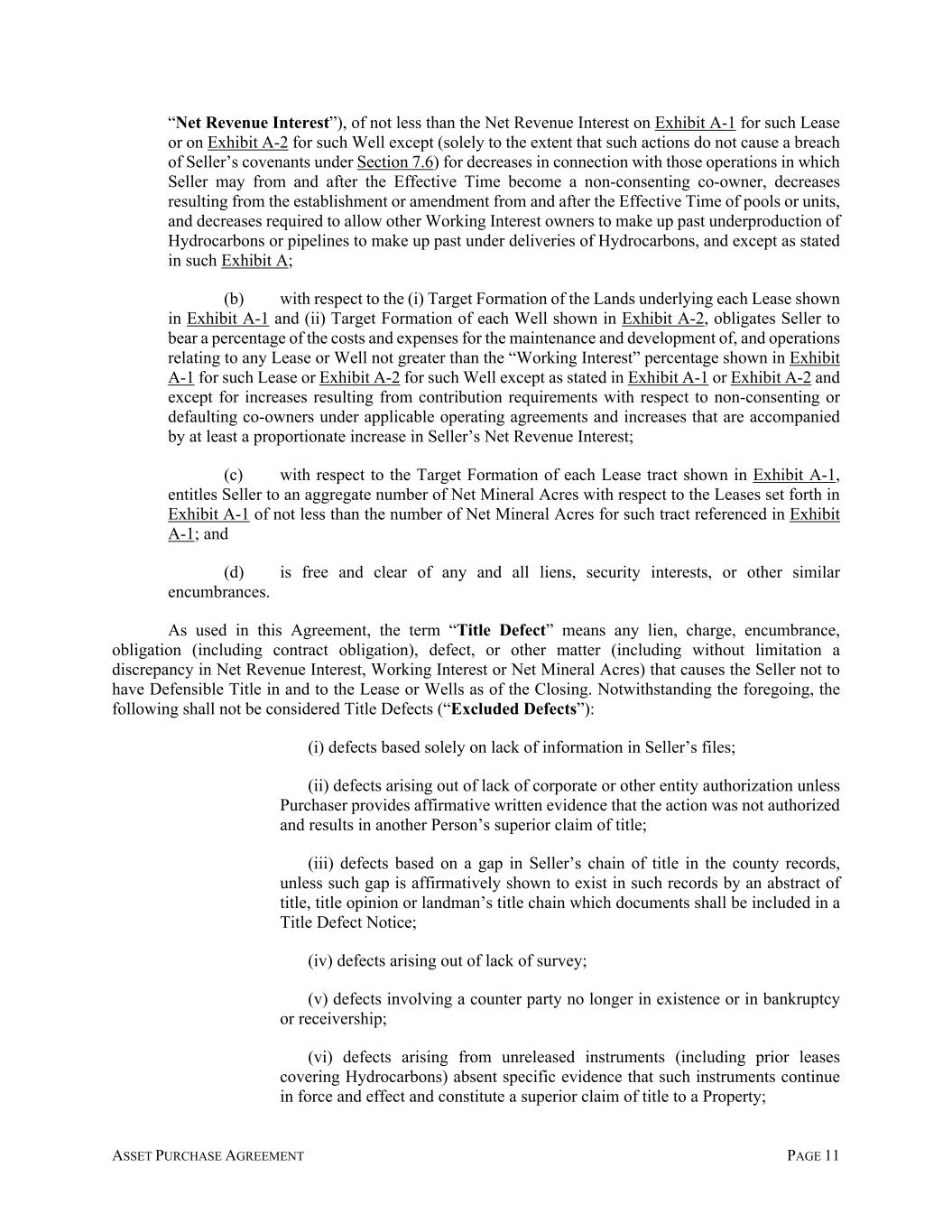 ASSET PURCHASE AGREEMENT PAGE 11 “Net Revenue Interest”), of not less than the Net Revenue Interest on Exhibit A-1 for such Lease or on Exhibit A-2 for such Well except (solely to the extent that such actions do not cause a breach of Seller’s covenants under Section 7.6) for decreases in connection with those operations in which Seller may from and after the Effective Time become a non-consenting co-owner, decreases resulting from the establishment or amendment from and after the Effective Time of pools or units, and decreases required to allow other Working Interest owners to make up past underproduction of Hydrocarbons or pipelines to make up past under deliveries of Hydrocarbons, and except as stated in such Exhibit A; (b) with respect to the (i) Target Formation of the Lands underlying each Lease shown in Exhibit A-1 and (ii) Target Formation of each Well shown in Exhibit A-2, obligates Seller to bear a percentage of the costs and expenses for the maintenance and development of, and operations relating to any Lease or Well not greater than the “Working Interest” percentage shown in Exhibit A-1 for such Lease or Exhibit A-2 for such Well except as stated in Exhibit A-1 or Exhibit A-2 and except for increases resulting from contribution requirements with respect to non-consenting or defaulting co-owners under applicable operating agreements and increases that are accompanied by at least a proportionate increase in Seller’s Net Revenue Interest; (c) with respect to the Target Formation of each Lease tract shown in Exhibit A-1, entitles Seller to an aggregate number of Net Mineral Acres with respect to the Leases set forth in Exhibit A-1 of not less than the number of Net Mineral Acres for such tract referenced in Exhibit A-1; and (d) is free and clear of any and all liens, security interests, or other similar encumbrances. As used in this Agreement, the term “Title Defect” means any lien, charge, encumbrance, obligation (including contract obligation), defect, or other matter (including without limitation a discrepancy in Net Revenue Interest, Working Interest or Net Mineral Acres) that causes the Seller not to have Defensible Title in and to the Lease or Wells as of the Closing. Notwithstanding the foregoing, the following shall not be considered Title Defects (“Excluded Defects”): (i) defects based solely on lack of information in Seller’s files; (ii) defects arising out of lack of corporate or other entity authorization unless Purchaser provides affirmative written evidence that the action was not authorized and results in another Person’s superior claim of title; (iii) defects based on a gap in Seller’s chain of title in the county records, unless such gap is affirmatively shown to exist in such records by an abstract of title, title opinion or landman’s title chain which documents shall be included in a Title Defect Notice; (iv) defects arising out of lack of survey; (v) defects involving a counter party no longer in existence or in bankruptcy or receivership; (vi) defects arising from unreleased instruments (including prior leases covering Hydrocarbons) absent specific evidence that such instruments continue in force and effect and constitute a superior claim of title to a Property;