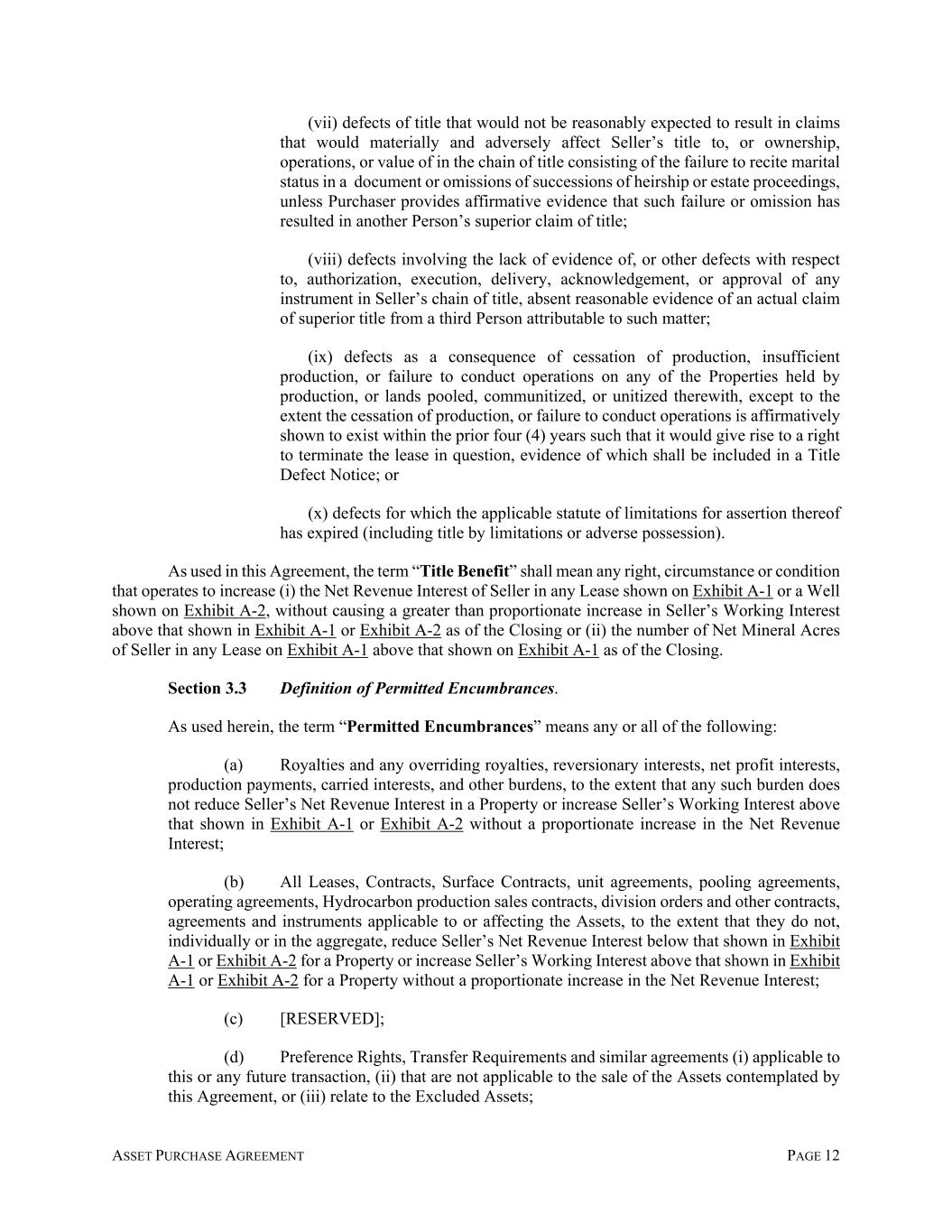 ASSET PURCHASE AGREEMENT PAGE 12 (vii) defects of title that would not be reasonably expected to result in claims that would materially and adversely affect Seller’s title to, or ownership, operations, or value of in the chain of title consisting of the failure to recite marital status in a document or omissions of successions of heirship or estate proceedings, unless Purchaser provides affirmative evidence that such failure or omission has resulted in another Person’s superior claim of title; (viii) defects involving the lack of evidence of, or other defects with respect to, authorization, execution, delivery, acknowledgement, or approval of any instrument in Seller’s chain of title, absent reasonable evidence of an actual claim of superior title from a third Person attributable to such matter; (ix) defects as a consequence of cessation of production, insufficient production, or failure to conduct operations on any of the Properties held by production, or lands pooled, communitized, or unitized therewith, except to the extent the cessation of production, or failure to conduct operations is affirmatively shown to exist within the prior four (4) years such that it would give rise to a right to terminate the lease in question, evidence of which shall be included in a Title Defect Notice; or (x) defects for which the applicable statute of limitations for assertion thereof has expired (including title by limitations or adverse possession). As used in this Agreement, the term “Title Benefit” shall mean any right, circumstance or condition that operates to increase (i) the Net Revenue Interest of Seller in any Lease shown on Exhibit A-1 or a Well shown on Exhibit A-2, without causing a greater than proportionate increase in Seller’s Working Interest above that shown in Exhibit A-1 or Exhibit A-2 as of the Closing or (ii) the number of Net Mineral Acres of Seller in any Lease on Exhibit A-1 above that shown on Exhibit A-1 as of the Closing. Section 3.3 Definition of Permitted Encumbrances. As used herein, the term “Permitted Encumbrances” means any or all of the following: (a) Royalties and any overriding royalties, reversionary interests, net profit interests, production payments, carried interests, and other burdens, to the extent that any such burden does not reduce Seller’s Net Revenue Interest in a Property or increase Seller’s Working Interest above that shown in Exhibit A-1 or Exhibit A-2 without a proportionate increase in the Net Revenue Interest; (b) All Leases, Contracts, Surface Contracts, unit agreements, pooling agreements, operating agreements, Hydrocarbon production sales contracts, division orders and other contracts, agreements and instruments applicable to or affecting the Assets, to the extent that they do not, individually or in the aggregate, reduce Seller’s Net Revenue Interest below that shown in Exhibit A-1 or Exhibit A-2 for a Property or increase Seller’s Working Interest above that shown in Exhibit A-1 or Exhibit A-2 for a Property without a proportionate increase in the Net Revenue Interest; (c) [RESERVED]; (d) Preference Rights, Transfer Requirements and similar agreements (i) applicable to this or any future transaction, (ii) that are not applicable to the sale of the Assets contemplated by this Agreement, or (iii) relate to the Excluded Assets;