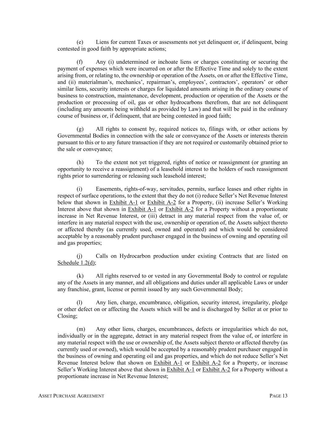 ASSET PURCHASE AGREEMENT PAGE 13 (e) Liens for current Taxes or assessments not yet delinquent or, if delinquent, being contested in good faith by appropriate actions; (f) Any (i) undetermined or inchoate liens or charges constituting or securing the payment of expenses which were incurred on or after the Effective Time and solely to the extent arising from, or relating to, the ownership or operation of the Assets, on or after the Effective Time, and (ii) materialman’s, mechanics’, repairman’s, employees’, contractors’, operators’ or other similar liens, security interests or charges for liquidated amounts arising in the ordinary course of business to construction, maintenance, development, production or operation of the Assets or the production or processing of oil, gas or other hydrocarbons therefrom, that are not delinquent (including any amounts being withheld as provided by Law) and that will be paid in the ordinary course of business or, if delinquent, that are being contested in good faith; (g) All rights to consent by, required notices to, filings with, or other actions by Governmental Bodies in connection with the sale or conveyance of the Assets or interests therein pursuant to this or to any future transaction if they are not required or customarily obtained prior to the sale or conveyance; (h) To the extent not yet triggered, rights of notice or reassignment (or granting an opportunity to receive a reassignment) of a leasehold interest to the holders of such reassignment rights prior to surrendering or releasing such leasehold interest; (i) Easements, rights-of-way, servitudes, permits, surface leases and other rights in respect of surface operations, to the extent that they do not (i) reduce Seller’s Net Revenue Interest below that shown in Exhibit A-1 or Exhibit A-2 for a Property, (ii) increase Seller’s Working Interest above that shown in Exhibit A-1 or Exhibit A-2 for a Property without a proportionate increase in Net Revenue Interest, or (iii) detract in any material respect from the value of, or interfere in any material respect with the use, ownership or operation of, the Assets subject thereto or affected thereby (as currently used, owned and operated) and which would be considered acceptable by a reasonably prudent purchaser engaged in the business of owning and operating oil and gas properties; (j) Calls on Hydrocarbon production under existing Contracts that are listed on Schedule 1.2(d); (k) All rights reserved to or vested in any Governmental Body to control or regulate any of the Assets in any manner, and all obligations and duties under all applicable Laws or under any franchise, grant, license or permit issued by any such Governmental Body; (l) Any lien, charge, encumbrance, obligation, security interest, irregularity, pledge or other defect on or affecting the Assets which will be and is discharged by Seller at or prior to Closing; (m) Any other liens, charges, encumbrances, defects or irregularities which do not, individually or in the aggregate, detract in any material respect from the value of, or interfere in any material respect with the use or ownership of, the Assets subject thereto or affected thereby (as currently used or owned), which would be accepted by a reasonably prudent purchaser engaged in the business of owning and operating oil and gas properties, and which do not reduce Seller’s Net Revenue Interest below that shown on Exhibit A-1 or Exhibit A-2 for a Property, or increase Seller’s Working Interest above that shown in Exhibit A-1 or Exhibit A-2 for a Property without a proportionate increase in Net Revenue Interest;