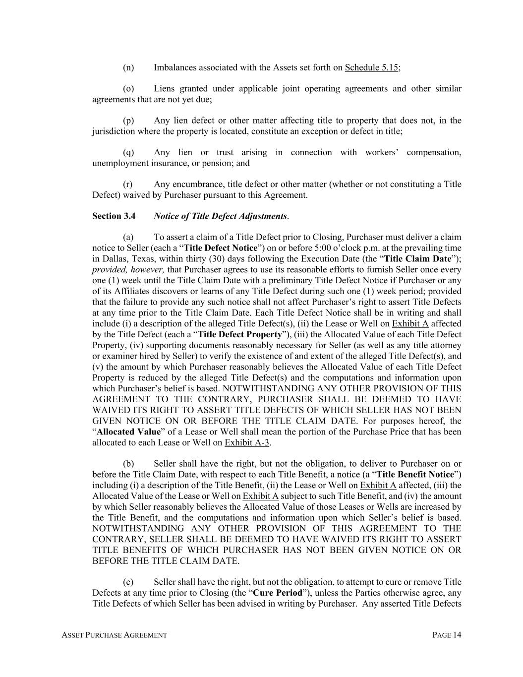 ASSET PURCHASE AGREEMENT PAGE 14 (n) Imbalances associated with the Assets set forth on Schedule 5.15; (o) Liens granted under applicable joint operating agreements and other similar agreements that are not yet due; (p) Any lien defect or other matter affecting title to property that does not, in the jurisdiction where the property is located, constitute an exception or defect in title; (q) Any lien or trust arising in connection with workers’ compensation, unemployment insurance, or pension; and (r) Any encumbrance, title defect or other matter (whether or not constituting a Title Defect) waived by Purchaser pursuant to this Agreement. Section 3.4 Notice of Title Defect Adjustments. (a) To assert a claim of a Title Defect prior to Closing, Purchaser must deliver a claim notice to Seller (each a “Title Defect Notice”) on or before 5:00 o’clock p.m. at the prevailing time in Dallas, Texas, within thirty (30) days following the Execution Date (the “Title Claim Date”); provided, however, that Purchaser agrees to use its reasonable efforts to furnish Seller once every one (1) week until the Title Claim Date with a preliminary Title Defect Notice if Purchaser or any of its Affiliates discovers or learns of any Title Defect during such one (1) week period; provided that the failure to provide any such notice shall not affect Purchaser’s right to assert Title Defects at any time prior to the Title Claim Date. Each Title Defect Notice shall be in writing and shall include (i) a description of the alleged Title Defect(s), (ii) the Lease or Well on Exhibit A affected by the Title Defect (each a “Title Defect Property”), (iii) the Allocated Value of each Title Defect Property, (iv) supporting documents reasonably necessary for Seller (as well as any title attorney or examiner hired by Seller) to verify the existence of and extent of the alleged Title Defect(s), and (v) the amount by which Purchaser reasonably believes the Allocated Value of each Title Defect Property is reduced by the alleged Title Defect(s) and the computations and information upon which Purchaser’s belief is based. NOTWITHSTANDING ANY OTHER PROVISION OF THIS AGREEMENT TO THE CONTRARY, PURCHASER SHALL BE DEEMED TO HAVE WAIVED ITS RIGHT TO ASSERT TITLE DEFECTS OF WHICH SELLER HAS NOT BEEN GIVEN NOTICE ON OR BEFORE THE TITLE CLAIM DATE. For purposes hereof, the “Allocated Value” of a Lease or Well shall mean the portion of the Purchase Price that has been allocated to each Lease or Well on Exhibit A-3. (b) Seller shall have the right, but not the obligation, to deliver to Purchaser on or before the Title Claim Date, with respect to each Title Benefit, a notice (a “Title Benefit Notice”) including (i) a description of the Title Benefit, (ii) the Lease or Well on Exhibit A affected, (iii) the Allocated Value of the Lease or Well on Exhibit A subject to such Title Benefit, and (iv) the amount by which Seller reasonably believes the Allocated Value of those Leases or Wells are increased by the Title Benefit, and the computations and information upon which Seller’s belief is based. NOTWITHSTANDING ANY OTHER PROVISION OF THIS AGREEMENT TO THE CONTRARY, SELLER SHALL BE DEEMED TO HAVE WAIVED ITS RIGHT TO ASSERT TITLE BENEFITS OF WHICH PURCHASER HAS NOT BEEN GIVEN NOTICE ON OR BEFORE THE TITLE CLAIM DATE. (c) Seller shall have the right, but not the obligation, to attempt to cure or remove Title Defects at any time prior to Closing (the “Cure Period”), unless the Parties otherwise agree, any Title Defects of which Seller has been advised in writing by Purchaser. Any asserted Title Defects