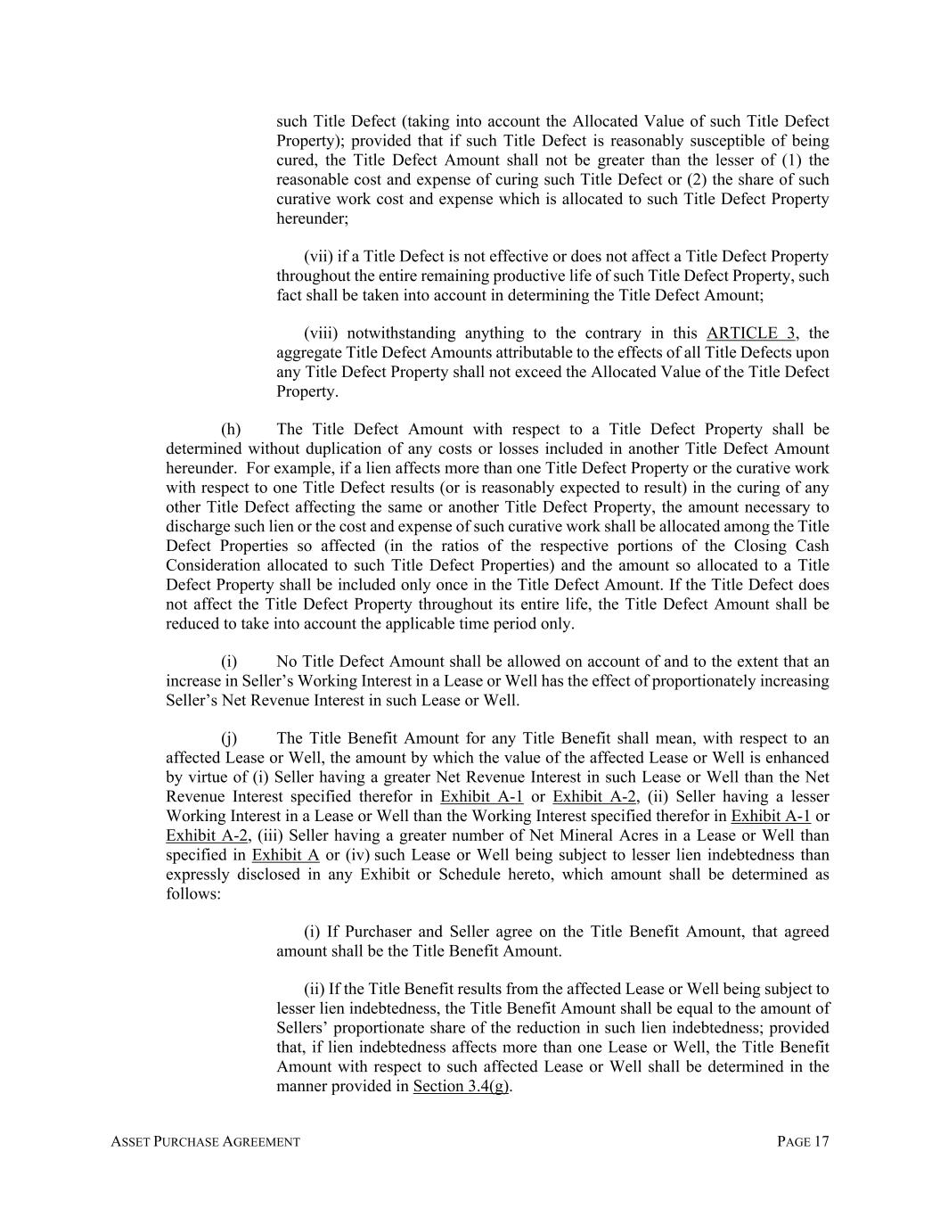 ASSET PURCHASE AGREEMENT PAGE 17 such Title Defect (taking into account the Allocated Value of such Title Defect Property); provided that if such Title Defect is reasonably susceptible of being cured, the Title Defect Amount shall not be greater than the lesser of (1) the reasonable cost and expense of curing such Title Defect or (2) the share of such curative work cost and expense which is allocated to such Title Defect Property hereunder; (vii) if a Title Defect is not effective or does not affect a Title Defect Property throughout the entire remaining productive life of such Title Defect Property, such fact shall be taken into account in determining the Title Defect Amount; (viii) notwithstanding anything to the contrary in this ARTICLE 3, the aggregate Title Defect Amounts attributable to the effects of all Title Defects upon any Title Defect Property shall not exceed the Allocated Value of the Title Defect Property. (h) The Title Defect Amount with respect to a Title Defect Property shall be determined without duplication of any costs or losses included in another Title Defect Amount hereunder. For example, if a lien affects more than one Title Defect Property or the curative work with respect to one Title Defect results (or is reasonably expected to result) in the curing of any other Title Defect affecting the same or another Title Defect Property, the amount necessary to discharge such lien or the cost and expense of such curative work shall be allocated among the Title Defect Properties so affected (in the ratios of the respective portions of the Closing Cash Consideration allocated to such Title Defect Properties) and the amount so allocated to a Title Defect Property shall be included only once in the Title Defect Amount. If the Title Defect does not affect the Title Defect Property throughout its entire life, the Title Defect Amount shall be reduced to take into account the applicable time period only. (i) No Title Defect Amount shall be allowed on account of and to the extent that an increase in Seller’s Working Interest in a Lease or Well has the effect of proportionately increasing Seller’s Net Revenue Interest in such Lease or Well. (j) The Title Benefit Amount for any Title Benefit shall mean, with respect to an affected Lease or Well, the amount by which the value of the affected Lease or Well is enhanced by virtue of (i) Seller having a greater Net Revenue Interest in such Lease or Well than the Net Revenue Interest specified therefor in Exhibit A-1 or Exhibit A-2, (ii) Seller having a lesser Working Interest in a Lease or Well than the Working Interest specified therefor in Exhibit A-1 or Exhibit A-2, (iii) Seller having a greater number of Net Mineral Acres in a Lease or Well than specified in Exhibit A or (iv) such Lease or Well being subject to lesser lien indebtedness than expressly disclosed in any Exhibit or Schedule hereto, which amount shall be determined as follows: (i) If Purchaser and Seller agree on the Title Benefit Amount, that agreed amount shall be the Title Benefit Amount. (ii) If the Title Benefit results from the affected Lease or Well being subject to lesser lien indebtedness, the Title Benefit Amount shall be equal to the amount of Sellers’ proportionate share of the reduction in such lien indebtedness; provided that, if lien indebtedness affects more than one Lease or Well, the Title Benefit Amount with respect to such affected Lease or Well shall be determined in the manner provided in Section 3.4(g).