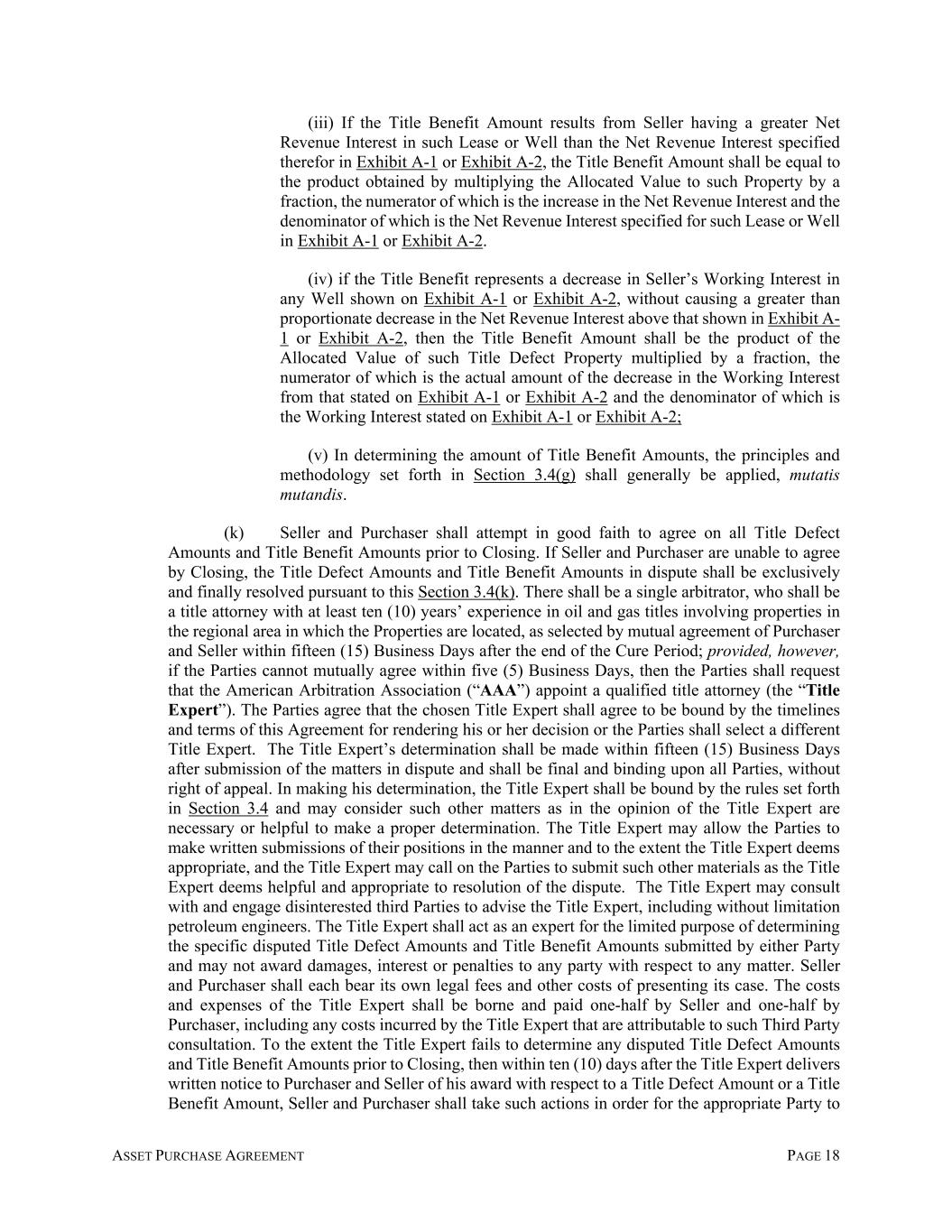 ASSET PURCHASE AGREEMENT PAGE 18 (iii) If the Title Benefit Amount results from Seller having a greater Net Revenue Interest in such Lease or Well than the Net Revenue Interest specified therefor in Exhibit A-1 or Exhibit A-2, the Title Benefit Amount shall be equal to the product obtained by multiplying the Allocated Value to such Property by a fraction, the numerator of which is the increase in the Net Revenue Interest and the denominator of which is the Net Revenue Interest specified for such Lease or Well in Exhibit A-1 or Exhibit A-2. (iv) if the Title Benefit represents a decrease in Seller’s Working Interest in any Well shown on Exhibit A-1 or Exhibit A-2, without causing a greater than proportionate decrease in the Net Revenue Interest above that shown in Exhibit A- 1 or Exhibit A-2, then the Title Benefit Amount shall be the product of the Allocated Value of such Title Defect Property multiplied by a fraction, the numerator of which is the actual amount of the decrease in the Working Interest from that stated on Exhibit A-1 or Exhibit A-2 and the denominator of which is the Working Interest stated on Exhibit A-1 or Exhibit A-2; (v) In determining the amount of Title Benefit Amounts, the principles and methodology set forth in Section 3.4(g) shall generally be applied, mutatis mutandis. (k) Seller and Purchaser shall attempt in good faith to agree on all Title Defect Amounts and Title Benefit Amounts prior to Closing. If Seller and Purchaser are unable to agree by Closing, the Title Defect Amounts and Title Benefit Amounts in dispute shall be exclusively and finally resolved pursuant to this Section 3.4(k). There shall be a single arbitrator, who shall be a title attorney with at least ten (10) years’ experience in oil and gas titles involving properties in the regional area in which the Properties are located, as selected by mutual agreement of Purchaser and Seller within fifteen (15) Business Days after the end of the Cure Period; provided, however, if the Parties cannot mutually agree within five (5) Business Days, then the Parties shall request that the American Arbitration Association (“AAA”) appoint a qualified title attorney (the “Title Expert”). The Parties agree that the chosen Title Expert shall agree to be bound by the timelines and terms of this Agreement for rendering his or her decision or the Parties shall select a different Title Expert. The Title Expert’s determination shall be made within fifteen (15) Business Days after submission of the matters in dispute and shall be final and binding upon all Parties, without right of appeal. In making his determination, the Title Expert shall be bound by the rules set forth in Section 3.4 and may consider such other matters as in the opinion of the Title Expert are necessary or helpful to make a proper determination. The Title Expert may allow the Parties to make written submissions of their positions in the manner and to the extent the Title Expert deems appropriate, and the Title Expert may call on the Parties to submit such other materials as the Title Expert deems helpful and appropriate to resolution of the dispute. The Title Expert may consult with and engage disinterested third Parties to advise the Title Expert, including without limitation petroleum engineers. The Title Expert shall act as an expert for the limited purpose of determining the specific disputed Title Defect Amounts and Title Benefit Amounts submitted by either Party and may not award damages, interest or penalties to any party with respect to any matter. Seller and Purchaser shall each bear its own legal fees and other costs of presenting its case. The costs and expenses of the Title Expert shall be borne and paid one-half by Seller and one-half by Purchaser, including any costs incurred by the Title Expert that are attributable to such Third Party consultation. To the extent the Title Expert fails to determine any disputed Title Defect Amounts and Title Benefit Amounts prior to Closing, then within ten (10) days after the Title Expert delivers written notice to Purchaser and Seller of his award with respect to a Title Defect Amount or a Title Benefit Amount, Seller and Purchaser shall take such actions in order for the appropriate Party to