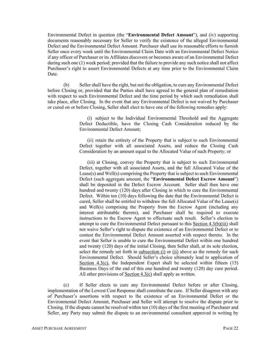 ASSET PURCHASE AGREEMENT PAGE 22 Environmental Defect in question (the “Environmental Defect Amount”), and (iv) supporting documents reasonably necessary for Seller to verify the existence of the alleged Environmental Defect and the Environmental Defect Amount. Purchaser shall use its reasonable efforts to furnish Seller once every week until the Environmental Claim Date with an Environmental Defect Notice if any officer of Purchaser or its Affiliates discovers or becomes aware of an Environmental Defect during such one (1) week period; provided that the failure to provide any such notice shall not affect Purchaser’s right to assert Environmental Defects at any time prior to the Environmental Claim Date. (b) Seller shall have the right, but not the obligation, to cure any Environmental Defect before Closing or, provided that the Parties shall have agreed to the general plan of remediation with respect to such Environmental Defect and the time period by which such remediation shall take place, after Closing. In the event that any Environmental Defect is not waived by Purchaser or cured on or before Closing, Seller shall elect to have one of the following remedies apply: (i) subject to the Individual Environmental Threshold and the Aggregate Defect Deductible, have the Closing Cash Consideration reduced by the Environmental Defect Amount; (ii) retain the entirety of the Property that is subject to such Environmental Defect together with all associated Assets, and reduce the Closing Cash Consideration by an amount equal to the Allocated Value of such Property; or (iii) at Closing, convey the Property that is subject to such Environmental Defect, together with all associated Assets, and the full Allocated Value of the Lease(s) and Well(s) comprising the Property that is subject to such Environmental Defect (such aggregate amount, the “Environmental Defect Escrow Amount”) shall be deposited in the Defect Escrow Account. Seller shall then have one hundred and twenty (120) days after Closing in which to cure the Environmental Defect. Within ten (10) days following the date that the Environmental Defect is cured, Seller shall be entitled to withdraw the full Allocated Value of the Lease(s) and Well(s) comprising the Property from the Escrow Agent (including any interest attributable thereto), and Purchaser shall be required to execute instructions to the Escrow Agent to effectuate such result. Seller’s election to attempt to cure the Environmental Defect pursuant to this Section 4.3(b)(iii) shall not waive Seller’s right to dispute the existence of an Environmental Defect or to contest the Environmental Defect Amount asserted with respect thereto. In the event that Seller is unable to cure the Environmental Defect within one hundred and twenty (120) days of the initial Closing, then Seller shall, at its sole election, select the remedy set forth in subsection (i) or (ii) above as the remedy for such Environmental Defect. Should Seller’s choice ultimately lead to application of Section 4.3(c), the Independent Expert shall be selected within fifteen (15) Business Days of the end of this one hundred and twenty (120) day cure period. All other provisions of Section 4.3(c) shall apply as written. (c) If Seller elects to cure any Environmental Defect before or after Closing, implementation of the Lowest Cost Response shall constitute the cure. If Seller disagrees with any of Purchaser’s assertions with respect to the existence of an Environmental Defect or the Environmental Defect Amount, Purchaser and Seller will attempt to resolve the dispute prior to Closing. If the dispute cannot be resolved within ten (10) days of the first meeting of Purchaser and Seller, any Party may submit the dispute to an environmental consultant approved in writing by