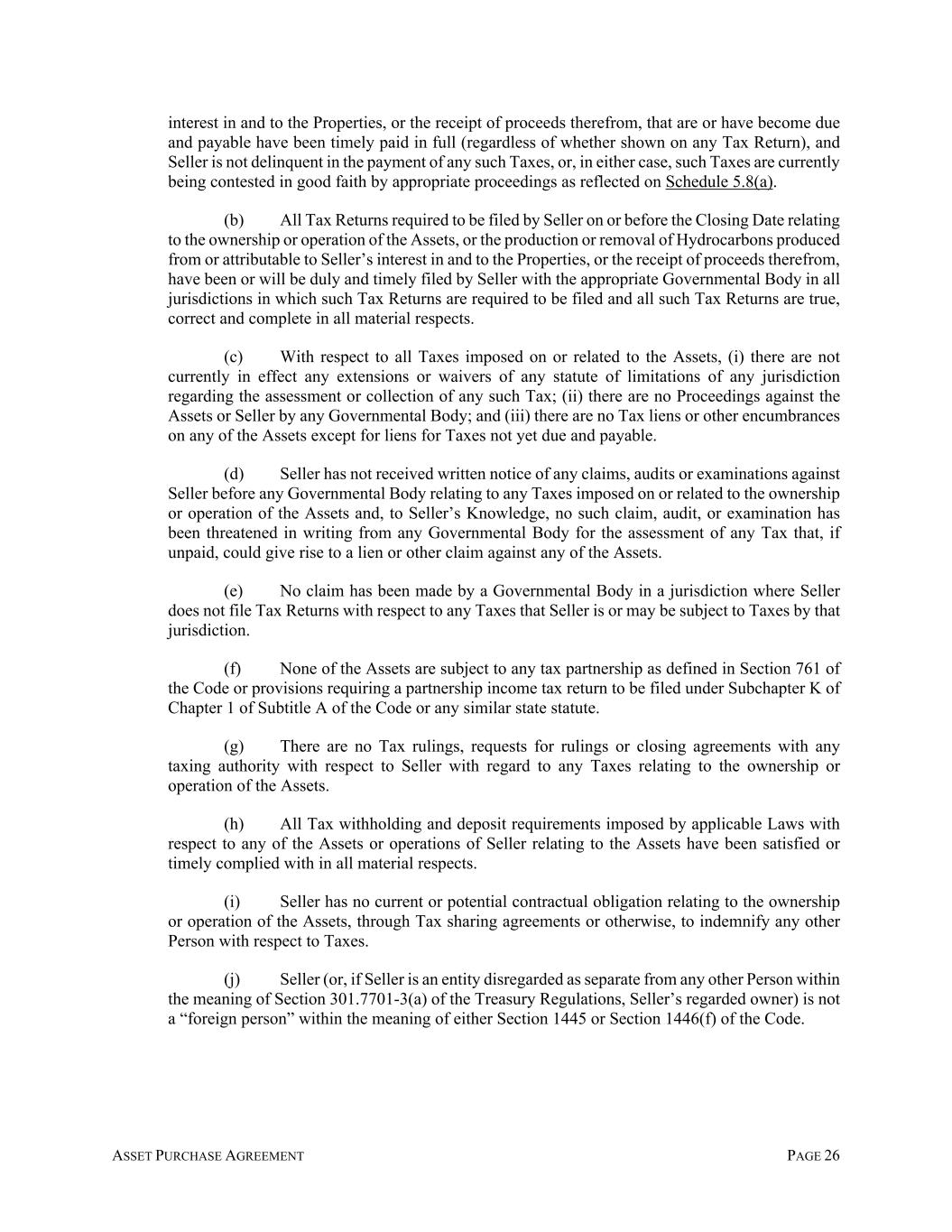 ASSET PURCHASE AGREEMENT PAGE 26 interest in and to the Properties, or the receipt of proceeds therefrom, that are or have become due and payable have been timely paid in full (regardless of whether shown on any Tax Return), and Seller is not delinquent in the payment of any such Taxes, or, in either case, such Taxes are currently being contested in good faith by appropriate proceedings as reflected on Schedule 5.8(a). (b) All Tax Returns required to be filed by Seller on or before the Closing Date relating to the ownership or operation of the Assets, or the production or removal of Hydrocarbons produced from or attributable to Seller’s interest in and to the Properties, or the receipt of proceeds therefrom, have been or will be duly and timely filed by Seller with the appropriate Governmental Body in all jurisdictions in which such Tax Returns are required to be filed and all such Tax Returns are true, correct and complete in all material respects. (c) With respect to all Taxes imposed on or related to the Assets, (i) there are not currently in effect any extensions or waivers of any statute of limitations of any jurisdiction regarding the assessment or collection of any such Tax; (ii) there are no Proceedings against the Assets or Seller by any Governmental Body; and (iii) there are no Tax liens or other encumbrances on any of the Assets except for liens for Taxes not yet due and payable. (d) Seller has not received written notice of any claims, audits or examinations against Seller before any Governmental Body relating to any Taxes imposed on or related to the ownership or operation of the Assets and, to Seller’s Knowledge, no such claim, audit, or examination has been threatened in writing from any Governmental Body for the assessment of any Tax that, if unpaid, could give rise to a lien or other claim against any of the Assets. (e) No claim has been made by a Governmental Body in a jurisdiction where Seller does not file Tax Returns with respect to any Taxes that Seller is or may be subject to Taxes by that jurisdiction. (f) None of the Assets are subject to any tax partnership as defined in Section 761 of the Code or provisions requiring a partnership income tax return to be filed under Subchapter K of Chapter 1 of Subtitle A of the Code or any similar state statute. (g) There are no Tax rulings, requests for rulings or closing agreements with any taxing authority with respect to Seller with regard to any Taxes relating to the ownership or operation of the Assets. (h) All Tax withholding and deposit requirements imposed by applicable Laws with respect to any of the Assets or operations of Seller relating to the Assets have been satisfied or timely complied with in all material respects. (i) Seller has no current or potential contractual obligation relating to the ownership or operation of the Assets, through Tax sharing agreements or otherwise, to indemnify any other Person with respect to Taxes. (j) Seller (or, if Seller is an entity disregarded as separate from any other Person within the meaning of Section 301.7701-3(a) of the Treasury Regulations, Seller’s regarded owner) is not a “foreign person” within the meaning of either Section 1445 or Section 1446(f) of the Code.