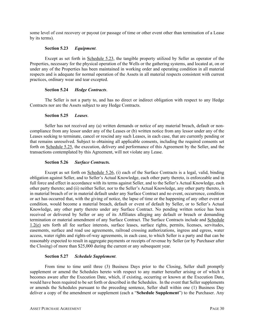 ASSET PURCHASE AGREEMENT PAGE 30 some level of cost recovery or payout (or passage of time or other event other than termination of a Lease by its terms). Section 5.23 Equipment. Except as set forth in Schedule 5.23, the tangible property utilized by Seller as operator of the Properties, necessary for the physical operation of the Wells or the gathering systems, and located at, on or under any of the Properties has been maintained in working order and operating condition in all material respects and is adequate for normal operation of the Assets in all material respects consistent with current practices, ordinary wear and tear excepted. Section 5.24 Hedge Contracts. The Seller is not a party to, and has no direct or indirect obligation with respect to any Hedge Contracts nor are the Assets subject to any Hedge Contracts. Section 5.25 Leases. Seller has not received any (a) written demands or notice of any material breach, default or non- compliance from any lessor under any of the Leases or (b) written notice from any lessor under any of the Leases seeking to terminate, cancel or rescind any such Leases, in each case, that are currently pending or that remains unresolved. Subject to obtaining all applicable consents, including the required consents set forth on Schedule 5.25, the execution, delivery and performance of this Agreement by the Seller, and the transactions contemplated by this Agreement, will not violate any Lease. Section 5.26 Surface Contracts. Except as set forth on Schedule 5.26, (i) each of the Surface Contracts is a legal, valid, binding obligation against Seller, and to Seller’s Actual Knowledge, each other party thereto, is enforceable and in full force and effect in accordance with its terms against Seller, and to the Seller’s Actual Knowledge, each other party thereto; and (ii) neither Seller, nor to the Seller’s Actual Knowledge, any other party thereto, is in material breach of or in material default under any Surface Contract and no event, occurrence, condition or act has occurred that, with the giving of notice, the lapse of time or the happening of any other event or condition, would become a material breach, default or event of default by Seller, or to Seller’s Actual Knowledge, any other party thereto under any Surface Contract. No pending written notice has been received or delivered by Seller or any of its Affiliates alleging any default or breach or demanding termination or material amendment of any Surface Contract. The Surface Contracts include and Schedule 1.2(e) sets forth all fee surface interests, surface leases, surface rights, permits, licenses, servitudes, easements, surface and road use agreements, railroad crossing authorizations, ingress and egress, water access, water rights and rights-of-way agreements, in each case, to which Seller is a party and that can be reasonably expected to result in aggregate payments or receipts of revenue by Seller (or by Purchaser after the Closing) of more than $25,000 during the current or any subsequent year. Section 5.27 Schedule Supplement. From time to time until three (3) Business Days prior to the Closing, Seller shall promptly supplement or amend the Schedules hereto with respect to any matter hereafter arising or of which it becomes aware after the Execution Date, which, if existing, occurring or known at the Execution Date, would have been required to be set forth or described in the Schedules. In the event that Seller supplements or amends the Schedules pursuant to the preceding sentence, Seller shall within one (1) Business Day deliver a copy of the amendment or supplement (each a “Schedule Supplement”) to the Purchaser. Any