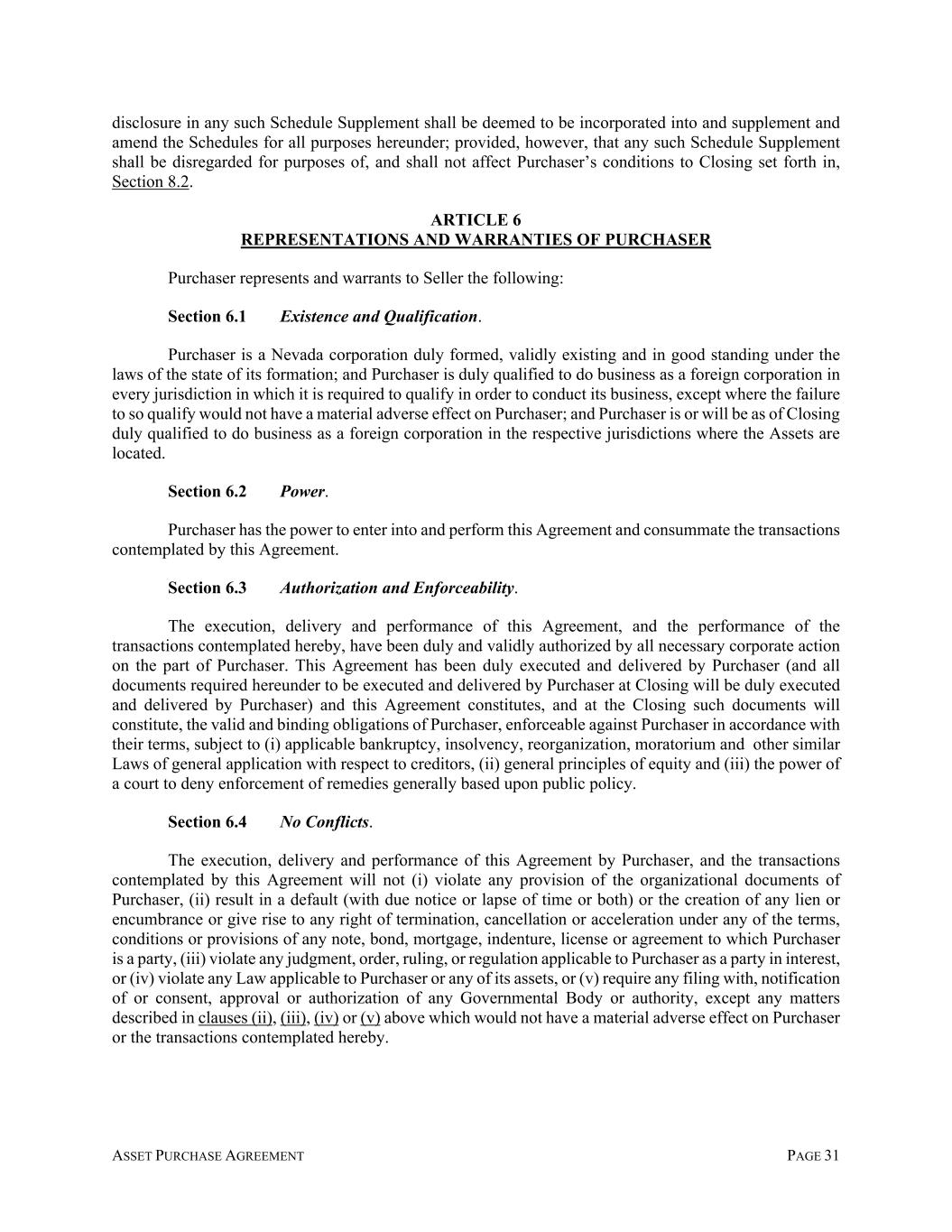 ASSET PURCHASE AGREEMENT PAGE 31 disclosure in any such Schedule Supplement shall be deemed to be incorporated into and supplement and amend the Schedules for all purposes hereunder; provided, however, that any such Schedule Supplement shall be disregarded for purposes of, and shall not affect Purchaser’s conditions to Closing set forth in, Section 8.2. ARTICLE 6 REPRESENTATIONS AND WARRANTIES OF PURCHASER Purchaser represents and warrants to Seller the following: Section 6.1 Existence and Qualification. Purchaser is a Nevada corporation duly formed, validly existing and in good standing under the laws of the state of its formation; and Purchaser is duly qualified to do business as a foreign corporation in every jurisdiction in which it is required to qualify in order to conduct its business, except where the failure to so qualify would not have a material adverse effect on Purchaser; and Purchaser is or will be as of Closing duly qualified to do business as a foreign corporation in the respective jurisdictions where the Assets are located. Section 6.2 Power. Purchaser has the power to enter into and perform this Agreement and consummate the transactions contemplated by this Agreement. Section 6.3 Authorization and Enforceability. The execution, delivery and performance of this Agreement, and the performance of the transactions contemplated hereby, have been duly and validly authorized by all necessary corporate action on the part of Purchaser. This Agreement has been duly executed and delivered by Purchaser (and all documents required hereunder to be executed and delivered by Purchaser at Closing will be duly executed and delivered by Purchaser) and this Agreement constitutes, and at the Closing such documents will constitute, the valid and binding obligations of Purchaser, enforceable against Purchaser in accordance with their terms, subject to (i) applicable bankruptcy, insolvency, reorganization, moratorium and other similar Laws of general application with respect to creditors, (ii) general principles of equity and (iii) the power of a court to deny enforcement of remedies generally based upon public policy. Section 6.4 No Conflicts. The execution, delivery and performance of this Agreement by Purchaser, and the transactions contemplated by this Agreement will not (i) violate any provision of the organizational documents of Purchaser, (ii) result in a default (with due notice or lapse of time or both) or the creation of any lien or encumbrance or give rise to any right of termination, cancellation or acceleration under any of the terms, conditions or provisions of any note, bond, mortgage, indenture, license or agreement to which Purchaser is a party, (iii) violate any judgment, order, ruling, or regulation applicable to Purchaser as a party in interest, or (iv) violate any Law applicable to Purchaser or any of its assets, or (v) require any filing with, notification of or consent, approval or authorization of any Governmental Body or authority, except any matters described in clauses (ii), (iii), (iv) or (v) above which would not have a material adverse effect on Purchaser or the transactions contemplated hereby.