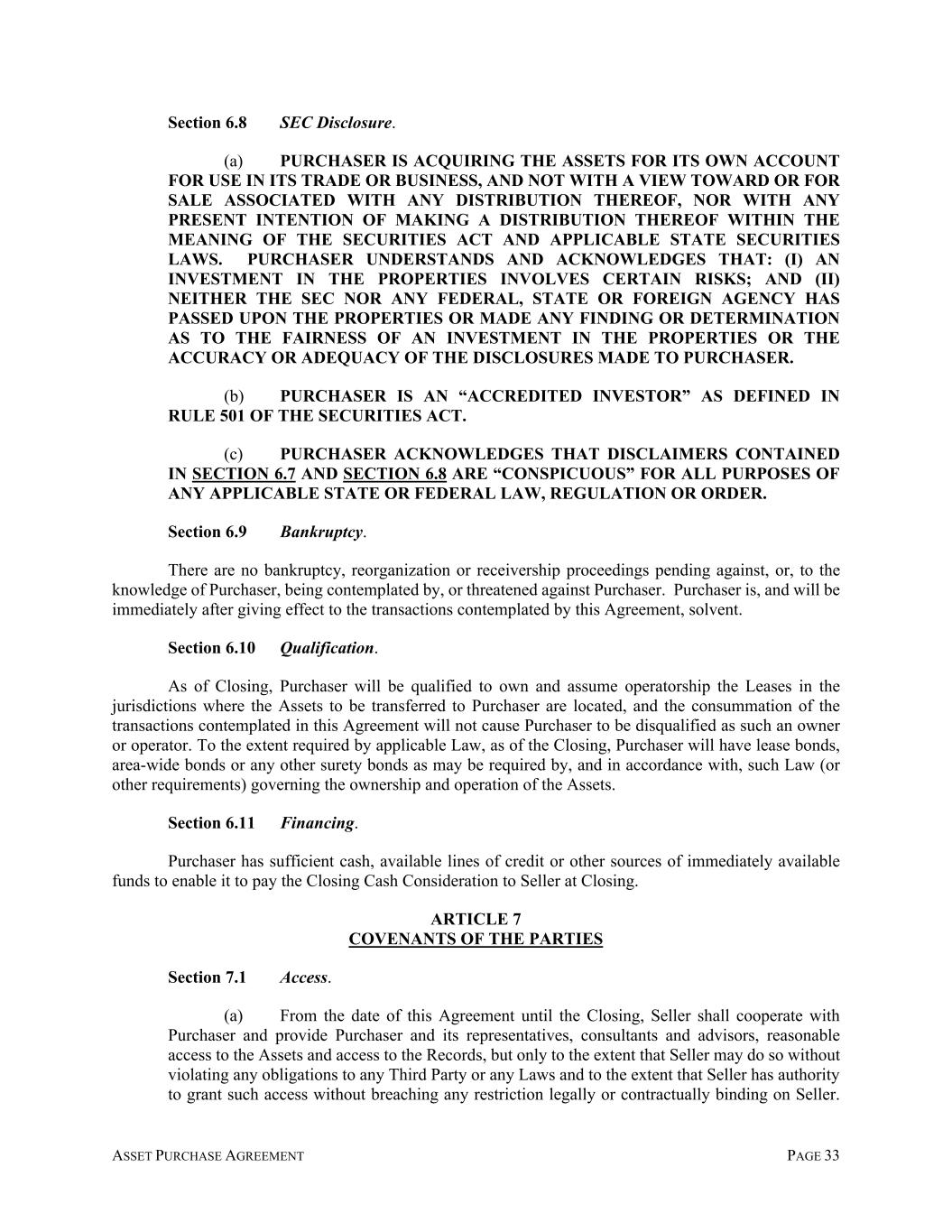 ASSET PURCHASE AGREEMENT PAGE 33 Section 6.8 SEC Disclosure. (a) PURCHASER IS ACQUIRING THE ASSETS FOR ITS OWN ACCOUNT FOR USE IN ITS TRADE OR BUSINESS, AND NOT WITH A VIEW TOWARD OR FOR SALE ASSOCIATED WITH ANY DISTRIBUTION THEREOF, NOR WITH ANY PRESENT INTENTION OF MAKING A DISTRIBUTION THEREOF WITHIN THE MEANING OF THE SECURITIES ACT AND APPLICABLE STATE SECURITIES LAWS. PURCHASER UNDERSTANDS AND ACKNOWLEDGES THAT: (I) AN INVESTMENT IN THE PROPERTIES INVOLVES CERTAIN RISKS; AND (II) NEITHER THE SEC NOR ANY FEDERAL, STATE OR FOREIGN AGENCY HAS PASSED UPON THE PROPERTIES OR MADE ANY FINDING OR DETERMINATION AS TO THE FAIRNESS OF AN INVESTMENT IN THE PROPERTIES OR THE ACCURACY OR ADEQUACY OF THE DISCLOSURES MADE TO PURCHASER. (b) PURCHASER IS AN “ACCREDITED INVESTOR” AS DEFINED IN RULE 501 OF THE SECURITIES ACT. (c) PURCHASER ACKNOWLEDGES THAT DISCLAIMERS CONTAINED IN SECTION 6.7 AND SECTION 6.8 ARE “CONSPICUOUS” FOR ALL PURPOSES OF ANY APPLICABLE STATE OR FEDERAL LAW, REGULATION OR ORDER. Section 6.9 Bankruptcy. There are no bankruptcy, reorganization or receivership proceedings pending against, or, to the knowledge of Purchaser, being contemplated by, or threatened against Purchaser. Purchaser is, and will be immediately after giving effect to the transactions contemplated by this Agreement, solvent. Section 6.10 Qualification. As of Closing, Purchaser will be qualified to own and assume operatorship the Leases in the jurisdictions where the Assets to be transferred to Purchaser are located, and the consummation of the transactions contemplated in this Agreement will not cause Purchaser to be disqualified as such an owner or operator. To the extent required by applicable Law, as of the Closing, Purchaser will have lease bonds, area-wide bonds or any other surety bonds as may be required by, and in accordance with, such Law (or other requirements) governing the ownership and operation of the Assets. Section 6.11 Financing. Purchaser has sufficient cash, available lines of credit or other sources of immediately available funds to enable it to pay the Closing Cash Consideration to Seller at Closing. ARTICLE 7 COVENANTS OF THE PARTIES Section 7.1 Access. (a) From the date of this Agreement until the Closing, Seller shall cooperate with Purchaser and provide Purchaser and its representatives, consultants and advisors, reasonable access to the Assets and access to the Records, but only to the extent that Seller may do so without violating any obligations to any Third Party or any Laws and to the extent that Seller has authority to grant such access without breaching any restriction legally or contractually binding on Seller.