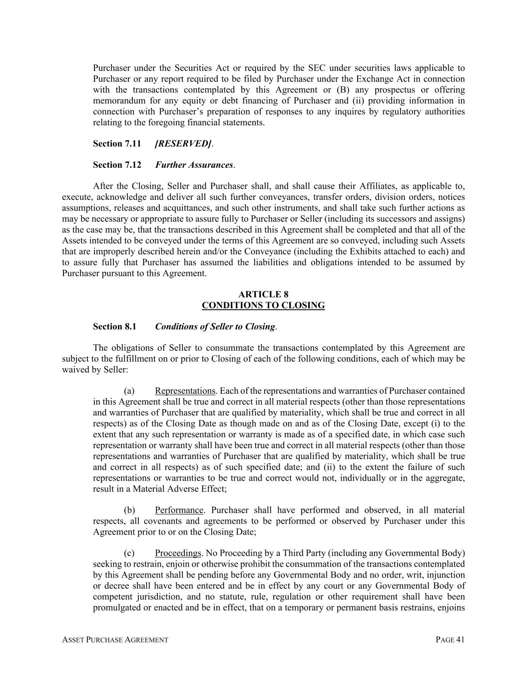 ASSET PURCHASE AGREEMENT PAGE 41 Purchaser under the Securities Act or required by the SEC under securities laws applicable to Purchaser or any report required to be filed by Purchaser under the Exchange Act in connection with the transactions contemplated by this Agreement or (B) any prospectus or offering memorandum for any equity or debt financing of Purchaser and (ii) providing information in connection with Purchaser’s preparation of responses to any inquires by regulatory authorities relating to the foregoing financial statements. Section 7.11 [RESERVED]. Section 7.12 Further Assurances. After the Closing, Seller and Purchaser shall, and shall cause their Affiliates, as applicable to, execute, acknowledge and deliver all such further conveyances, transfer orders, division orders, notices assumptions, releases and acquittances, and such other instruments, and shall take such further actions as may be necessary or appropriate to assure fully to Purchaser or Seller (including its successors and assigns) as the case may be, that the transactions described in this Agreement shall be completed and that all of the Assets intended to be conveyed under the terms of this Agreement are so conveyed, including such Assets that are improperly described herein and/or the Conveyance (including the Exhibits attached to each) and to assure fully that Purchaser has assumed the liabilities and obligations intended to be assumed by Purchaser pursuant to this Agreement. ARTICLE 8 CONDITIONS TO CLOSING Section 8.1 Conditions of Seller to Closing. The obligations of Seller to consummate the transactions contemplated by this Agreement are subject to the fulfillment on or prior to Closing of each of the following conditions, each of which may be waived by Seller: (a) Representations. Each of the representations and warranties of Purchaser contained in this Agreement shall be true and correct in all material respects (other than those representations and warranties of Purchaser that are qualified by materiality, which shall be true and correct in all respects) as of the Closing Date as though made on and as of the Closing Date, except (i) to the extent that any such representation or warranty is made as of a specified date, in which case such representation or warranty shall have been true and correct in all material respects (other than those representations and warranties of Purchaser that are qualified by materiality, which shall be true and correct in all respects) as of such specified date; and (ii) to the extent the failure of such representations or warranties to be true and correct would not, individually or in the aggregate, result in a Material Adverse Effect; (b) Performance. Purchaser shall have performed and observed, in all material respects, all covenants and agreements to be performed or observed by Purchaser under this Agreement prior to or on the Closing Date; (c) Proceedings. No Proceeding by a Third Party (including any Governmental Body) seeking to restrain, enjoin or otherwise prohibit the consummation of the transactions contemplated by this Agreement shall be pending before any Governmental Body and no order, writ, injunction or decree shall have been entered and be in effect by any court or any Governmental Body of competent jurisdiction, and no statute, rule, regulation or other requirement shall have been promulgated or enacted and be in effect, that on a temporary or permanent basis restrains, enjoins