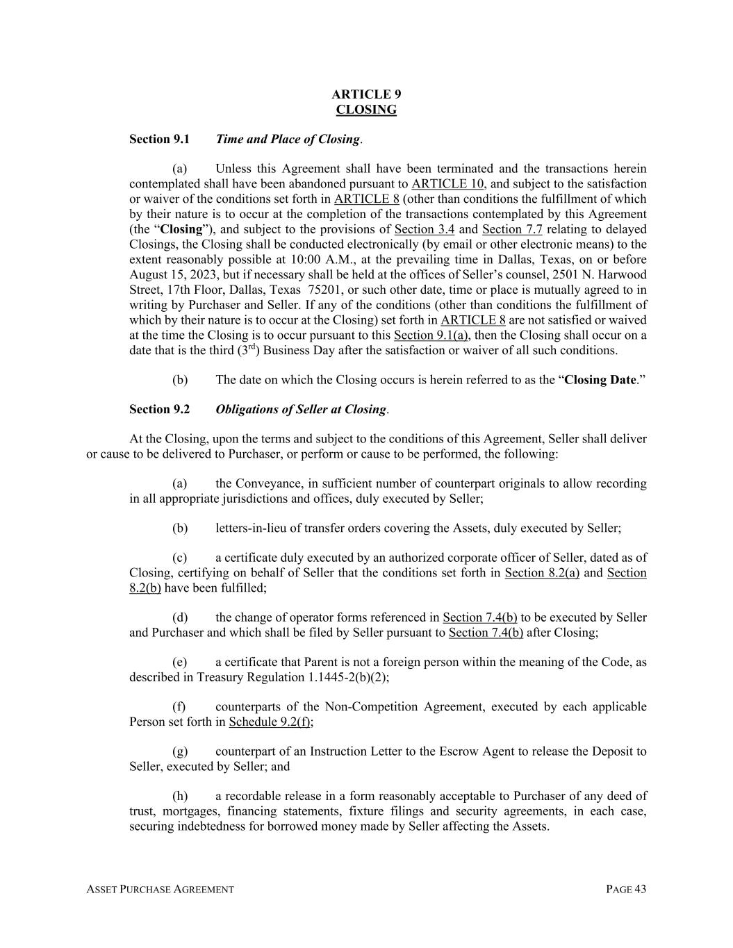 ASSET PURCHASE AGREEMENT PAGE 43 ARTICLE 9 CLOSING Section 9.1 Time and Place of Closing. (a) Unless this Agreement shall have been terminated and the transactions herein contemplated shall have been abandoned pursuant to ARTICLE 10, and subject to the satisfaction or waiver of the conditions set forth in ARTICLE 8 (other than conditions the fulfillment of which by their nature is to occur at the completion of the transactions contemplated by this Agreement (the “Closing”), and subject to the provisions of Section 3.4 and Section 7.7 relating to delayed Closings, the Closing shall be conducted electronically (by email or other electronic means) to the extent reasonably possible at 10:00 A.M., at the prevailing time in Dallas, Texas, on or before August 15, 2023, but if necessary shall be held at the offices of Seller’s counsel, 2501 N. Harwood Street, 17th Floor, Dallas, Texas 75201, or such other date, time or place is mutually agreed to in writing by Purchaser and Seller. If any of the conditions (other than conditions the fulfillment of which by their nature is to occur at the Closing) set forth in ARTICLE 8 are not satisfied or waived at the time the Closing is to occur pursuant to this Section 9.1(a), then the Closing shall occur on a date that is the third (3rd) Business Day after the satisfaction or waiver of all such conditions. (b) The date on which the Closing occurs is herein referred to as the “Closing Date.” Section 9.2 Obligations of Seller at Closing. At the Closing, upon the terms and subject to the conditions of this Agreement, Seller shall deliver or cause to be delivered to Purchaser, or perform or cause to be performed, the following: (a) the Conveyance, in sufficient number of counterpart originals to allow recording in all appropriate jurisdictions and offices, duly executed by Seller; (b) letters-in-lieu of transfer orders covering the Assets, duly executed by Seller; (c) a certificate duly executed by an authorized corporate officer of Seller, dated as of Closing, certifying on behalf of Seller that the conditions set forth in Section 8.2(a) and Section 8.2(b) have been fulfilled; (d) the change of operator forms referenced in Section 7.4(b) to be executed by Seller and Purchaser and which shall be filed by Seller pursuant to Section 7.4(b) after Closing; (e) a certificate that Parent is not a foreign person within the meaning of the Code, as described in Treasury Regulation 1.1445-2(b)(2); (f) counterparts of the Non-Competition Agreement, executed by each applicable Person set forth in Schedule 9.2(f); (g) counterpart of an Instruction Letter to the Escrow Agent to release the Deposit to Seller, executed by Seller; and (h) a recordable release in a form reasonably acceptable to Purchaser of any deed of trust, mortgages, financing statements, fixture filings and security agreements, in each case, securing indebtedness for borrowed money made by Seller affecting the Assets.