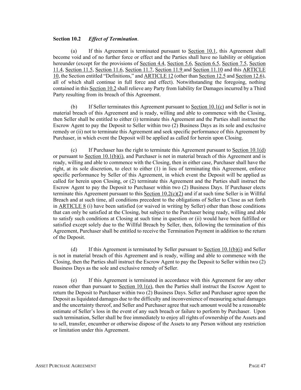 ASSET PURCHASE AGREEMENT PAGE 47 Section 10.2 Effect of Termination. (a) If this Agreement is terminated pursuant to Section 10.1, this Agreement shall become void and of no further force or effect and the Parties shall have no liability or obligation hereunder (except for the provisions of Section 4.4, Section 5.6, Section 6.5, Section 7.5, Section 11.4, Section 11.5, Section 11.6, Section 11.7, Section 11.9 and Section 11.10 and this ARTICLE 10, the Section entitled “Definitions,” and ARTICLE 12 (other than Section 12.5 and Section 12.6), all of which shall continue in full force and effect). Notwithstanding the foregoing, nothing contained in this Section 10.2 shall relieve any Party from liability for Damages incurred by a Third Party resulting from its breach of this Agreement. (b) If Seller terminates this Agreement pursuant to Section 10.1(c) and Seller is not in material breach of this Agreement and is ready, willing and able to commence with the Closing, then Seller shall be entitled to either (i) terminate this Agreement and the Parties shall instruct the Escrow Agent to pay the Deposit to Seller within two (2) Business Days as its sole and exclusive remedy or (ii) not to terminate this Agreement and seek specific performance of this Agreement by Purchaser, in which event the Deposit will be applied as called for herein upon Closing. (c) If Purchaser has the right to terminate this Agreement pursuant to Section 10.1(d) or pursuant to Section 10.1(b)(i), and Purchaser is not in material breach of this Agreement and is ready, willing and able to commence with the Closing, then in either case, Purchaser shall have the right, at its sole discretion, to elect to either (1) in lieu of terminating this Agreement, enforce specific performance by Seller of this Agreement, in which event the Deposit will be applied as called for herein upon Closing, or (2) terminate this Agreement and the Parties shall instruct the Escrow Agent to pay the Deposit to Purchaser within two (2) Business Days. If Purchaser elects terminate this Agreement pursuant to this Section 10.2(c)(2) and if at such time Seller is in Willful Breach and at such time, all conditions precedent to the obligations of Seller to Close as set forth in ARTICLE 8 (i) have been satisfied (or waived in writing by Seller) other than those conditions that can only be satisfied at the Closing, but subject to the Purchaser being ready, willing and able to satisfy such conditions at Closing at such time in question or (ii) would have been fulfilled or satisfied except solely due to the Willful Breach by Seller, then, following the termination of this Agreement, Purchaser shall be entitled to receive the Termination Payment in addition to the return of the Deposit. (d) If this Agreement is terminated by Seller pursuant to Section 10.1(b)(i) and Seller is not in material breach of this Agreement and is ready, willing and able to commence with the Closing, then the Parties shall instruct the Escrow Agent to pay the Deposit to Seller within two (2) Business Days as the sole and exclusive remedy of Seller. (e) If this Agreement is terminated in accordance with this Agreement for any other reason other than pursuant to Section 10.1(e), then the Parties shall instruct the Escrow Agent to return the Deposit to Purchaser within two (2) Business Days. Seller and Purchaser agree upon the Deposit as liquidated damages due to the difficulty and inconvenience of measuring actual damages and the uncertainty thereof, and Seller and Purchaser agree that such amount would be a reasonable estimate of Seller’s loss in the event of any such breach or failure to perform by Purchaser. Upon such termination, Seller shall be free immediately to enjoy all rights of ownership of the Assets and to sell, transfer, encumber or otherwise dispose of the Assets to any Person without any restriction or limitation under this Agreement.