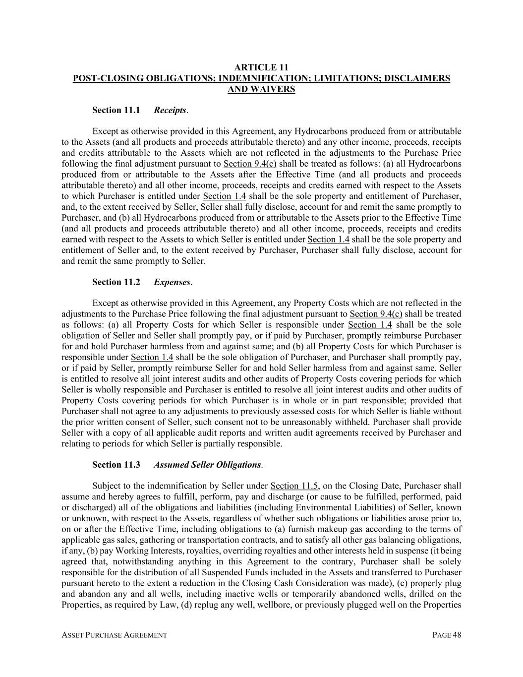 ASSET PURCHASE AGREEMENT PAGE 48 ARTICLE 11 POST-CLOSING OBLIGATIONS; INDEMNIFICATION; LIMITATIONS; DISCLAIMERS AND WAIVERS Section 11.1 Receipts. Except as otherwise provided in this Agreement, any Hydrocarbons produced from or attributable to the Assets (and all products and proceeds attributable thereto) and any other income, proceeds, receipts and credits attributable to the Assets which are not reflected in the adjustments to the Purchase Price following the final adjustment pursuant to Section 9.4(c) shall be treated as follows: (a) all Hydrocarbons produced from or attributable to the Assets after the Effective Time (and all products and proceeds attributable thereto) and all other income, proceeds, receipts and credits earned with respect to the Assets to which Purchaser is entitled under Section 1.4 shall be the sole property and entitlement of Purchaser, and, to the extent received by Seller, Seller shall fully disclose, account for and remit the same promptly to Purchaser, and (b) all Hydrocarbons produced from or attributable to the Assets prior to the Effective Time (and all products and proceeds attributable thereto) and all other income, proceeds, receipts and credits earned with respect to the Assets to which Seller is entitled under Section 1.4 shall be the sole property and entitlement of Seller and, to the extent received by Purchaser, Purchaser shall fully disclose, account for and remit the same promptly to Seller. Section 11.2 Expenses. Except as otherwise provided in this Agreement, any Property Costs which are not reflected in the adjustments to the Purchase Price following the final adjustment pursuant to Section 9.4(c) shall be treated as follows: (a) all Property Costs for which Seller is responsible under Section 1.4 shall be the sole obligation of Seller and Seller shall promptly pay, or if paid by Purchaser, promptly reimburse Purchaser for and hold Purchaser harmless from and against same; and (b) all Property Costs for which Purchaser is responsible under Section 1.4 shall be the sole obligation of Purchaser, and Purchaser shall promptly pay, or if paid by Seller, promptly reimburse Seller for and hold Seller harmless from and against same. Seller is entitled to resolve all joint interest audits and other audits of Property Costs covering periods for which Seller is wholly responsible and Purchaser is entitled to resolve all joint interest audits and other audits of Property Costs covering periods for which Purchaser is in whole or in part responsible; provided that Purchaser shall not agree to any adjustments to previously assessed costs for which Seller is liable without the prior written consent of Seller, such consent not to be unreasonably withheld. Purchaser shall provide Seller with a copy of all applicable audit reports and written audit agreements received by Purchaser and relating to periods for which Seller is partially responsible. Section 11.3 Assumed Seller Obligations. Subject to the indemnification by Seller under Section 11.5, on the Closing Date, Purchaser shall assume and hereby agrees to fulfill, perform, pay and discharge (or cause to be fulfilled, performed, paid or discharged) all of the obligations and liabilities (including Environmental Liabilities) of Seller, known or unknown, with respect to the Assets, regardless of whether such obligations or liabilities arose prior to, on or after the Effective Time, including obligations to (a) furnish makeup gas according to the terms of applicable gas sales, gathering or transportation contracts, and to satisfy all other gas balancing obligations, if any, (b) pay Working Interests, royalties, overriding royalties and other interests held in suspense (it being agreed that, notwithstanding anything in this Agreement to the contrary, Purchaser shall be solely responsible for the distribution of all Suspended Funds included in the Assets and transferred to Purchaser pursuant hereto to the extent a reduction in the Closing Cash Consideration was made), (c) properly plug and abandon any and all wells, including inactive wells or temporarily abandoned wells, drilled on the Properties, as required by Law, (d) replug any well, wellbore, or previously plugged well on the Properties