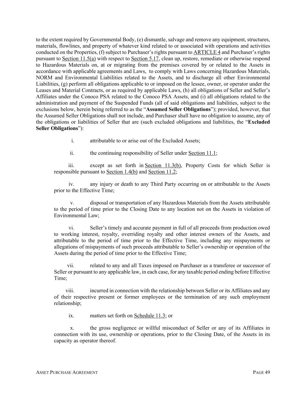 ASSET PURCHASE AGREEMENT PAGE 49 to the extent required by Governmental Body, (e) dismantle, salvage and remove any equipment, structures, materials, flowlines, and property of whatever kind related to or associated with operations and activities conducted on the Properties, (f) subject to Purchaser’s rights pursuant to ARTICLE 4 and Purchaser’s rights pursuant to Section 11.5(a) with respect to Section 5.17, clean up, restore, remediate or otherwise respond to Hazardous Materials on, at or migrating from the premises covered by or related to the Assets in accordance with applicable agreements and Laws, to comply with Laws concerning Hazardous Materials, NORM and Environmental Liabilities related to the Assets, and to discharge all other Environmental Liabilities, (g) perform all obligations applicable to or imposed on the lessee, owner, or operator under the Leases and Material Contracts, or as required by applicable Laws, (h) all obligations of Seller and Seller’s Affiliates under the Conoco PSA related to the Conoco PSA Assets, and (i) all obligations related to the administration and payment of the Suspended Funds (all of said obligations and liabilities, subject to the exclusions below, herein being referred to as the “Assumed Seller Obligations”); provided, however, that the Assumed Seller Obligations shall not include, and Purchaser shall have no obligation to assume, any of the obligations or liabilities of Seller that are (such excluded obligations and liabilities, the “Excluded Seller Obligations”): i. attributable to or arise out of the Excluded Assets; ii. the continuing responsibility of Seller under Section 11.1; iii. except as set forth in Section 11.3(b), Property Costs for which Seller is responsible pursuant to Section 1.4(b) and Section 11.2; iv. any injury or death to any Third Party occurring on or attributable to the Assets prior to the Effective Time; v. disposal or transportation of any Hazardous Materials from the Assets attributable to the period of time prior to the Closing Date to any location not on the Assets in violation of Environmental Law; vi. Seller’s timely and accurate payment in full of all proceeds from production owed to working interest, royalty, overriding royalty and other interest owners of the Assets, and attributable to the period of time prior to the Effective Time, including any mispayments or allegations of mispayments of such proceeds attributable to Seller’s ownership or operation of the Assets during the period of time prior to the Effective Time; vii. related to any and all Taxes imposed on Purchaser as a transferee or successor of Seller or pursuant to any applicable law, in each case, for any taxable period ending before Effective Time; viii. incurred in connection with the relationship between Seller or its Affiliates and any of their respective present or former employees or the termination of any such employment relationship; ix. matters set forth on Schedule 11.3; or x. the gross negligence or willful misconduct of Seller or any of its Affiliates in connection with its use, ownership or operations, prior to the Closing Date, of the Assets in its capacity as operator thereof.