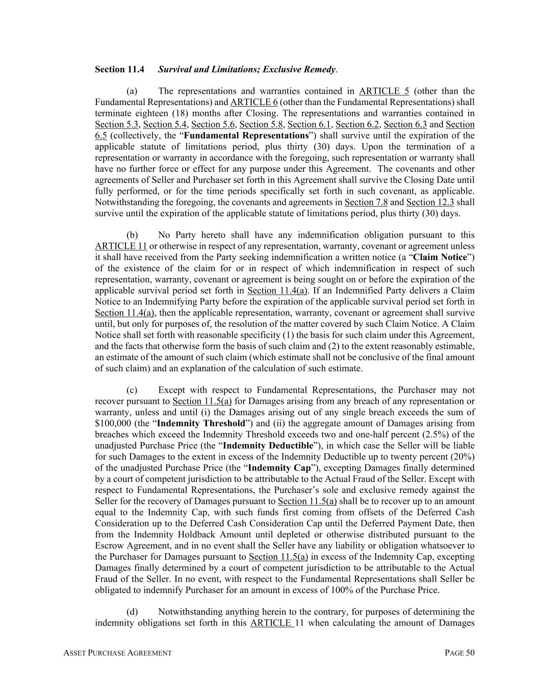 ASSET PURCHASE AGREEMENT PAGE 50 Section 11.4 Survival and Limitations; Exclusive Remedy. (a) The representations and warranties contained in ARTICLE 5 (other than the Fundamental Representations) and ARTICLE 6 (other than the Fundamental Representations) shall terminate eighteen (18) months after Closing. The representations and warranties contained in Section 5.3, Section 5.4, Section 5.6, Section 5.8, Section 6.1, Section 6.2, Section 6.3 and Section 6.5 (collectively, the “Fundamental Representations”) shall survive until the expiration of the applicable statute of limitations period, plus thirty (30) days. Upon the termination of a representation or warranty in accordance with the foregoing, such representation or warranty shall have no further force or effect for any purpose under this Agreement. The covenants and other agreements of Seller and Purchaser set forth in this Agreement shall survive the Closing Date until fully performed, or for the time periods specifically set forth in such covenant, as applicable. Notwithstanding the foregoing, the covenants and agreements in Section 7.8 and Section 12.3 shall survive until the expiration of the applicable statute of limitations period, plus thirty (30) days. (b) No Party hereto shall have any indemnification obligation pursuant to this ARTICLE 11 or otherwise in respect of any representation, warranty, covenant or agreement unless it shall have received from the Party seeking indemnification a written notice (a “Claim Notice”) of the existence of the claim for or in respect of which indemnification in respect of such representation, warranty, covenant or agreement is being sought on or before the expiration of the applicable survival period set forth in Section 11.4(a). If an Indemnified Party delivers a Claim Notice to an Indemnifying Party before the expiration of the applicable survival period set forth in Section 11.4(a), then the applicable representation, warranty, covenant or agreement shall survive until, but only for purposes of, the resolution of the matter covered by such Claim Notice. A Claim Notice shall set forth with reasonable specificity (1) the basis for such claim under this Agreement, and the facts that otherwise form the basis of such claim and (2) to the extent reasonably estimable, an estimate of the amount of such claim (which estimate shall not be conclusive of the final amount of such claim) and an explanation of the calculation of such estimate. (c) Except with respect to Fundamental Representations, the Purchaser may not recover pursuant to Section 11.5(a) for Damages arising from any breach of any representation or warranty, unless and until (i) the Damages arising out of any single breach exceeds the sum of $100,000 (the “Indemnity Threshold”) and (ii) the aggregate amount of Damages arising from breaches which exceed the Indemnity Threshold exceeds two and one-half percent (2.5%) of the unadjusted Purchase Price (the “Indemnity Deductible”), in which case the Seller will be liable for such Damages to the extent in excess of the Indemnity Deductible up to twenty percent (20%) of the unadjusted Purchase Price (the “Indemnity Cap”), excepting Damages finally determined by a court of competent jurisdiction to be attributable to the Actual Fraud of the Seller. Except with respect to Fundamental Representations, the Purchaser’s sole and exclusive remedy against the Seller for the recovery of Damages pursuant to Section 11.5(a) shall be to recover up to an amount equal to the Indemnity Cap, with such funds first coming from offsets of the Deferred Cash Consideration up to the Deferred Cash Consideration Cap until the Deferred Payment Date, then from the Indemnity Holdback Amount until depleted or otherwise distributed pursuant to the Escrow Agreement, and in no event shall the Seller have any liability or obligation whatsoever to the Purchaser for Damages pursuant to Section 11.5(a) in excess of the Indemnity Cap, excepting Damages finally determined by a court of competent jurisdiction to be attributable to the Actual Fraud of the Seller. In no event, with respect to the Fundamental Representations shall Seller be obligated to indemnify Purchaser for an amount in excess of 100% of the Purchase Price. (d) Notwithstanding anything herein to the contrary, for purposes of determining the indemnity obligations set forth in this ARTICLE 11 when calculating the amount of Damages