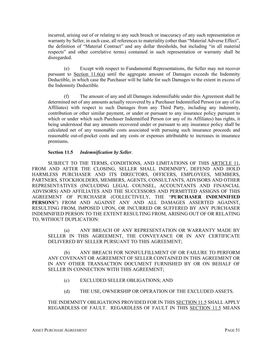 ASSET PURCHASE AGREEMENT PAGE 51 incurred, arising out of or relating to any such breach or inaccuracy of any such representation or warranty by Seller, in each case, all references to materiality (other than “Material Adverse Effect”, the definition of “Material Contract” and any dollar thresholds, but including “in all material respects” and other correlative terms) contained in such representation or warranty shall be disregarded. (e) Except with respect to Fundamental Representations, the Seller may not recover pursuant to Section 11.6(a) until the aggregate amount of Damages exceeds the Indemnity Deductible, in which case the Purchaser will be liable for such Damages to the extent in excess of the Indemnity Deductible. (f) The amount of any and all Damages indemnifiable under this Agreement shall be determined net of any amounts actually recovered by a Purchaser Indemnified Person (or any of its Affiliates) with respect to such Damages from any Third Party, including any indemnity, contribution or other similar payment, or under or pursuant to any insurance policy pursuant to which or under which such Purchaser Indemnified Person (or any of its Affiliates) has rights, it being understood that any amounts recovered under or pursuant to any insurance policy shall be calculated net of any reasonable costs associated with pursuing such insurance proceeds and reasonable out-of-pocket costs and any costs or expenses attributable to increases in insurance premiums. Section 11.5 Indemnification by Seller. SUBJECT TO THE TERMS, CONDITIONS, AND LIMITATIONS OF THIS ARTICLE 11, FROM AND AFTER THE CLOSING, SELLER SHALL INDEMNIFY, DEFEND AND HOLD HARMLESS PURCHASER AND ITS DIRECTORS, OFFICERS, EMPLOYEES, MEMBERS, PARTNERS, STOCKHOLDERS, MEMBERS, AGENTS, CONSULTANTS, ADVISORS AND OTHER REPRESENTATIVES (INCLUDING LEGAL COUNSEL, ACCOUNTANTS AND FINANCIAL ADVISORS) AND AFFILIATES AND THE SUCCESSORS AND PERMITTED ASSIGNS OF THIS AGREEMENT OF PURCHASER (COLLECTIVELY, THE “PURCHASER INDEMNIFIED PERSONS”) FROM AND AGAINST ANY AND ALL DAMAGES ASSERTED AGAINST, RESULTING FROM, IMPOSED UPON, OR INCURRED OR SUFFERED BY ANY PURCHASER INDEMNIFIED PERSON TO THE EXTENT RESULTING FROM, ARISING OUT OF OR RELATING TO, WITHOUT DUPLICATION: (a) ANY BREACH OF ANY REPRESENTATION OR WARRANTY MADE BY SELLER IN THIS AGREEMENT, THE CONVEYANCE OR IN ANY CERTIFICATE DELIVERED BY SELLER PURSUANT TO THIS AGREEMENT; (b) ANY BREACH FOR NONFULFILLMENT OF OR FAILURE TO PERFORM ANY COVENANT OR AGREEMENT OF SELLER CONTAINED IN THIS AGREEMENT OR IN ANY OTHER TRANSACTION DOCUMENT FURNISHED BY OR ON BEHALF OF SELLER IN CONNECTION WITH THIS AGREEMENT; (c) EXCLUDED SELLER OBLIGATIONS; AND (d) THE USE, OWNERSHIP OR OPERATION OF THE EXCLUDED ASSETS. THE INDEMNITY OBLIGATIONS PROVIDED FOR IN THIS SECTION 11.5 SHALL APPLY REGARDLESS OF FAULT. REGARDLESS OF FAULT IN THIS SECTION 11.5 MEANS