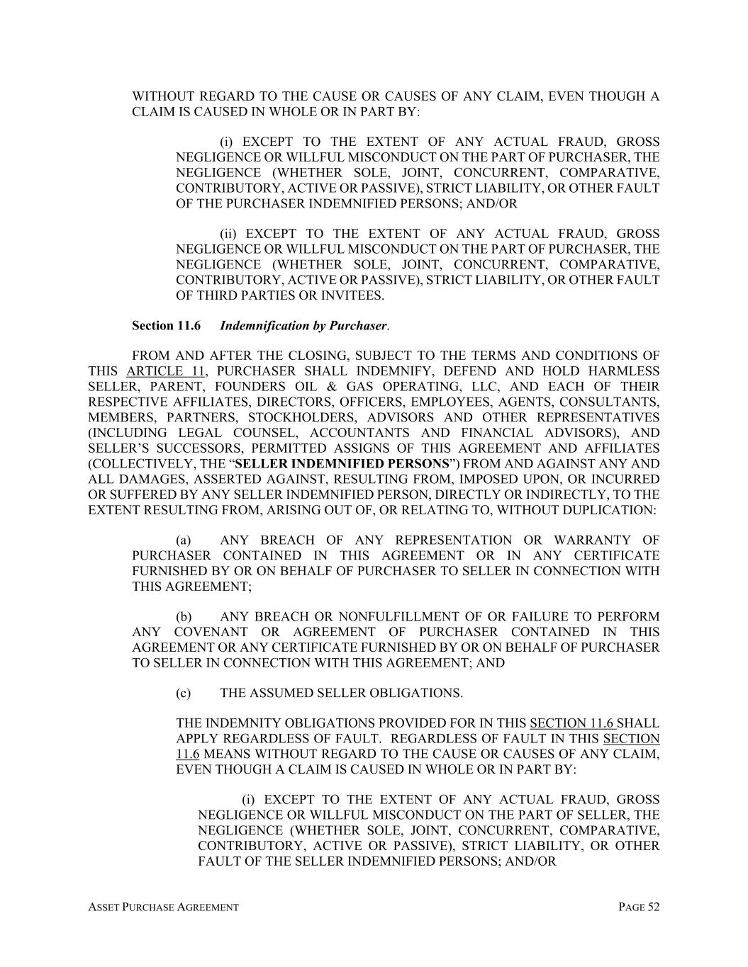 ASSET PURCHASE AGREEMENT PAGE 52 WITHOUT REGARD TO THE CAUSE OR CAUSES OF ANY CLAIM, EVEN THOUGH A CLAIM IS CAUSED IN WHOLE OR IN PART BY: (i) EXCEPT TO THE EXTENT OF ANY ACTUAL FRAUD, GROSS NEGLIGENCE OR WILLFUL MISCONDUCT ON THE PART OF PURCHASER, THE NEGLIGENCE (WHETHER SOLE, JOINT, CONCURRENT, COMPARATIVE, CONTRIBUTORY, ACTIVE OR PASSIVE), STRICT LIABILITY, OR OTHER FAULT OF THE PURCHASER INDEMNIFIED PERSONS; AND/OR (ii) EXCEPT TO THE EXTENT OF ANY ACTUAL FRAUD, GROSS NEGLIGENCE OR WILLFUL MISCONDUCT ON THE PART OF PURCHASER, THE NEGLIGENCE (WHETHER SOLE, JOINT, CONCURRENT, COMPARATIVE, CONTRIBUTORY, ACTIVE OR PASSIVE), STRICT LIABILITY, OR OTHER FAULT OF THIRD PARTIES OR INVITEES. Section 11.6 Indemnification by Purchaser. FROM AND AFTER THE CLOSING, SUBJECT TO THE TERMS AND CONDITIONS OF THIS ARTICLE 11, PURCHASER SHALL INDEMNIFY, DEFEND AND HOLD HARMLESS SELLER, PARENT, FOUNDERS OIL & GAS OPERATING, LLC, AND EACH OF THEIR RESPECTIVE AFFILIATES, DIRECTORS, OFFICERS, EMPLOYEES, AGENTS, CONSULTANTS, MEMBERS, PARTNERS, STOCKHOLDERS, ADVISORS AND OTHER REPRESENTATIVES (INCLUDING LEGAL COUNSEL, ACCOUNTANTS AND FINANCIAL ADVISORS), AND SELLER’S SUCCESSORS, PERMITTED ASSIGNS OF THIS AGREEMENT AND AFFILIATES (COLLECTIVELY, THE “SELLER INDEMNIFIED PERSONS”) FROM AND AGAINST ANY AND ALL DAMAGES, ASSERTED AGAINST, RESULTING FROM, IMPOSED UPON, OR INCURRED OR SUFFERED BY ANY SELLER INDEMNIFIED PERSON, DIRECTLY OR INDIRECTLY, TO THE EXTENT RESULTING FROM, ARISING OUT OF, OR RELATING TO, WITHOUT DUPLICATION: (a) ANY BREACH OF ANY REPRESENTATION OR WARRANTY OF PURCHASER CONTAINED IN THIS AGREEMENT OR IN ANY CERTIFICATE FURNISHED BY OR ON BEHALF OF PURCHASER TO SELLER IN CONNECTION WITH THIS AGREEMENT; (b) ANY BREACH OR NONFULFILLMENT OF OR FAILURE TO PERFORM ANY COVENANT OR AGREEMENT OF PURCHASER CONTAINED IN THIS AGREEMENT OR ANY CERTIFICATE FURNISHED BY OR ON BEHALF OF PURCHASER TO SELLER IN CONNECTION WITH THIS AGREEMENT; AND (c) THE ASSUMED SELLER OBLIGATIONS. THE INDEMNITY OBLIGATIONS PROVIDED FOR IN THIS SECTION 11.6 SHALL APPLY REGARDLESS OF FAULT. REGARDLESS OF FAULT IN THIS SECTION 11.6 MEANS WITHOUT REGARD TO THE CAUSE OR CAUSES OF ANY CLAIM, EVEN THOUGH A CLAIM IS CAUSED IN WHOLE OR IN PART BY: (i) EXCEPT TO THE EXTENT OF ANY ACTUAL FRAUD, GROSS NEGLIGENCE OR WILLFUL MISCONDUCT ON THE PART OF SELLER, THE NEGLIGENCE (WHETHER SOLE, JOINT, CONCURRENT, COMPARATIVE, CONTRIBUTORY, ACTIVE OR PASSIVE), STRICT LIABILITY, OR OTHER FAULT OF THE SELLER INDEMNIFIED PERSONS; AND/OR