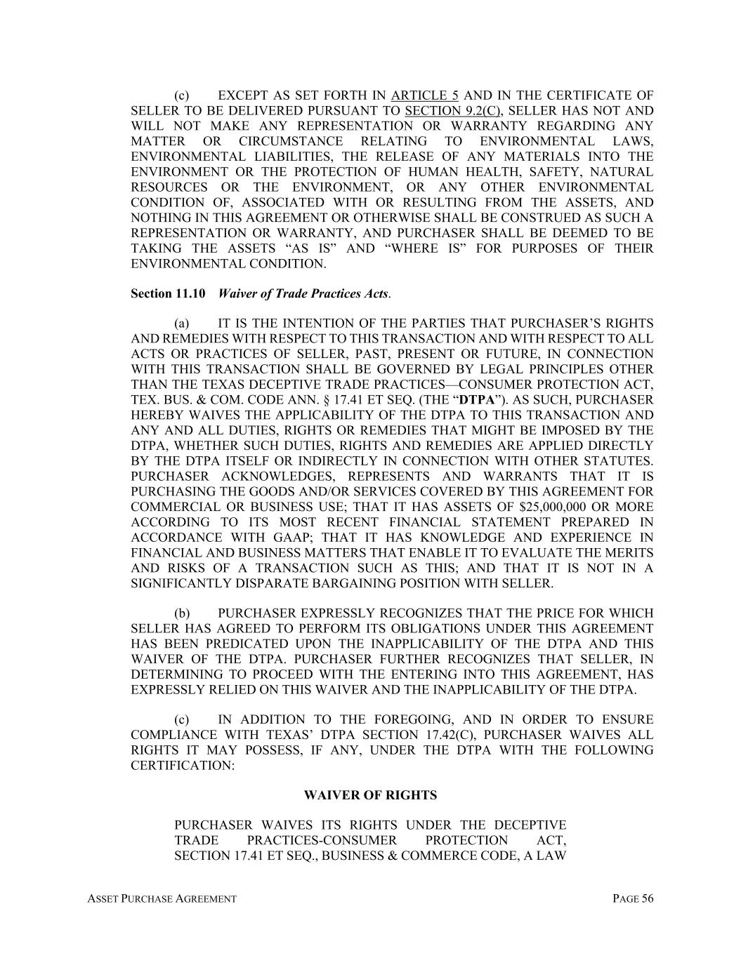 ASSET PURCHASE AGREEMENT PAGE 56 (c) EXCEPT AS SET FORTH IN ARTICLE 5 AND IN THE CERTIFICATE OF SELLER TO BE DELIVERED PURSUANT TO SECTION 9.2(C), SELLER HAS NOT AND WILL NOT MAKE ANY REPRESENTATION OR WARRANTY REGARDING ANY MATTER OR CIRCUMSTANCE RELATING TO ENVIRONMENTAL LAWS, ENVIRONMENTAL LIABILITIES, THE RELEASE OF ANY MATERIALS INTO THE ENVIRONMENT OR THE PROTECTION OF HUMAN HEALTH, SAFETY, NATURAL RESOURCES OR THE ENVIRONMENT, OR ANY OTHER ENVIRONMENTAL CONDITION OF, ASSOCIATED WITH OR RESULTING FROM THE ASSETS, AND NOTHING IN THIS AGREEMENT OR OTHERWISE SHALL BE CONSTRUED AS SUCH A REPRESENTATION OR WARRANTY, AND PURCHASER SHALL BE DEEMED TO BE TAKING THE ASSETS “AS IS” AND “WHERE IS” FOR PURPOSES OF THEIR ENVIRONMENTAL CONDITION. Section 11.10 Waiver of Trade Practices Acts. (a) IT IS THE INTENTION OF THE PARTIES THAT PURCHASER’S RIGHTS AND REMEDIES WITH RESPECT TO THIS TRANSACTION AND WITH RESPECT TO ALL ACTS OR PRACTICES OF SELLER, PAST, PRESENT OR FUTURE, IN CONNECTION WITH THIS TRANSACTION SHALL BE GOVERNED BY LEGAL PRINCIPLES OTHER THAN THE TEXAS DECEPTIVE TRADE PRACTICES—CONSUMER PROTECTION ACT, TEX. BUS. & COM. CODE ANN. § 17.41 ET SEQ. (THE “DTPA”). AS SUCH, PURCHASER HEREBY WAIVES THE APPLICABILITY OF THE DTPA TO THIS TRANSACTION AND ANY AND ALL DUTIES, RIGHTS OR REMEDIES THAT MIGHT BE IMPOSED BY THE DTPA, WHETHER SUCH DUTIES, RIGHTS AND REMEDIES ARE APPLIED DIRECTLY BY THE DTPA ITSELF OR INDIRECTLY IN CONNECTION WITH OTHER STATUTES. PURCHASER ACKNOWLEDGES, REPRESENTS AND WARRANTS THAT IT IS PURCHASING THE GOODS AND/OR SERVICES COVERED BY THIS AGREEMENT FOR COMMERCIAL OR BUSINESS USE; THAT IT HAS ASSETS OF $25,000,000 OR MORE ACCORDING TO ITS MOST RECENT FINANCIAL STATEMENT PREPARED IN ACCORDANCE WITH GAAP; THAT IT HAS KNOWLEDGE AND EXPERIENCE IN FINANCIAL AND BUSINESS MATTERS THAT ENABLE IT TO EVALUATE THE MERITS AND RISKS OF A TRANSACTION SUCH AS THIS; AND THAT IT IS NOT IN A SIGNIFICANTLY DISPARATE BARGAINING POSITION WITH SELLER. (b) PURCHASER EXPRESSLY RECOGNIZES THAT THE PRICE FOR WHICH SELLER HAS AGREED TO PERFORM ITS OBLIGATIONS UNDER THIS AGREEMENT HAS BEEN PREDICATED UPON THE INAPPLICABILITY OF THE DTPA AND THIS WAIVER OF THE DTPA. PURCHASER FURTHER RECOGNIZES THAT SELLER, IN DETERMINING TO PROCEED WITH THE ENTERING INTO THIS AGREEMENT, HAS EXPRESSLY RELIED ON THIS WAIVER AND THE INAPPLICABILITY OF THE DTPA. (c) IN ADDITION TO THE FOREGOING, AND IN ORDER TO ENSURE COMPLIANCE WITH TEXAS’ DTPA SECTION 17.42(C), PURCHASER WAIVES ALL RIGHTS IT MAY POSSESS, IF ANY, UNDER THE DTPA WITH THE FOLLOWING CERTIFICATION: WAIVER OF RIGHTS PURCHASER WAIVES ITS RIGHTS UNDER THE DECEPTIVE TRADE PRACTICES-CONSUMER PROTECTION ACT, SECTION 17.41 ET SEQ., BUSINESS & COMMERCE CODE, A LAW