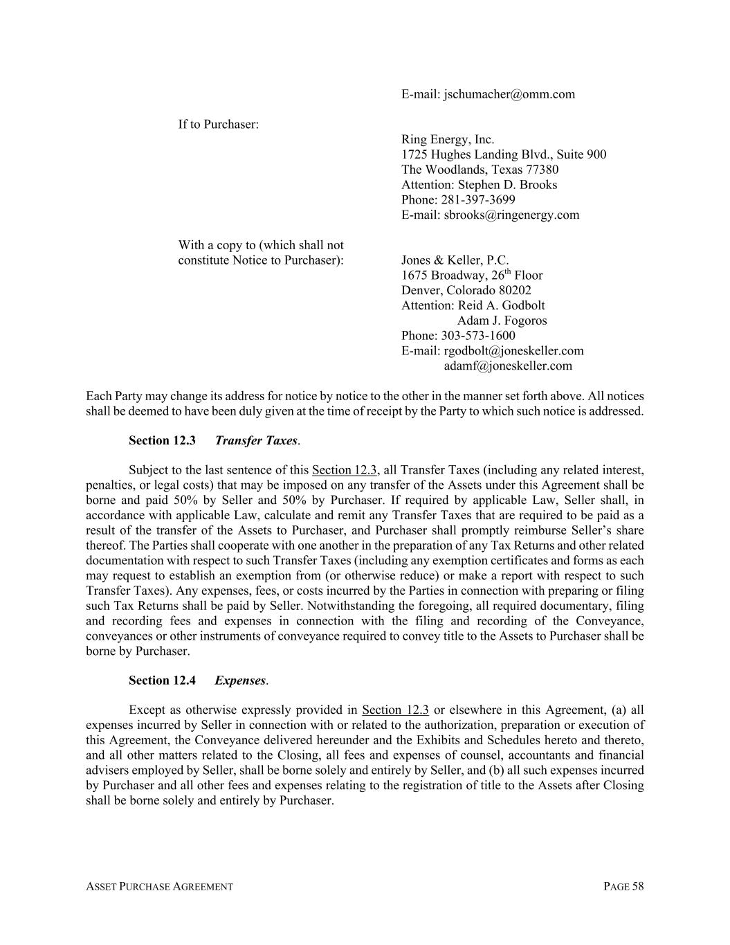 ASSET PURCHASE AGREEMENT PAGE 58 E-mail: jschumacher@omm.com If to Purchaser: Ring Energy, Inc. 1725 Hughes Landing Blvd., Suite 900 The Woodlands, Texas 77380 Attention: Stephen D. Brooks Phone: 281-397-3699 E-mail: sbrooks@ringenergy.com With a copy to (which shall not constitute Notice to Purchaser): Jones & Keller, P.C. 1675 Broadway, 26th Floor Denver, Colorado 80202 Attention: Reid A. Godbolt Adam J. Fogoros Phone: 303-573-1600 E-mail: rgodbolt@joneskeller.com adamf@joneskeller.com Each Party may change its address for notice by notice to the other in the manner set forth above. All notices shall be deemed to have been duly given at the time of receipt by the Party to which such notice is addressed. Section 12.3 Transfer Taxes. Subject to the last sentence of this Section 12.3, all Transfer Taxes (including any related interest, penalties, or legal costs) that may be imposed on any transfer of the Assets under this Agreement shall be borne and paid 50% by Seller and 50% by Purchaser. If required by applicable Law, Seller shall, in accordance with applicable Law, calculate and remit any Transfer Taxes that are required to be paid as a result of the transfer of the Assets to Purchaser, and Purchaser shall promptly reimburse Seller’s share thereof. The Parties shall cooperate with one another in the preparation of any Tax Returns and other related documentation with respect to such Transfer Taxes (including any exemption certificates and forms as each may request to establish an exemption from (or otherwise reduce) or make a report with respect to such Transfer Taxes). Any expenses, fees, or costs incurred by the Parties in connection with preparing or filing such Tax Returns shall be paid by Seller. Notwithstanding the foregoing, all required documentary, filing and recording fees and expenses in connection with the filing and recording of the Conveyance, conveyances or other instruments of conveyance required to convey title to the Assets to Purchaser shall be borne by Purchaser. Section 12.4 Expenses. Except as otherwise expressly provided in Section 12.3 or elsewhere in this Agreement, (a) all expenses incurred by Seller in connection with or related to the authorization, preparation or execution of this Agreement, the Conveyance delivered hereunder and the Exhibits and Schedules hereto and thereto, and all other matters related to the Closing, all fees and expenses of counsel, accountants and financial advisers employed by Seller, shall be borne solely and entirely by Seller, and (b) all such expenses incurred by Purchaser and all other fees and expenses relating to the registration of title to the Assets after Closing shall be borne solely and entirely by Purchaser.
