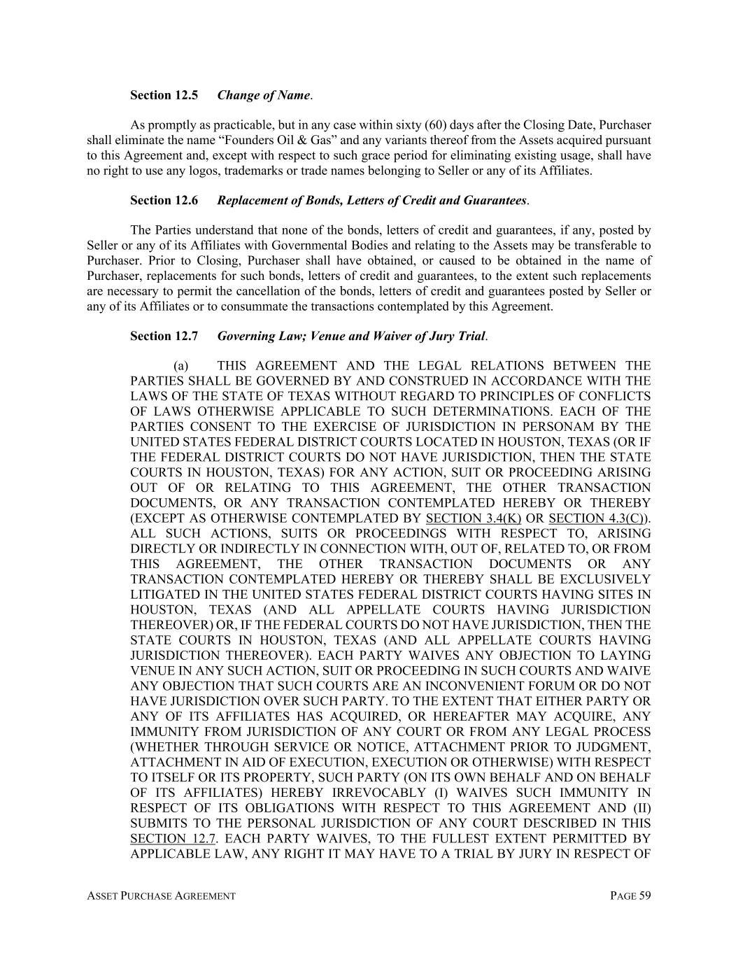 ASSET PURCHASE AGREEMENT PAGE 59 Section 12.5 Change of Name. As promptly as practicable, but in any case within sixty (60) days after the Closing Date, Purchaser shall eliminate the name “Founders Oil & Gas” and any variants thereof from the Assets acquired pursuant to this Agreement and, except with respect to such grace period for eliminating existing usage, shall have no right to use any logos, trademarks or trade names belonging to Seller or any of its Affiliates. Section 12.6 Replacement of Bonds, Letters of Credit and Guarantees. The Parties understand that none of the bonds, letters of credit and guarantees, if any, posted by Seller or any of its Affiliates with Governmental Bodies and relating to the Assets may be transferable to Purchaser. Prior to Closing, Purchaser shall have obtained, or caused to be obtained in the name of Purchaser, replacements for such bonds, letters of credit and guarantees, to the extent such replacements are necessary to permit the cancellation of the bonds, letters of credit and guarantees posted by Seller or any of its Affiliates or to consummate the transactions contemplated by this Agreement. Section 12.7 Governing Law; Venue and Waiver of Jury Trial. (a) THIS AGREEMENT AND THE LEGAL RELATIONS BETWEEN THE PARTIES SHALL BE GOVERNED BY AND CONSTRUED IN ACCORDANCE WITH THE LAWS OF THE STATE OF TEXAS WITHOUT REGARD TO PRINCIPLES OF CONFLICTS OF LAWS OTHERWISE APPLICABLE TO SUCH DETERMINATIONS. EACH OF THE PARTIES CONSENT TO THE EXERCISE OF JURISDICTION IN PERSONAM BY THE UNITED STATES FEDERAL DISTRICT COURTS LOCATED IN HOUSTON, TEXAS (OR IF THE FEDERAL DISTRICT COURTS DO NOT HAVE JURISDICTION, THEN THE STATE COURTS IN HOUSTON, TEXAS) FOR ANY ACTION, SUIT OR PROCEEDING ARISING OUT OF OR RELATING TO THIS AGREEMENT, THE OTHER TRANSACTION DOCUMENTS, OR ANY TRANSACTION CONTEMPLATED HEREBY OR THEREBY (EXCEPT AS OTHERWISE CONTEMPLATED BY SECTION 3.4(K) OR SECTION 4.3(C)). ALL SUCH ACTIONS, SUITS OR PROCEEDINGS WITH RESPECT TO, ARISING DIRECTLY OR INDIRECTLY IN CONNECTION WITH, OUT OF, RELATED TO, OR FROM THIS AGREEMENT, THE OTHER TRANSACTION DOCUMENTS OR ANY TRANSACTION CONTEMPLATED HEREBY OR THEREBY SHALL BE EXCLUSIVELY LITIGATED IN THE UNITED STATES FEDERAL DISTRICT COURTS HAVING SITES IN HOUSTON, TEXAS (AND ALL APPELLATE COURTS HAVING JURISDICTION THEREOVER) OR, IF THE FEDERAL COURTS DO NOT HAVE JURISDICTION, THEN THE STATE COURTS IN HOUSTON, TEXAS (AND ALL APPELLATE COURTS HAVING JURISDICTION THEREOVER). EACH PARTY WAIVES ANY OBJECTION TO LAYING VENUE IN ANY SUCH ACTION, SUIT OR PROCEEDING IN SUCH COURTS AND WAIVE ANY OBJECTION THAT SUCH COURTS ARE AN INCONVENIENT FORUM OR DO NOT HAVE JURISDICTION OVER SUCH PARTY. TO THE EXTENT THAT EITHER PARTY OR ANY OF ITS AFFILIATES HAS ACQUIRED, OR HEREAFTER MAY ACQUIRE, ANY IMMUNITY FROM JURISDICTION OF ANY COURT OR FROM ANY LEGAL PROCESS (WHETHER THROUGH SERVICE OR NOTICE, ATTACHMENT PRIOR TO JUDGMENT, ATTACHMENT IN AID OF EXECUTION, EXECUTION OR OTHERWISE) WITH RESPECT TO ITSELF OR ITS PROPERTY, SUCH PARTY (ON ITS OWN BEHALF AND ON BEHALF OF ITS AFFILIATES) HEREBY IRREVOCABLY (I) WAIVES SUCH IMMUNITY IN RESPECT OF ITS OBLIGATIONS WITH RESPECT TO THIS AGREEMENT AND (II) SUBMITS TO THE PERSONAL JURISDICTION OF ANY COURT DESCRIBED IN THIS SECTION 12.7. EACH PARTY WAIVES, TO THE FULLEST EXTENT PERMITTED BY APPLICABLE LAW, ANY RIGHT IT MAY HAVE TO A TRIAL BY JURY IN RESPECT OF