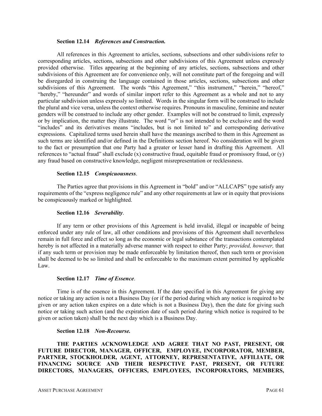 ASSET PURCHASE AGREEMENT PAGE 61 Section 12.14 References and Construction. All references in this Agreement to articles, sections, subsections and other subdivisions refer to corresponding articles, sections, subsections and other subdivisions of this Agreement unless expressly provided otherwise. Titles appearing at the beginning of any articles, sections, subsections and other subdivisions of this Agreement are for convenience only, will not constitute part of the foregoing and will be disregarded in construing the language contained in those articles, sections, subsections and other subdivisions of this Agreement. The words “this Agreement,” “this instrument,” “herein,” “hereof,” “hereby,” “hereunder” and words of similar import refer to this Agreement as a whole and not to any particular subdivision unless expressly so limited. Words in the singular form will be construed to include the plural and vice versa, unless the context otherwise requires. Pronouns in masculine, feminine and neuter genders will be construed to include any other gender. Examples will not be construed to limit, expressly or by implication, the matter they illustrate. The word “or” is not intended to be exclusive and the word “includes” and its derivatives means “includes, but is not limited to” and corresponding derivative expressions. Capitalized terms used herein shall have the meanings ascribed to them in this Agreement as such terms are identified and/or defined in the Definitions section hereof. No consideration will be given to the fact or presumption that one Party had a greater or lesser hand in drafting this Agreement. All references to “actual fraud” shall exclude (x) constructive fraud, equitable fraud or promissory fraud, or (y) any fraud based on constructive knowledge, negligent misrepresentation or recklessness. Section 12.15 Conspicuousness. The Parties agree that provisions in this Agreement in “bold” and/or “ALLCAPS” type satisfy any requirements of the “express negligence rule” and any other requirements at law or in equity that provisions be conspicuously marked or highlighted. Section 12.16 Severability. If any term or other provisions of this Agreement is held invalid, illegal or incapable of being enforced under any rule of law, all other conditions and provisions of this Agreement shall nevertheless remain in full force and effect so long as the economic or legal substance of the transactions contemplated hereby is not affected in a materially adverse manner with respect to either Party; provided, however, that if any such term or provision may be made enforceable by limitation thereof, then such term or provision shall be deemed to be so limited and shall be enforceable to the maximum extent permitted by applicable Law. Section 12.17 Time of Essence. Time is of the essence in this Agreement. If the date specified in this Agreement for giving any notice or taking any action is not a Business Day (or if the period during which any notice is required to be given or any action taken expires on a date which is not a Business Day), then the date for giving such notice or taking such action (and the expiration date of such period during which notice is required to be given or action taken) shall be the next day which is a Business Day. Section 12.18 Non-Recourse. THE PARTIES ACKNOWLEDGE AND AGREE THAT NO PAST, PRESENT, OR FUTURE DIRECTOR, MANAGER, OFFICER, EMPLOYEE, INCORPORATOR, MEMBER, PARTNER, STOCKHOLDER, AGENT, ATTORNEY, REPRESENTATIVE, AFFILIATE, OR FINANCING SOURCE AND THEIR RESPECTIVE PAST, PRESENT, OR FUTURE DIRECTORS, MANAGERS, OFFICERS, EMPLOYEES, INCORPORATORS, MEMBERS,