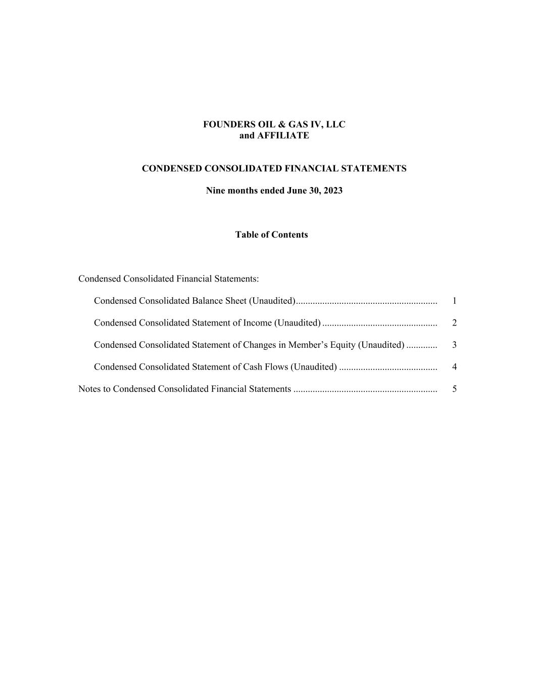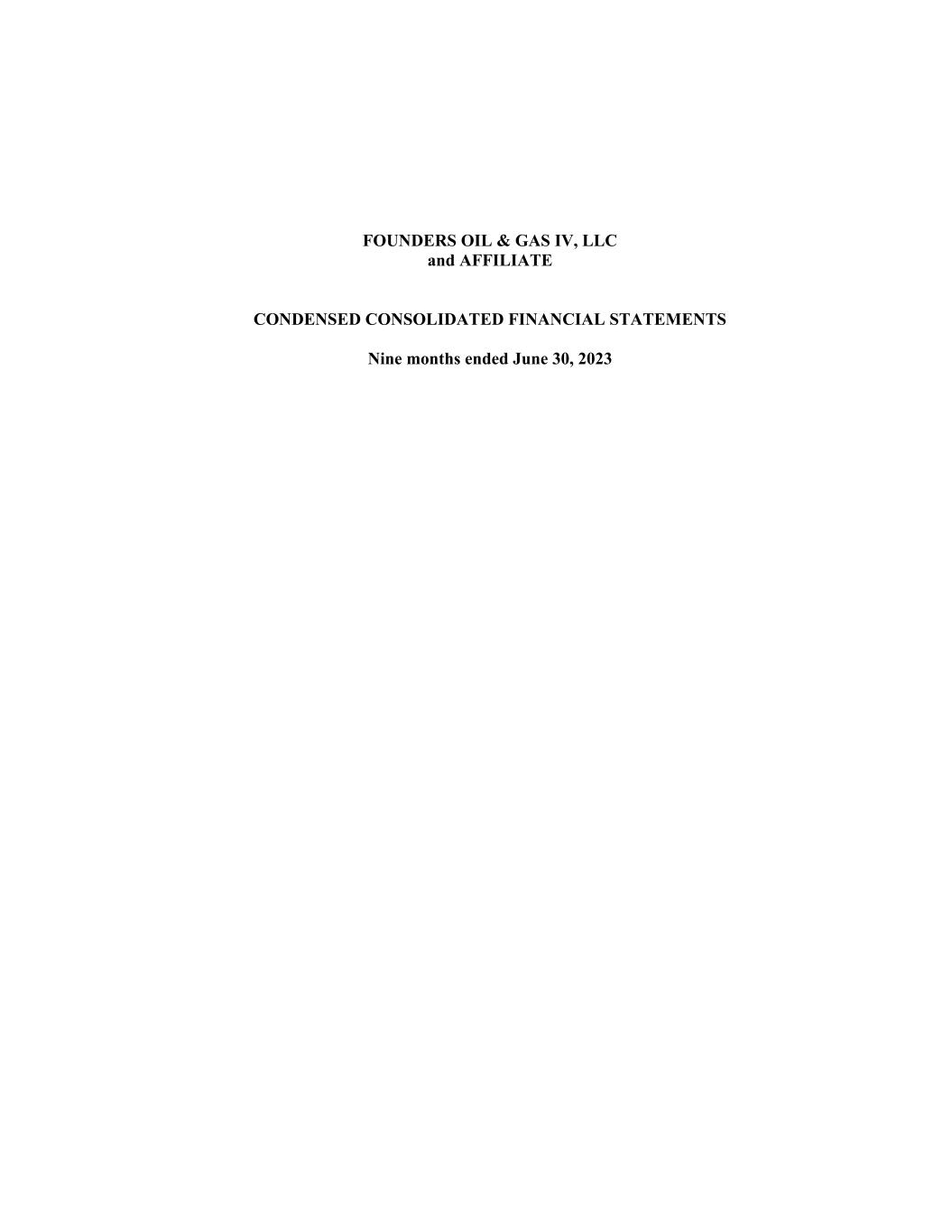 FOUNDERS OIL & GAS IV, LLC and AFFILIATE CONDENSED CONSOLIDATED FINANCIAL STATEMENTS Nine months ended June 30, 2023 Table of Contents Condensed Consolidated Financial Statements: Condensed Consolidated Balance Sheet (Unaudited) ........................................................... 1 Condensed Consolidated Statement of Income (Unaudited) ................................................ 2 Condensed Consolidated Statement of Changes in Member’s Equity (Unaudited) ............. 3 Condensed Consolidated Statement of Cash Flows (Unaudited) ......................................... 4 Notes to Condensed Consolidated Financial Statements ............................................................ 5