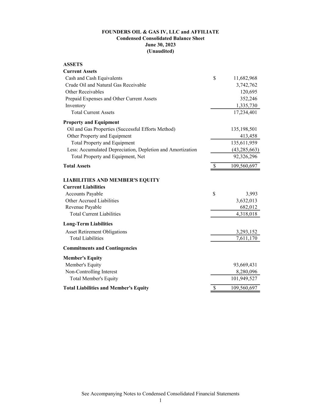 FOUNDERS OIL & GAS IV, LLC and AFFILIATE Condensed Consolidated Balance Sheet June 30, 2023 (Unaudited) ASSETS Current Assets Cash and Cash Equivalents 11,682,968$ Crude Oil and Natural Gas Receivable 3,742,762 Other Receivables 120,695 Prepaid Expenses and Other Current Assets 352,246 Inventory 1,335,730 Total Current Assets 17,234,401 Property and Equipment Oil and Gas Properties (Successful Efforts Method) 135,198,501 Other Property and Equipment 413,458 Total Property and Equipment 135,611,959 Less: Accumulated Depreciation, Depletion and Amortization (43,285,663) Total Property and Equipment, Net 92,326,296 Total Assets 109,560,697$ LIABILITIES AND MEMBER'S EQUITY Current Liabilities Accounts Payable $ 3,993 Other Accrued Liabilities 3,632,013 Revenue Payable 682,012 Total Current Liabilities 4,318,018 Long-Term Liabilities Asset Retirement Obligations 3,293,152 Total Liabilities 7,611,170 Commitments and Contingencies Member's Equity Member's Equity 93,669,431 Non-Controlling Interest 8,280,096 Total Member's Equity 101,949,527 Total Liabilities and Member's Equity 109,560,697$ See Accompanying Notes to Condensed Consolidated Financial Statements 1