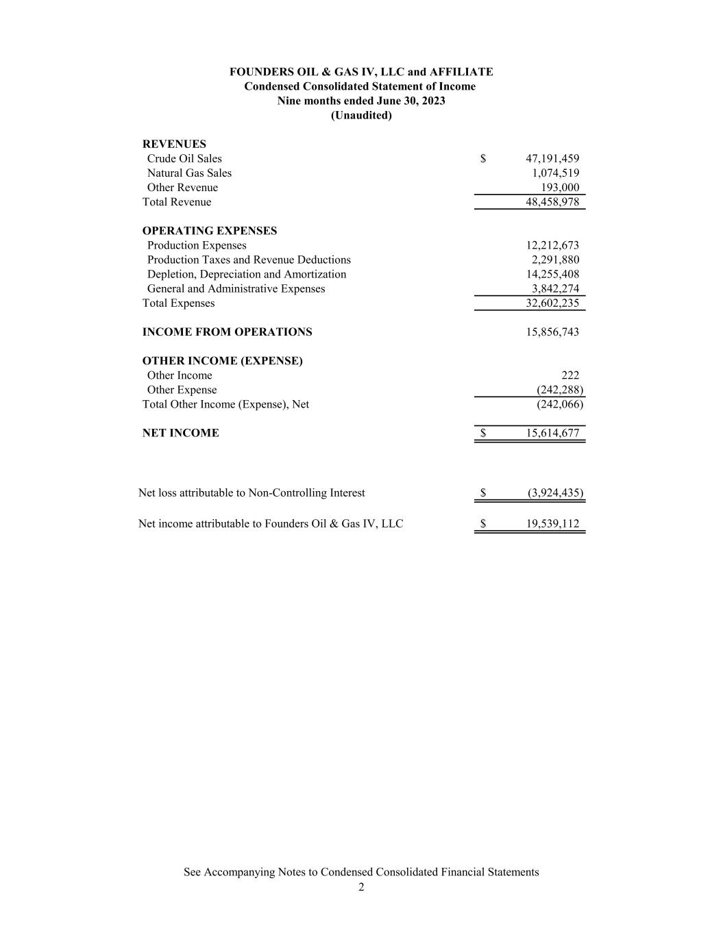 FOUNDERS OIL & GAS IV, LLC and AFFILIATE Condensed Consolidated Statement of Income Nine months ended June 30, 2023 (Unaudited) REVENUES Crude Oil Sales 47,191,459$ Natural Gas Sales 1,074,519 Other Revenue 193,000 Total Revenue 48,458,978 OPERATING EXPENSES Production Expenses 12,212,673 Production Taxes and Revenue Deductions 2,291,880 Depletion, Depreciation and Amortization 14,255,408 General and Administrative Expenses 3,842,274 Total Expenses 32,602,235 INCOME FROM OPERATIONS 15,856,743 OTHER INCOME (EXPENSE) Other Income 222 Other Expense (242,288) Total Other Income (Expense), Net (242,066) NET INCOME 15,614,677$ Net loss attributable to Non-Controlling Interest (3,924,435)$ Net income attributable to Founders Oil & Gas IV, LLC 19,539,112$ See Accompanying Notes to Condensed Consolidated Financial Statements 2