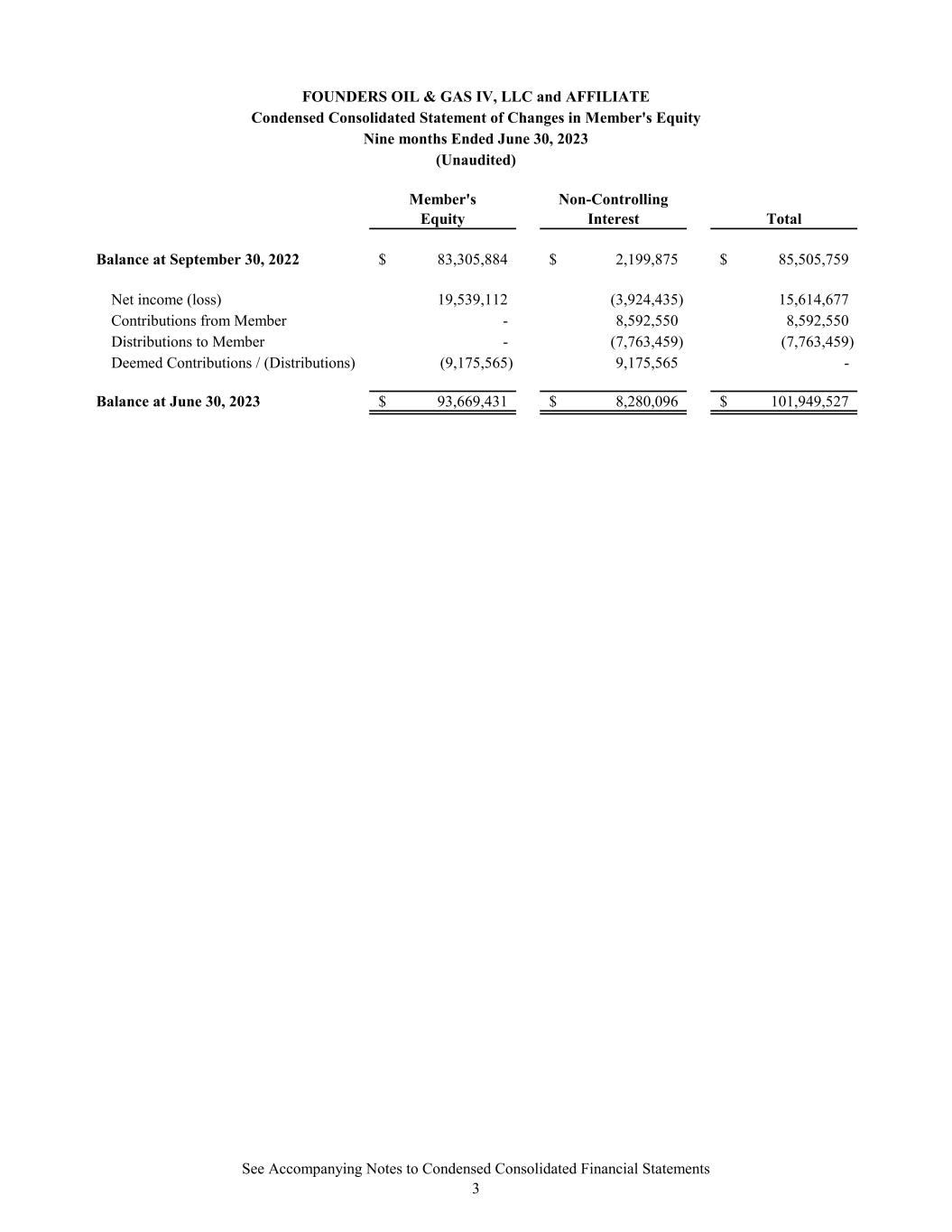 FOUNDERS OIL & GAS IV, LLC and AFFILIATE Condensed Consolidated Statement of Changes in Member's Equity Nine months Ended June 30, 2023 (Unaudited) Member's Equity Non-Controlling Interest Total Balance at September 30, 2022 83,305,884$ 2,199,875$ 85,505,759$ Net income (loss) 19,539,112 (3,924,435) 15,614,677 Contributions from Member - 8,592,550 8,592,550 Distributions to Member - (7,763,459) (7,763,459) Deemed Contributions / (Distributions) (9,175,565) 9,175,565 - Balance at June 30, 2023 93,669,431$ 8,280,096$ 101,949,527$ See Accompanying Notes to Condensed Consolidated Financial Statements 3