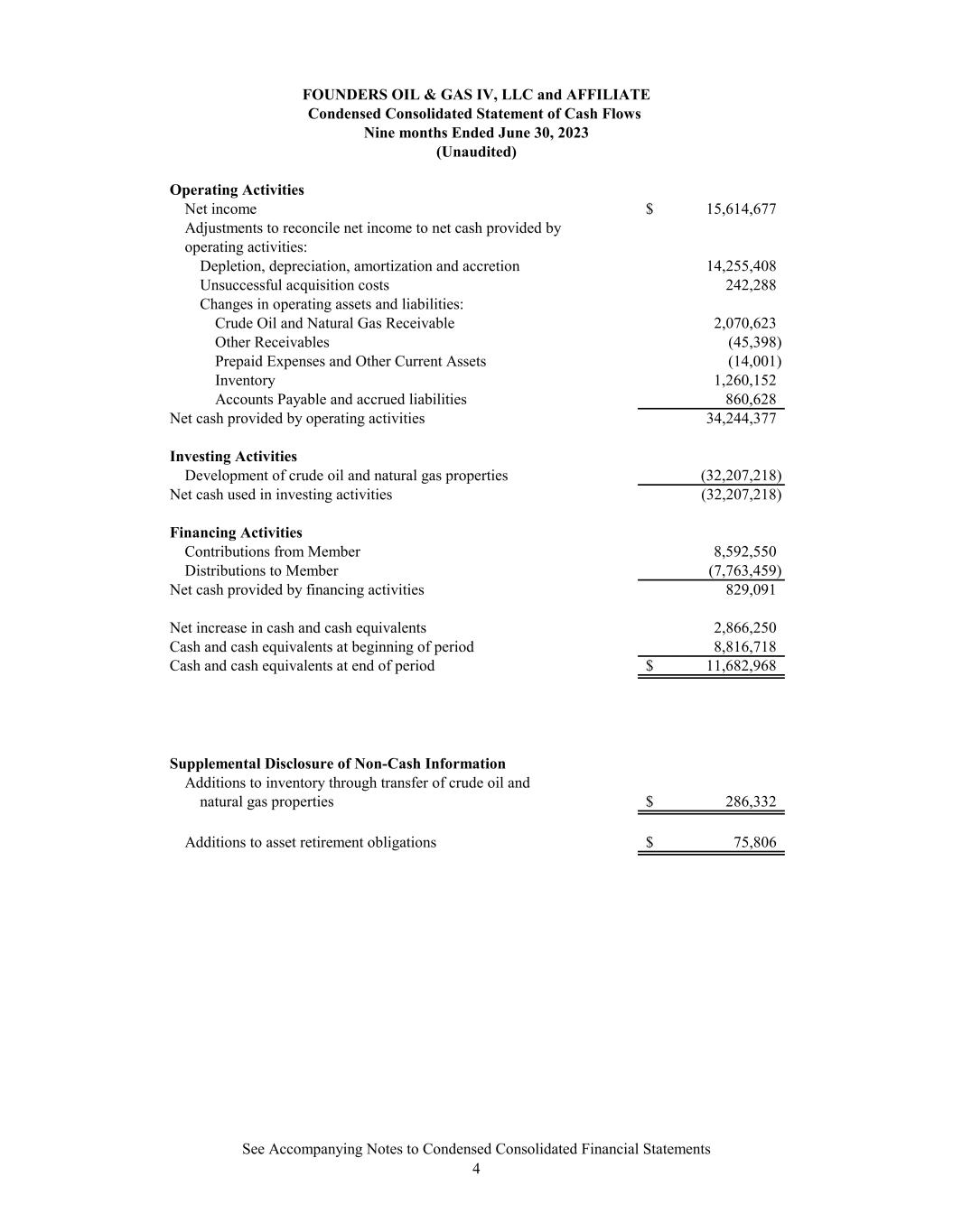 FOUNDERS OIL & GAS IV, LLC and AFFILIATE Condensed Consolidated Statement of Cash Flows Nine months Ended June 30, 2023 (Unaudited) Operating Activities Net income 15,614,677$ Adjustments to reconcile net income to net cash provided by operating activities: Depletion, depreciation, amortization and accretion 14,255,408 Unsuccessful acquisition costs 242,288 Changes in operating assets and liabilities: Crude Oil and Natural Gas Receivable 2,070,623 Other Receivables (45,398) Prepaid Expenses and Other Current Assets (14,001) Inventory 1,260,152 Accounts Payable and accrued liabilities 860,628 Net cash provided by operating activities 34,244,377 Investing Activities Development of crude oil and natural gas properties (32,207,218) Net cash used in investing activities (32,207,218) Financing Activities Contributions from Member 8,592,550 Distributions to Member (7,763,459) Net cash provided by financing activities 829,091 Net increase in cash and cash equivalents 2,866,250 Cash and cash equivalents at beginning of period 8,816,718 Cash and cash equivalents at end of period 11,682,968$ Supplemental Disclosure of Non-Cash Information Additions to inventory through transfer of crude oil and natural gas properties 286,332$ Additions to asset retirement obligations 75,806$ See Accompanying Notes to Condensed Consolidated Financial Statements 4