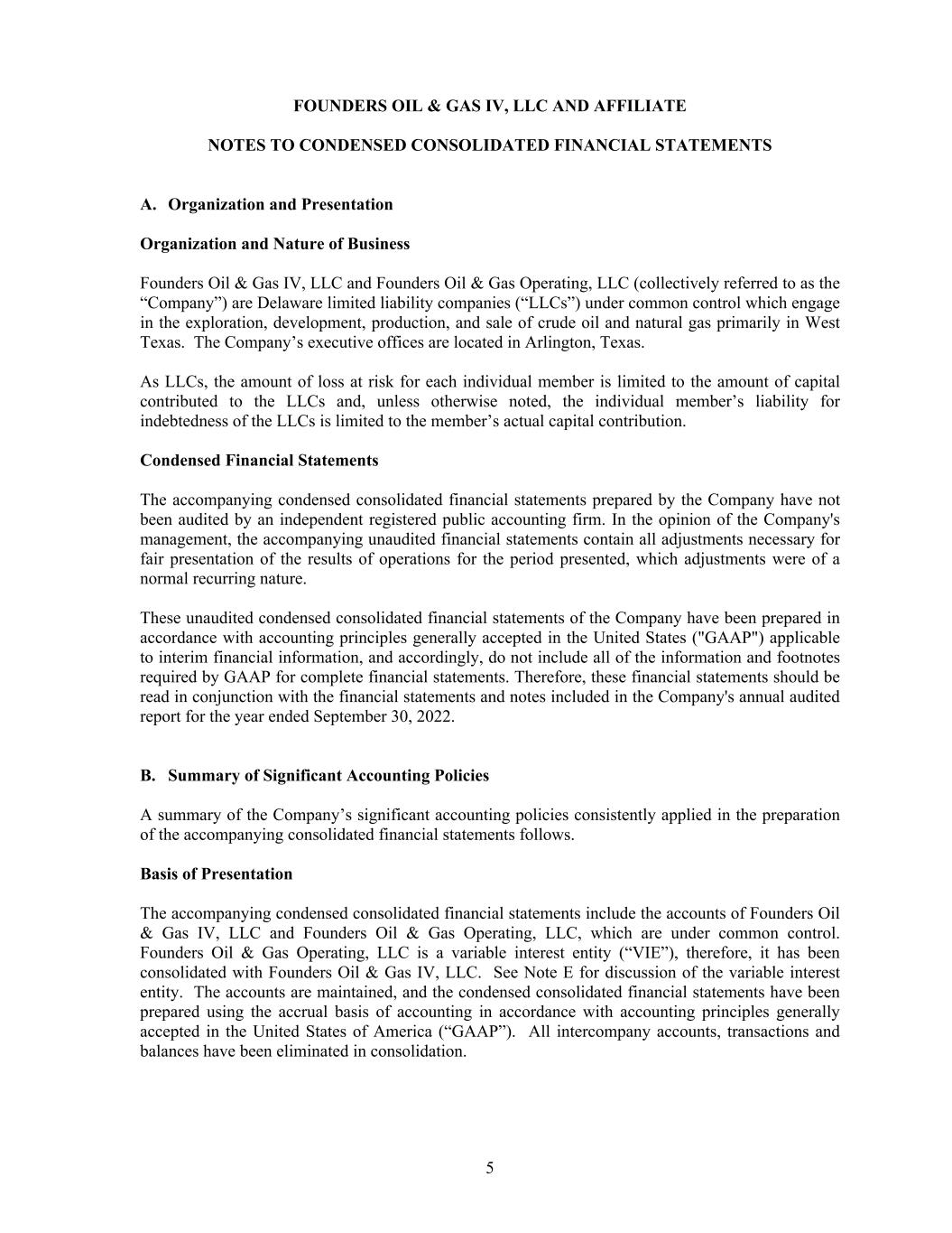 FOUNDERS OIL & GAS IV, LLC AND AFFILIATE NOTES TO CONDENSED CONSOLIDATED FINANCIAL STATEMENTS 5 A. Organization and Presentation Organization and Nature of Business Founders Oil & Gas IV, LLC and Founders Oil & Gas Operating, LLC (collectively referred to as the “Company”) are Delaware limited liability companies (“LLCs”) under common control which engage in the exploration, development, production, and sale of crude oil and natural gas primarily in West Texas. The Company’s executive offices are located in Arlington, Texas. As LLCs, the amount of loss at risk for each individual member is limited to the amount of capital contributed to the LLCs and, unless otherwise noted, the individual member’s liability for indebtedness of the LLCs is limited to the member’s actual capital contribution. Condensed Financial Statements The accompanying condensed consolidated financial statements prepared by the Company have not been audited by an independent registered public accounting firm. In the opinion of the Company's management, the accompanying unaudited financial statements contain all adjustments necessary for fair presentation of the results of operations for the period presented, which adjustments were of a normal recurring nature. These unaudited condensed consolidated financial statements of the Company have been prepared in accordance with accounting principles generally accepted in the United States ("GAAP") applicable to interim financial information, and accordingly, do not include all of the information and footnotes required by GAAP for complete financial statements. Therefore, these financial statements should be read in conjunction with the financial statements and notes included in the Company's annual audited report for the year ended September 30, 2022. B. Summary of Significant Accounting Policies A summary of the Company’s significant accounting policies consistently applied in the preparation of the accompanying consolidated financial statements follows. Basis of Presentation The accompanying condensed consolidated financial statements include the accounts of Founders Oil & Gas IV, LLC and Founders Oil & Gas Operating, LLC, which are under common control. Founders Oil & Gas Operating, LLC is a variable interest entity (“VIE”), therefore, it has been consolidated with Founders Oil & Gas IV, LLC. See Note E for discussion of the variable interest entity. The accounts are maintained, and the condensed consolidated financial statements have been prepared using the accrual basis of accounting in accordance with accounting principles generally accepted in the United States of America (“GAAP”). All intercompany accounts, transactions and balances have been eliminated in consolidation.