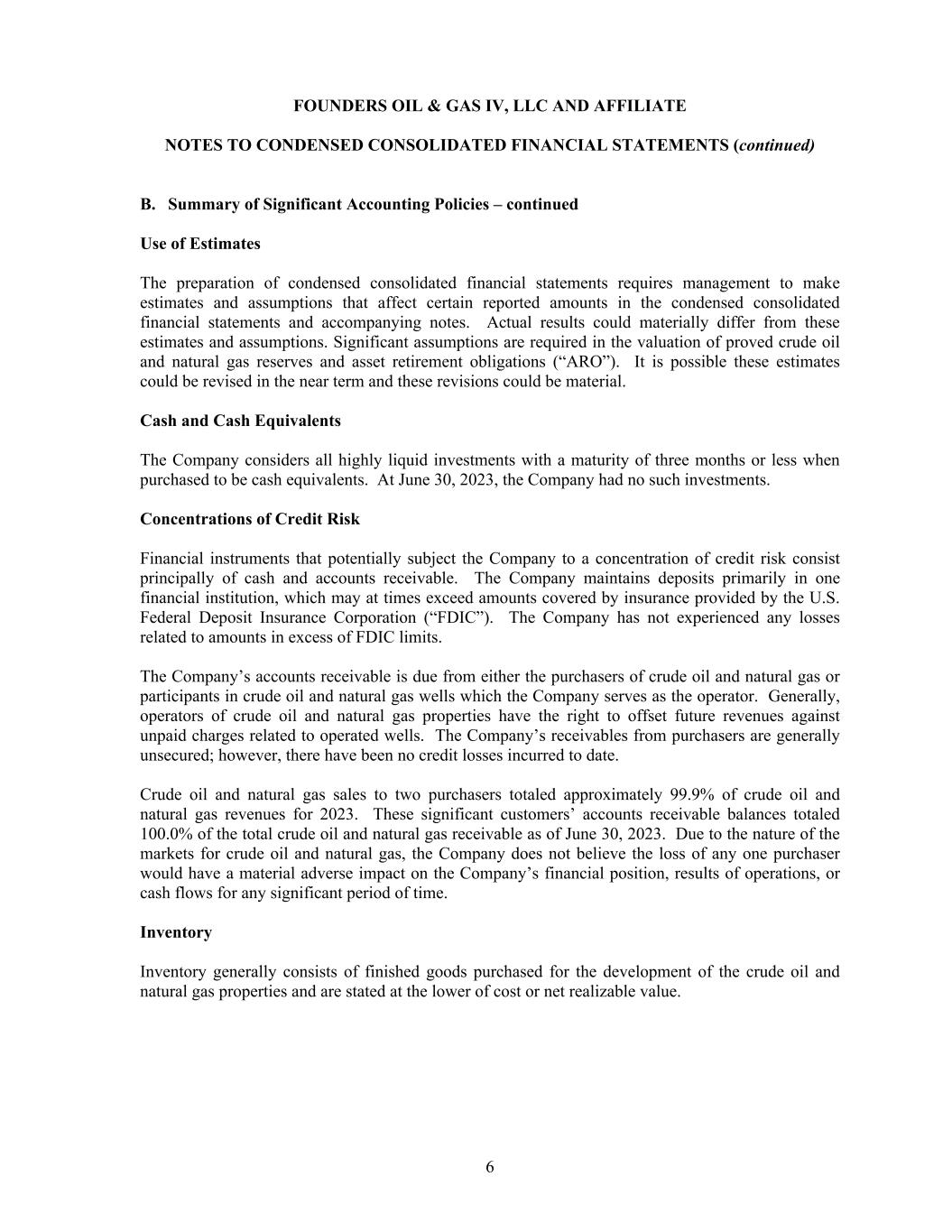 FOUNDERS OIL & GAS IV, LLC AND AFFILIATE NOTES TO CONDENSED CONSOLIDATED FINANCIAL STATEMENTS (continued) 6 B. Summary of Significant Accounting Policies – continued Use of Estimates The preparation of condensed consolidated financial statements requires management to make estimates and assumptions that affect certain reported amounts in the condensed consolidated financial statements and accompanying notes. Actual results could materially differ from these estimates and assumptions. Significant assumptions are required in the valuation of proved crude oil and natural gas reserves and asset retirement obligations (“ARO”). It is possible these estimates could be revised in the near term and these revisions could be material. Cash and Cash Equivalents The Company considers all highly liquid investments with a maturity of three months or less when purchased to be cash equivalents. At June 30, 2023, the Company had no such investments. Concentrations of Credit Risk Financial instruments that potentially subject the Company to a concentration of credit risk consist principally of cash and accounts receivable. The Company maintains deposits primarily in one financial institution, which may at times exceed amounts covered by insurance provided by the U.S. Federal Deposit Insurance Corporation (“FDIC”). The Company has not experienced any losses related to amounts in excess of FDIC limits. The Company’s accounts receivable is due from either the purchasers of crude oil and natural gas or participants in crude oil and natural gas wells which the Company serves as the operator. Generally, operators of crude oil and natural gas properties have the right to offset future revenues against unpaid charges related to operated wells. The Company’s receivables from purchasers are generally unsecured; however, there have been no credit losses incurred to date. Crude oil and natural gas sales to two purchasers totaled approximately 99.9% of crude oil and natural gas revenues for 2023. These significant customers’ accounts receivable balances totaled 100.0% of the total crude oil and natural gas receivable as of June 30, 2023. Due to the nature of the markets for crude oil and natural gas, the Company does not believe the loss of any one purchaser would have a material adverse impact on the Company’s financial position, results of operations, or cash flows for any significant period of time. Inventory Inventory generally consists of finished goods purchased for the development of the crude oil and natural gas properties and are stated at the lower of cost or net realizable value.