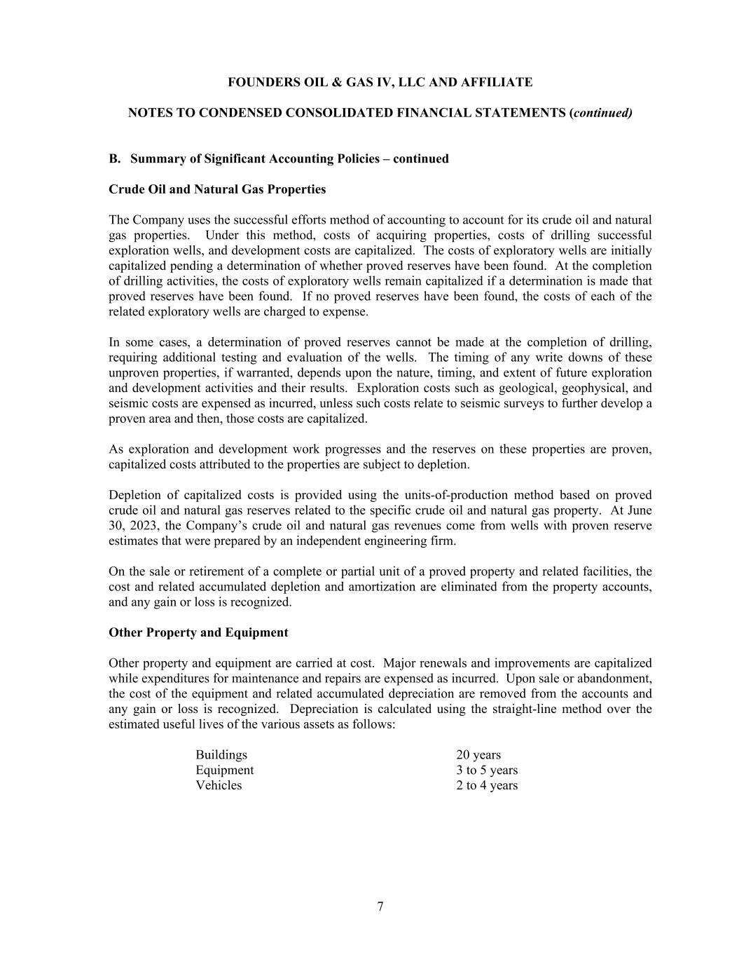 FOUNDERS OIL & GAS IV, LLC AND AFFILIATE NOTES TO CONDENSED CONSOLIDATED FINANCIAL STATEMENTS (continued) 7 B. Summary of Significant Accounting Policies – continued Crude Oil and Natural Gas Properties The Company uses the successful efforts method of accounting to account for its crude oil and natural gas properties. Under this method, costs of acquiring properties, costs of drilling successful exploration wells, and development costs are capitalized. The costs of exploratory wells are initially capitalized pending a determination of whether proved reserves have been found. At the completion of drilling activities, the costs of exploratory wells remain capitalized if a determination is made that proved reserves have been found. If no proved reserves have been found, the costs of each of the related exploratory wells are charged to expense. In some cases, a determination of proved reserves cannot be made at the completion of drilling, requiring additional testing and evaluation of the wells. The timing of any write downs of these unproven properties, if warranted, depends upon the nature, timing, and extent of future exploration and development activities and their results. Exploration costs such as geological, geophysical, and seismic costs are expensed as incurred, unless such costs relate to seismic surveys to further develop a proven area and then, those costs are capitalized. As exploration and development work progresses and the reserves on these properties are proven, capitalized costs attributed to the properties are subject to depletion. Depletion of capitalized costs is provided using the units-of-production method based on proved crude oil and natural gas reserves related to the specific crude oil and natural gas property. At June 30, 2023, the Company’s crude oil and natural gas revenues come from wells with proven reserve estimates that were prepared by an independent engineering firm. On the sale or retirement of a complete or partial unit of a proved property and related facilities, the cost and related accumulated depletion and amortization are eliminated from the property accounts, and any gain or loss is recognized. Other Property and Equipment Other property and equipment are carried at cost. Major renewals and improvements are capitalized while expenditures for maintenance and repairs are expensed as incurred. Upon sale or abandonment, the cost of the equipment and related accumulated depreciation are removed from the accounts and any gain or loss is recognized. Depreciation is calculated using the straight-line method over the estimated useful lives of the various assets as follows: Buildings 20 years Equipment 3 to 5 years Vehicles 2 to 4 years