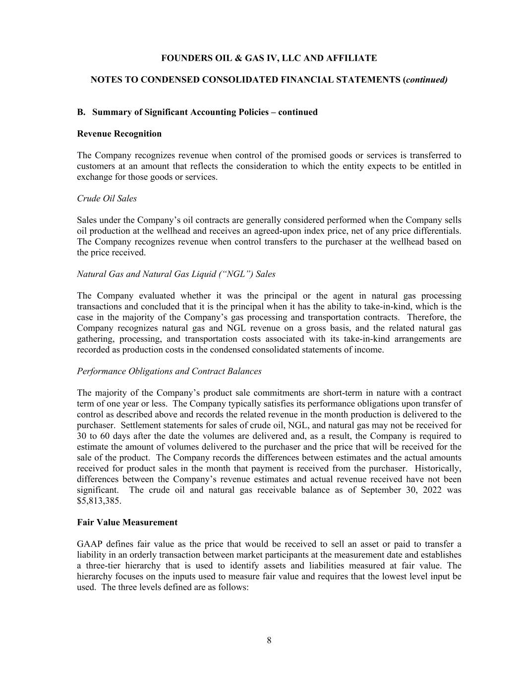 FOUNDERS OIL & GAS IV, LLC AND AFFILIATE NOTES TO CONDENSED CONSOLIDATED FINANCIAL STATEMENTS (continued) 8 B. Summary of Significant Accounting Policies – continued Revenue Recognition The Company recognizes revenue when control of the promised goods or services is transferred to customers at an amount that reflects the consideration to which the entity expects to be entitled in exchange for those goods or services. Crude Oil Sales Sales under the Company’s oil contracts are generally considered performed when the Company sells oil production at the wellhead and receives an agreed-upon index price, net of any price differentials. The Company recognizes revenue when control transfers to the purchaser at the wellhead based on the price received. Natural Gas and Natural Gas Liquid (“NGL”) Sales The Company evaluated whether it was the principal or the agent in natural gas processing transactions and concluded that it is the principal when it has the ability to take-in-kind, which is the case in the majority of the Company’s gas processing and transportation contracts. Therefore, the Company recognizes natural gas and NGL revenue on a gross basis, and the related natural gas gathering, processing, and transportation costs associated with its take-in-kind arrangements are recorded as production costs in the condensed consolidated statements of income. Performance Obligations and Contract Balances The majority of the Company’s product sale commitments are short-term in nature with a contract term of one year or less. The Company typically satisfies its performance obligations upon transfer of control as described above and records the related revenue in the month production is delivered to the purchaser. Settlement statements for sales of crude oil, NGL, and natural gas may not be received for 30 to 60 days after the date the volumes are delivered and, as a result, the Company is required to estimate the amount of volumes delivered to the purchaser and the price that will be received for the sale of the product. The Company records the differences between estimates and the actual amounts received for product sales in the month that payment is received from the purchaser. Historically, differences between the Company’s revenue estimates and actual revenue received have not been significant. The crude oil and natural gas receivable balance as of September 30, 2022 was $5,813,385. Fair Value Measurement GAAP defines fair value as the price that would be received to sell an asset or paid to transfer a liability in an orderly transaction between market participants at the measurement date and establishes a three-tier hierarchy that is used to identify assets and liabilities measured at fair value. The hierarchy focuses on the inputs used to measure fair value and requires that the lowest level input be used. The three levels defined are as follows: