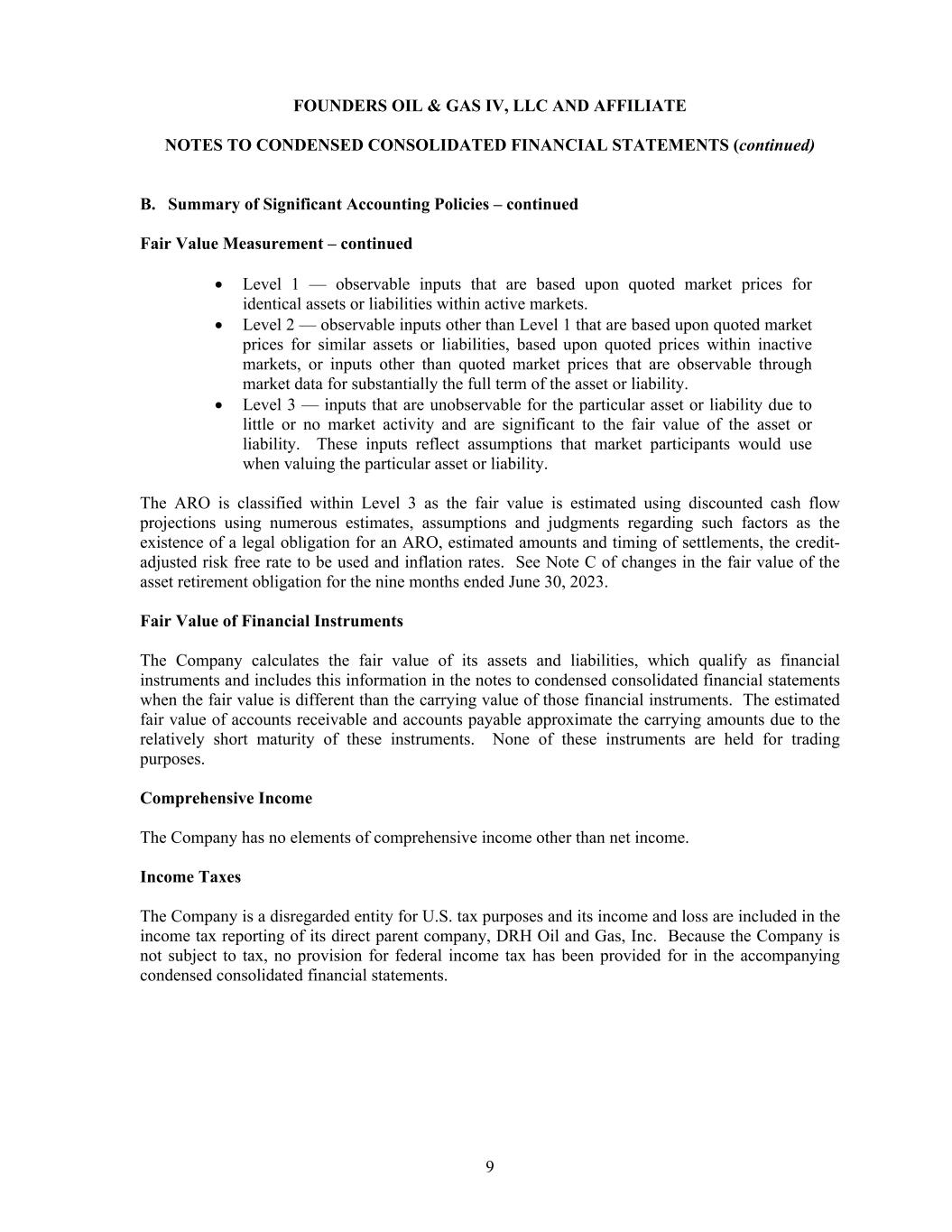 FOUNDERS OIL & GAS IV, LLC AND AFFILIATE NOTES TO CONDENSED CONSOLIDATED FINANCIAL STATEMENTS (continued) 9 B. Summary of Significant Accounting Policies – continued Fair Value Measurement – continued Level 1 — observable inputs that are based upon quoted market prices for identical assets or liabilities within active markets. Level 2 — observable inputs other than Level 1 that are based upon quoted market prices for similar assets or liabilities, based upon quoted prices within inactive markets, or inputs other than quoted market prices that are observable through market data for substantially the full term of the asset or liability. Level 3 — inputs that are unobservable for the particular asset or liability due to little or no market activity and are significant to the fair value of the asset or liability. These inputs reflect assumptions that market participants would use when valuing the particular asset or liability. The ARO is classified within Level 3 as the fair value is estimated using discounted cash flow projections using numerous estimates, assumptions and judgments regarding such factors as the existence of a legal obligation for an ARO, estimated amounts and timing of settlements, the credit- adjusted risk free rate to be used and inflation rates. See Note C of changes in the fair value of the asset retirement obligation for the nine months ended June 30, 2023. Fair Value of Financial Instruments The Company calculates the fair value of its assets and liabilities, which qualify as financial instruments and includes this information in the notes to condensed consolidated financial statements when the fair value is different than the carrying value of those financial instruments. The estimated fair value of accounts receivable and accounts payable approximate the carrying amounts due to the relatively short maturity of these instruments. None of these instruments are held for trading purposes. Comprehensive Income The Company has no elements of comprehensive income other than net income. Income Taxes The Company is a disregarded entity for U.S. tax purposes and its income and loss are included in the income tax reporting of its direct parent company, DRH Oil and Gas, Inc. Because the Company is not subject to tax, no provision for federal income tax has been provided for in the accompanying condensed consolidated financial statements.