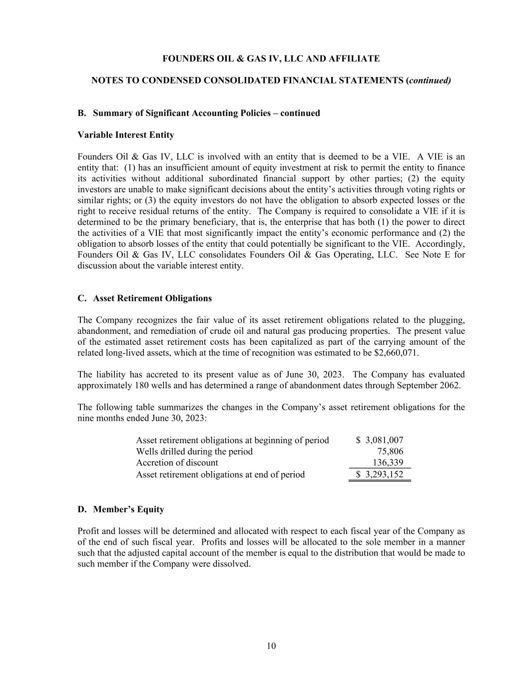 FOUNDERS OIL & GAS IV, LLC AND AFFILIATE NOTES TO CONDENSED CONSOLIDATED FINANCIAL STATEMENTS (continued) 10 B. Summary of Significant Accounting Policies – continued Variable Interest Entity Founders Oil & Gas IV, LLC is involved with an entity that is deemed to be a VIE. A VIE is an entity that: (1) has an insufficient amount of equity investment at risk to permit the entity to finance its activities without additional subordinated financial support by other parties; (2) the equity investors are unable to make significant decisions about the entity’s activities through voting rights or similar rights; or (3) the equity investors do not have the obligation to absorb expected losses or the right to receive residual returns of the entity. The Company is required to consolidate a VIE if it is determined to be the primary beneficiary, that is, the enterprise that has both (1) the power to direct the activities of a VIE that most significantly impact the entity’s economic performance and (2) the obligation to absorb losses of the entity that could potentially be significant to the VIE. Accordingly, Founders Oil & Gas IV, LLC consolidates Founders Oil & Gas Operating, LLC. See Note E for discussion about the variable interest entity. C. Asset Retirement Obligations The Company recognizes the fair value of its asset retirement obligations related to the plugging, abandonment, and remediation of crude oil and natural gas producing properties. The present value of the estimated asset retirement costs has been capitalized as part of the carrying amount of the related long-lived assets, which at the time of recognition was estimated to be $2,660,071. The liability has accreted to its present value as of June 30, 2023. The Company has evaluated approximately 180 wells and has determined a range of abandonment dates through September 2062. The following table summarizes the changes in the Company’s asset retirement obligations for the nine months ended June 30, 2023: Asset retirement obligations at beginning of period $ 3,081,007 Wells drilled during the period 75,806 Accretion of discount 136,339 Asset retirement obligations at end of period $ 3,293,152 D. Member’s Equity Profit and losses will be determined and allocated with respect to each fiscal year of the Company as of the end of such fiscal year. Profits and losses will be allocated to the sole member in a manner such that the adjusted capital account of the member is equal to the distribution that would be made to such member if the Company were dissolved.