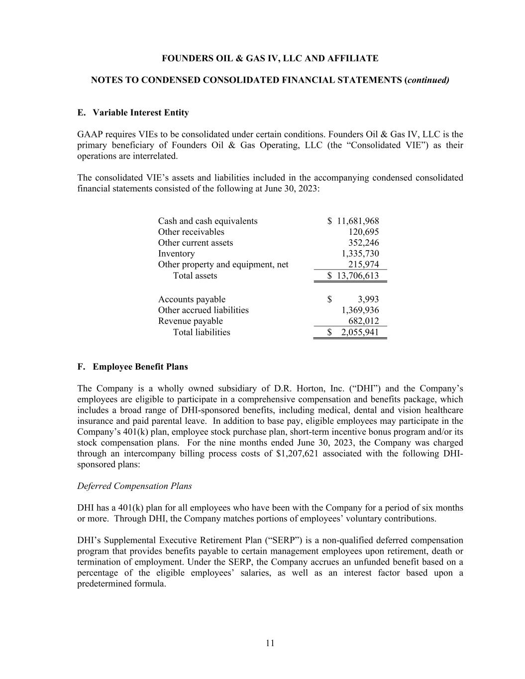 FOUNDERS OIL & GAS IV, LLC AND AFFILIATE NOTES TO CONDENSED CONSOLIDATED FINANCIAL STATEMENTS (continued) 11 E. Variable Interest Entity GAAP requires VIEs to be consolidated under certain conditions. Founders Oil & Gas IV, LLC is the primary beneficiary of Founders Oil & Gas Operating, LLC (the “Consolidated VIE”) as their operations are interrelated. The consolidated VIE’s assets and liabilities included in the accompanying condensed consolidated financial statements consisted of the following at June 30, 2023: Cash and cash equivalents $ 11,681,968 Other receivables 120,695 Other current assets 352,246 Inventory 1,335,730 Other property and equipment, net 215,974 Total assets $ 13,706,613 Accounts payable $ 3,993 Other accrued liabilities 1,369,936 Revenue payable 682,012 Total liabilities $ 2,055,941 F. Employee Benefit Plans The Company is a wholly owned subsidiary of D.R. Horton, Inc. (“DHI”) and the Company’s employees are eligible to participate in a comprehensive compensation and benefits package, which includes a broad range of DHI-sponsored benefits, including medical, dental and vision healthcare insurance and paid parental leave. In addition to base pay, eligible employees may participate in the Company’s 401(k) plan, employee stock purchase plan, short-term incentive bonus program and/or its stock compensation plans. For the nine months ended June 30, 2023, the Company was charged through an intercompany billing process costs of $1,207,621 associated with the following DHI- sponsored plans: Deferred Compensation Plans DHI has a 401(k) plan for all employees who have been with the Company for a period of six months or more. Through DHI, the Company matches portions of employees’ voluntary contributions. DHI’s Supplemental Executive Retirement Plan (“SERP”) is a non-qualified deferred compensation program that provides benefits payable to certain management employees upon retirement, death or termination of employment. Under the SERP, the Company accrues an unfunded benefit based on a percentage of the eligible employees’ salaries, as well as an interest factor based upon a predetermined formula.