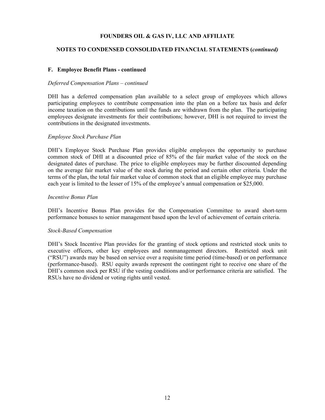 FOUNDERS OIL & GAS IV, LLC AND AFFILIATE NOTES TO CONDENSED CONSOLIDATED FINANCIAL STATEMENTS (continued) 12 F. Employee Benefit Plans - continued Deferred Compensation Plans – continued DHI has a deferred compensation plan available to a select group of employees which allows participating employees to contribute compensation into the plan on a before tax basis and defer income taxation on the contributions until the funds are withdrawn from the plan. The participating employees designate investments for their contributions; however, DHI is not required to invest the contributions in the designated investments. Employee Stock Purchase Plan DHI’s Employee Stock Purchase Plan provides eligible employees the opportunity to purchase common stock of DHI at a discounted price of 85% of the fair market value of the stock on the designated dates of purchase. The price to eligible employees may be further discounted depending on the average fair market value of the stock during the period and certain other criteria. Under the terms of the plan, the total fair market value of common stock that an eligible employee may purchase each year is limited to the lesser of 15% of the employee’s annual compensation or $25,000. Incentive Bonus Plan DHI’s Incentive Bonus Plan provides for the Compensation Committee to award short-term performance bonuses to senior management based upon the level of achievement of certain criteria. Stock-Based Compensation DHI’s Stock Incentive Plan provides for the granting of stock options and restricted stock units to executive officers, other key employees and nonmanagement directors. Restricted stock unit (“RSU”) awards may be based on service over a requisite time period (time-based) or on performance (performance-based). RSU equity awards represent the contingent right to receive one share of the DHI’s common stock per RSU if the vesting conditions and/or performance criteria are satisfied. The RSUs have no dividend or voting rights until vested.