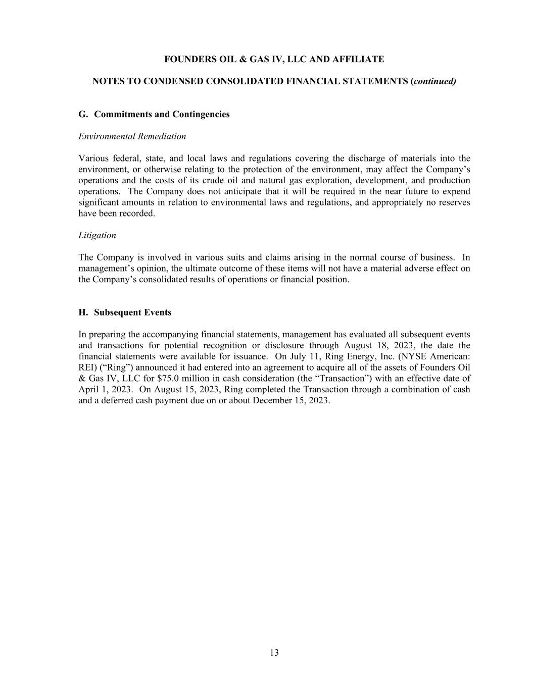 FOUNDERS OIL & GAS IV, LLC AND AFFILIATE NOTES TO CONDENSED CONSOLIDATED FINANCIAL STATEMENTS (continued) 13 G. Commitments and Contingencies Environmental Remediation Various federal, state, and local laws and regulations covering the discharge of materials into the environment, or otherwise relating to the protection of the environment, may affect the Company’s operations and the costs of its crude oil and natural gas exploration, development, and production operations. The Company does not anticipate that it will be required in the near future to expend significant amounts in relation to environmental laws and regulations, and appropriately no reserves have been recorded. Litigation The Company is involved in various suits and claims arising in the normal course of business. In management’s opinion, the ultimate outcome of these items will not have a material adverse effect on the Company’s consolidated results of operations or financial position. H. Subsequent Events In preparing the accompanying financial statements, management has evaluated all subsequent events and transactions for potential recognition or disclosure through August 18, 2023, the date the financial statements were available for issuance. On July 11, Ring Energy, Inc. (NYSE American: REI) (“Ring”) announced it had entered into an agreement to acquire all of the assets of Founders Oil & Gas IV, LLC for $75.0 million in cash consideration (the “Transaction”) with an effective date of April 1, 2023. On August 15, 2023, Ring completed the Transaction through a combination of cash and a deferred cash payment due on or about December 15, 2023.